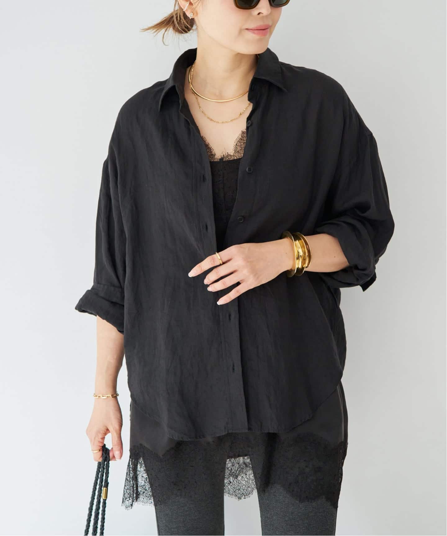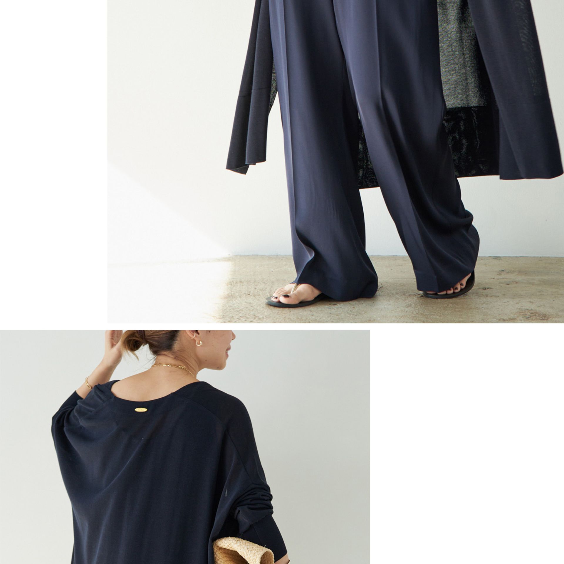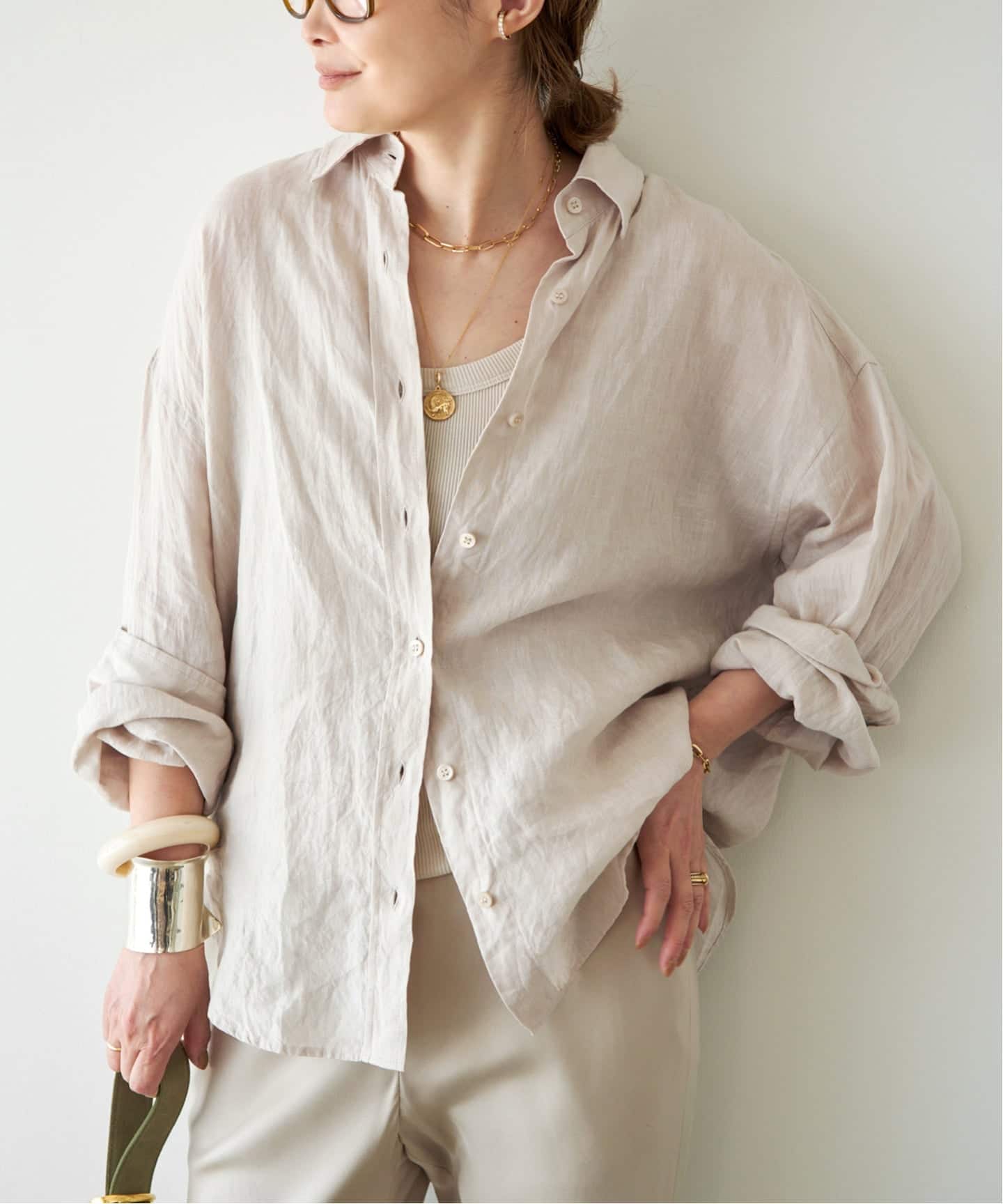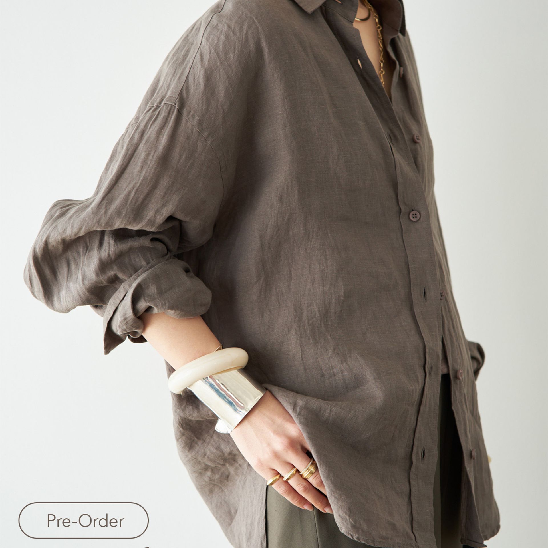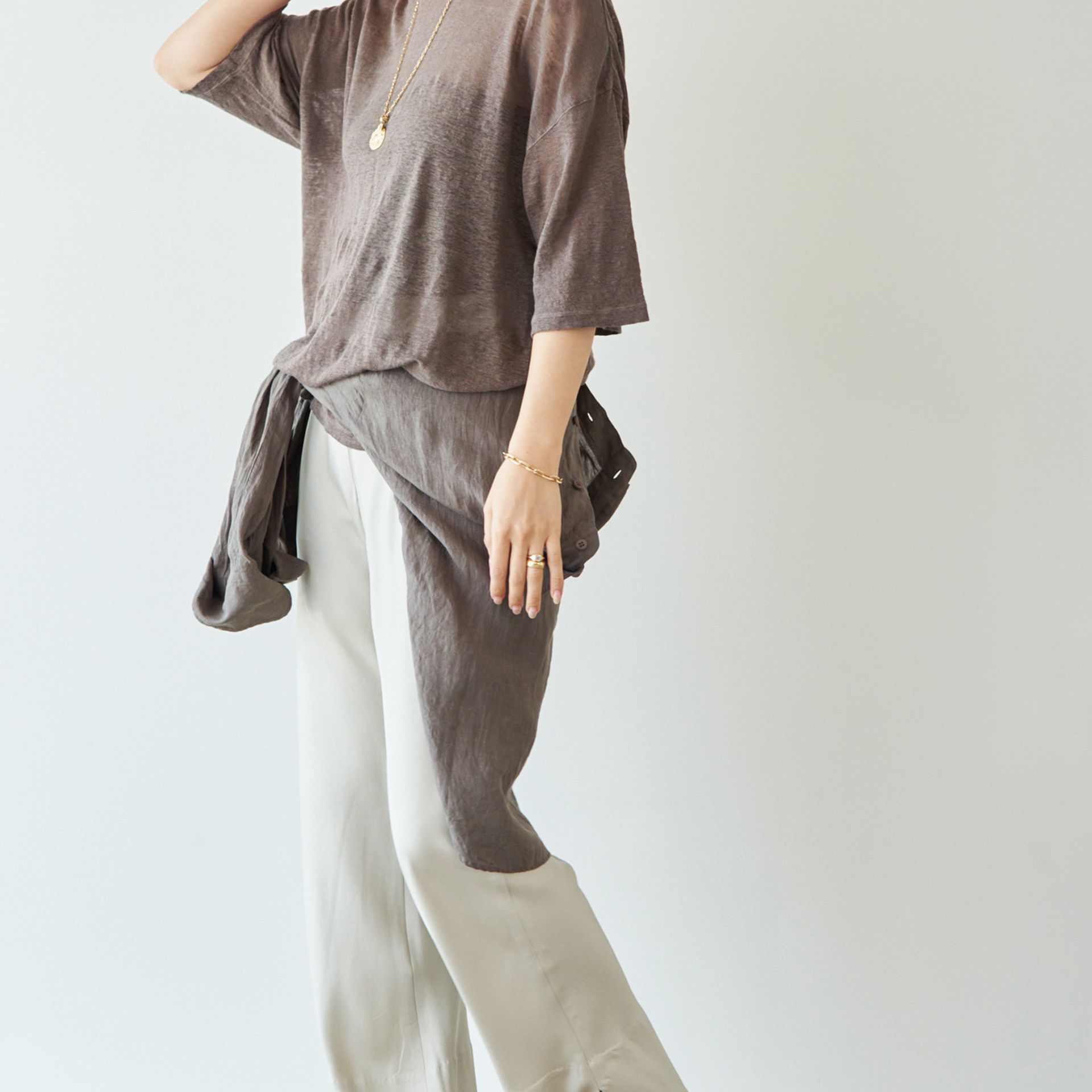 麻特有のドライな清涼感はそのままに、美しい光沢とドレープ感が際立つ、細部にまでこだわりの詰まった品の良い一枚。