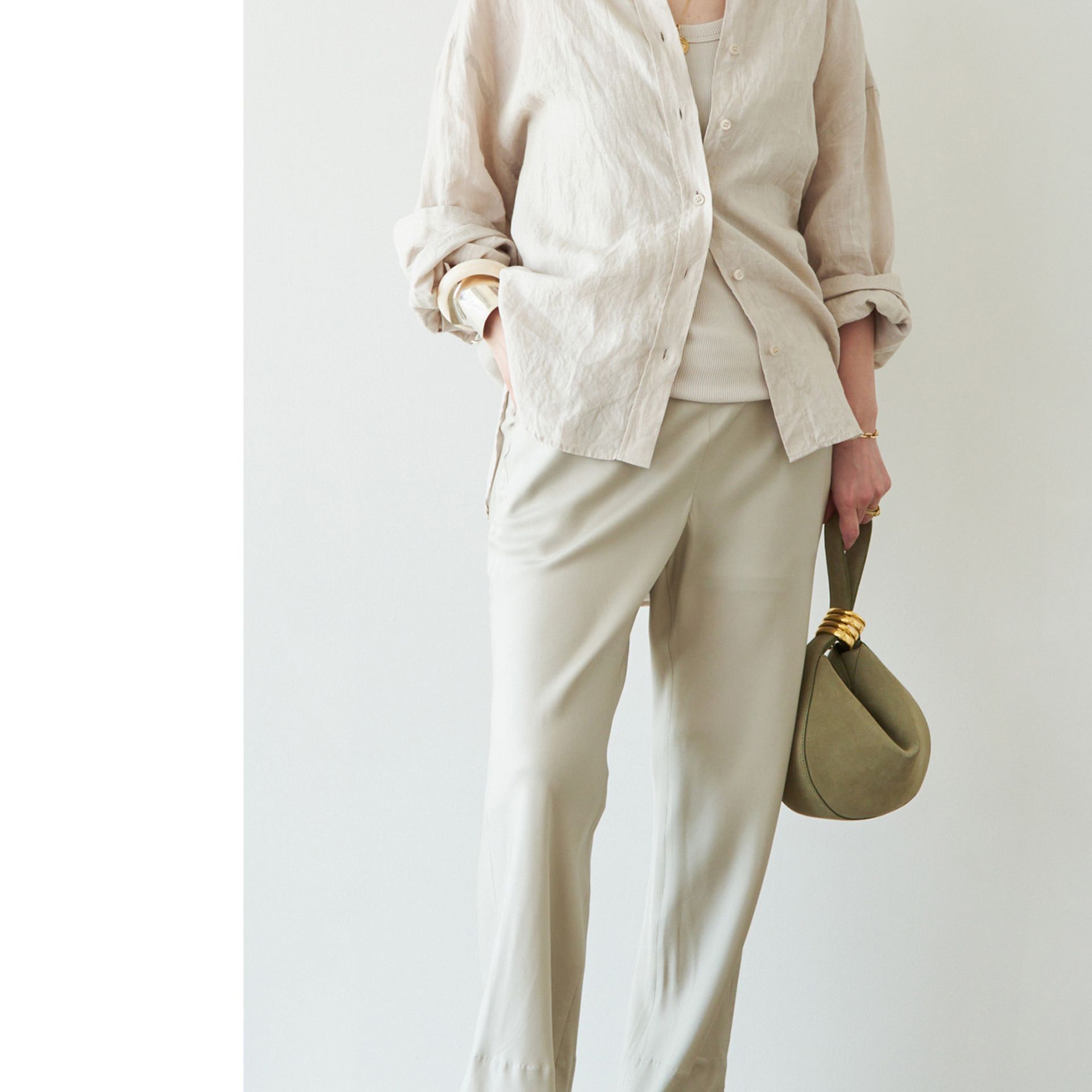 新色のニュアンスカラーにはRASPAILのStandard Silk Pantsを合わせて。