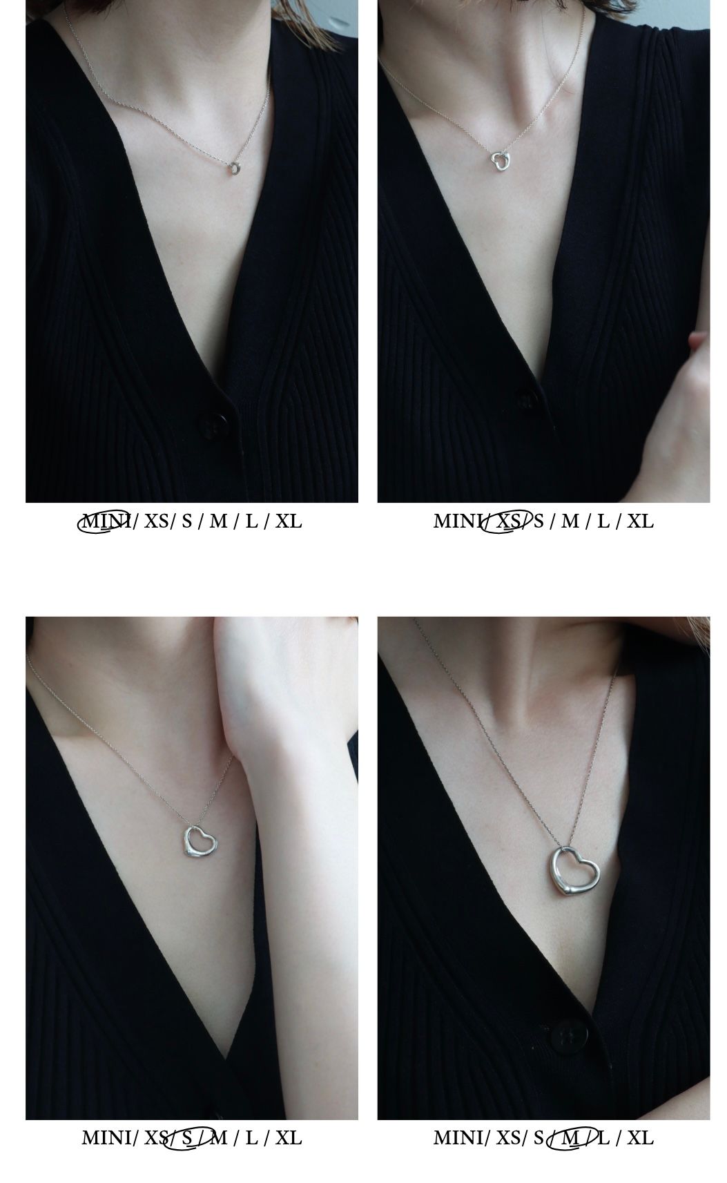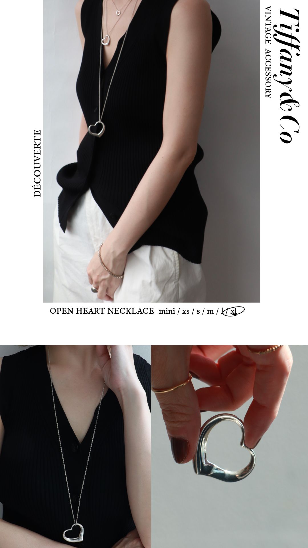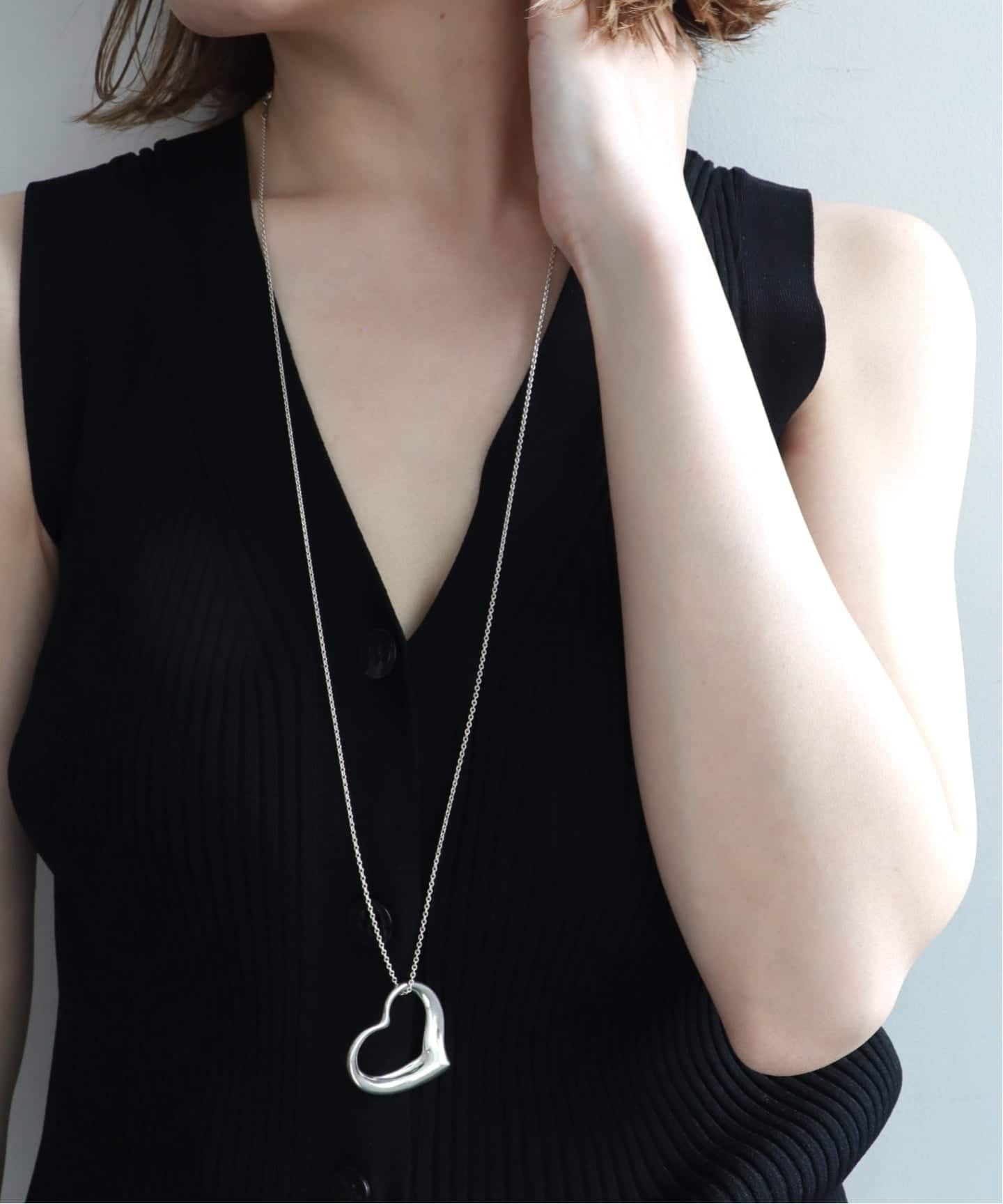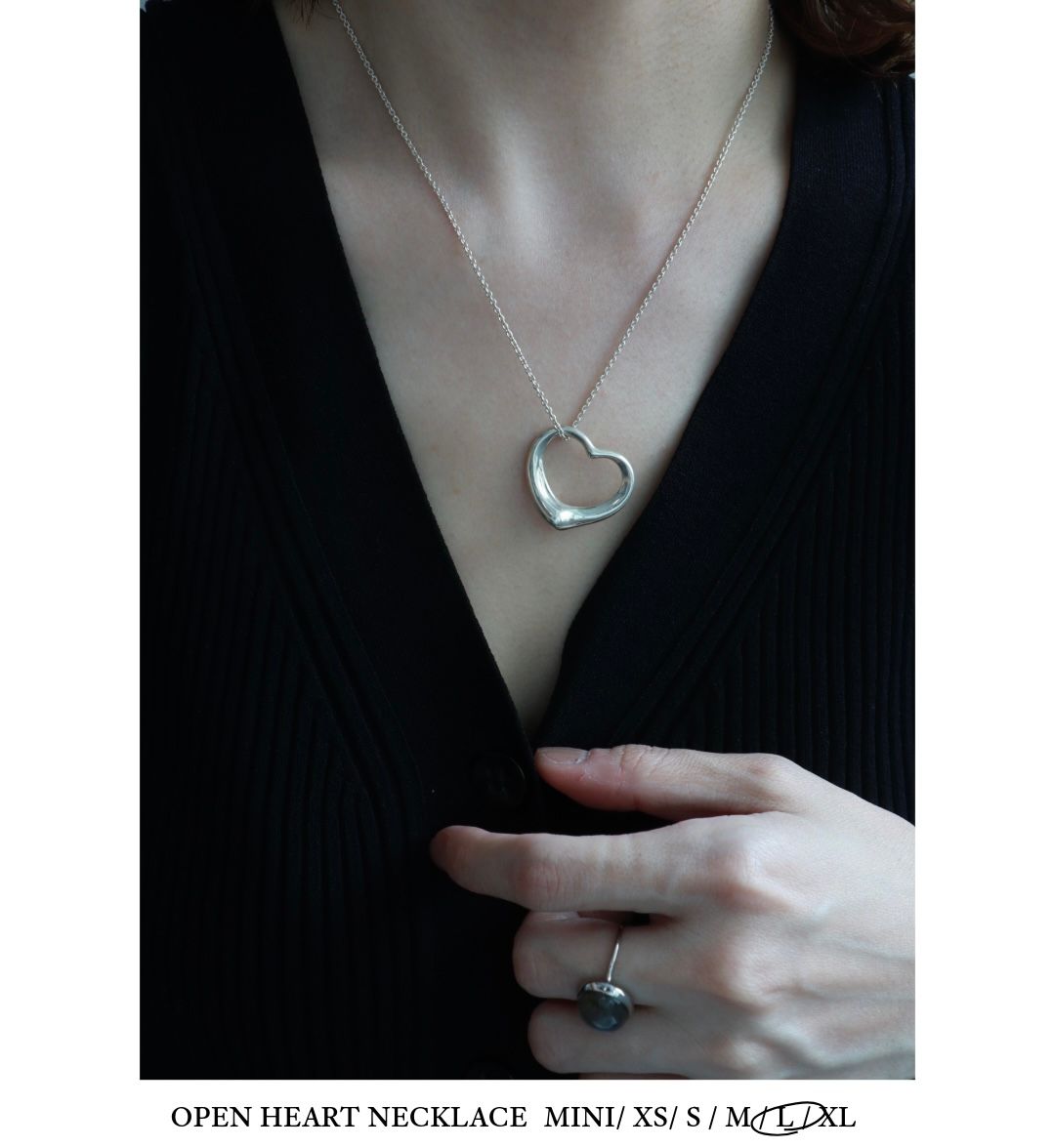視線を集めるLサイズは、デザインそのものを楽めるサイズ。シンプルな装いに明確なポイントをつくり、スタイルにリズムと奥行きをつくってくれるモダンなサイズ。アクセサリーの枠を越えて、スタイリングの一部になるアクセサリー。長さと余白で魅せる、大人のためのオープンハート。
