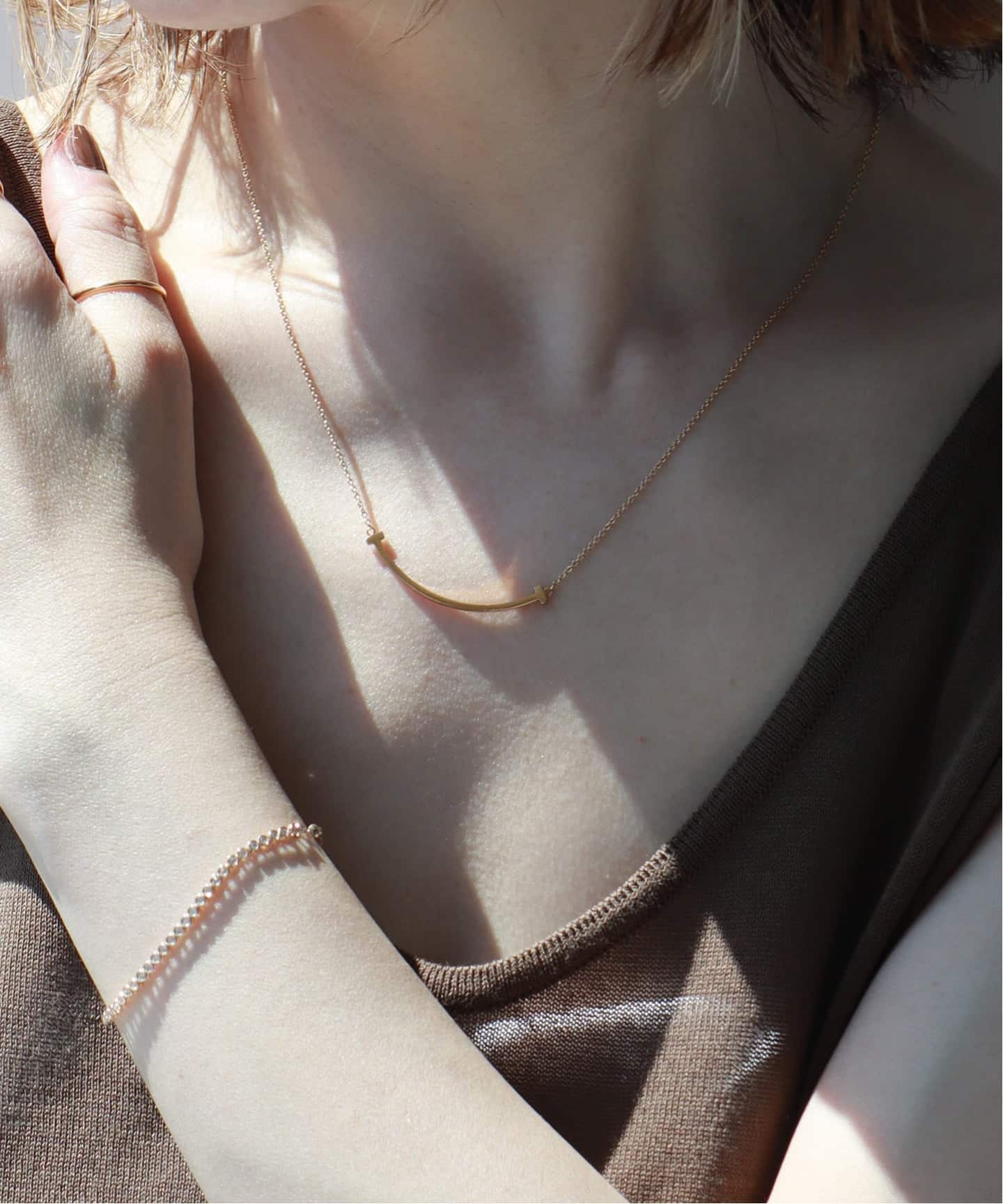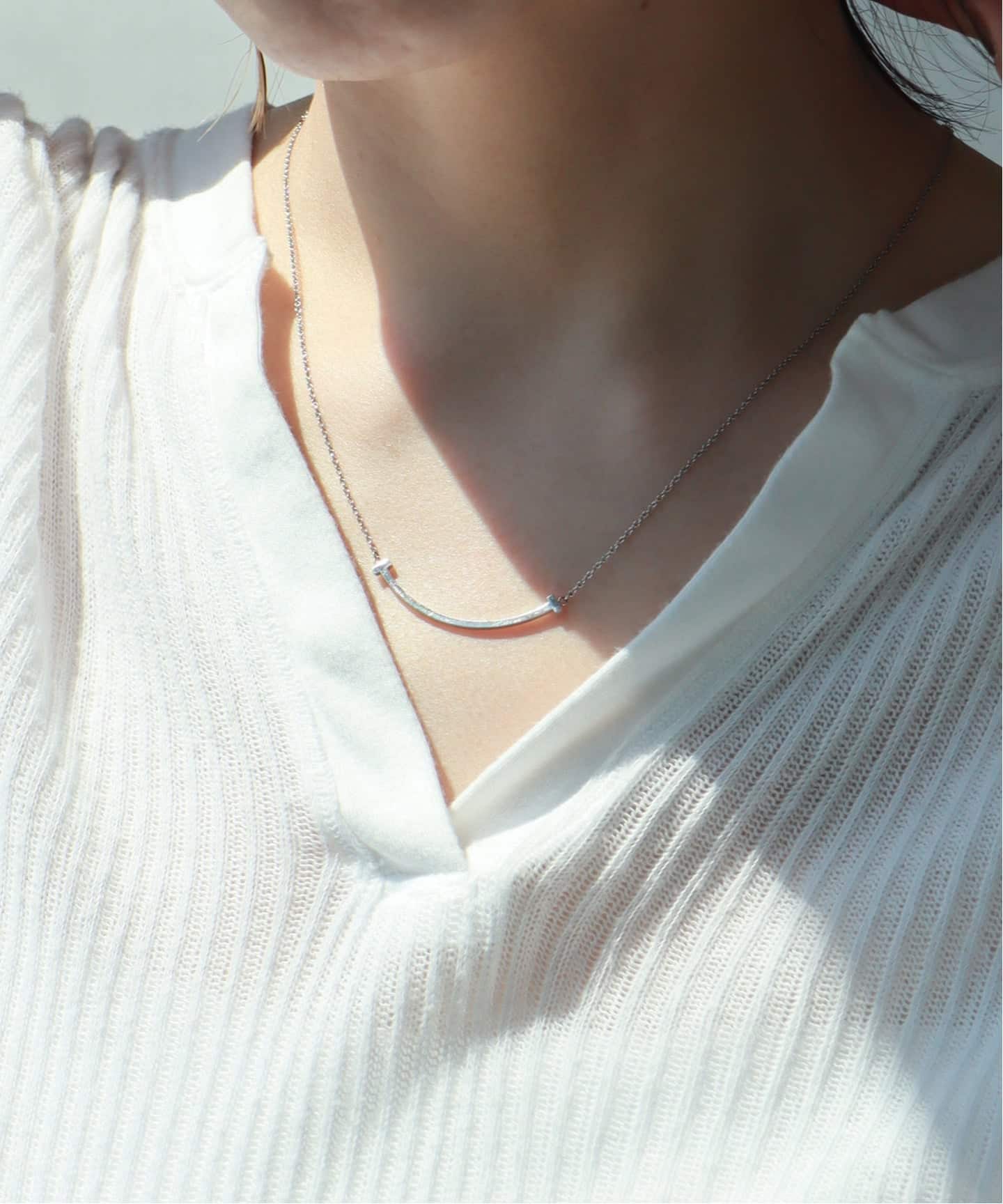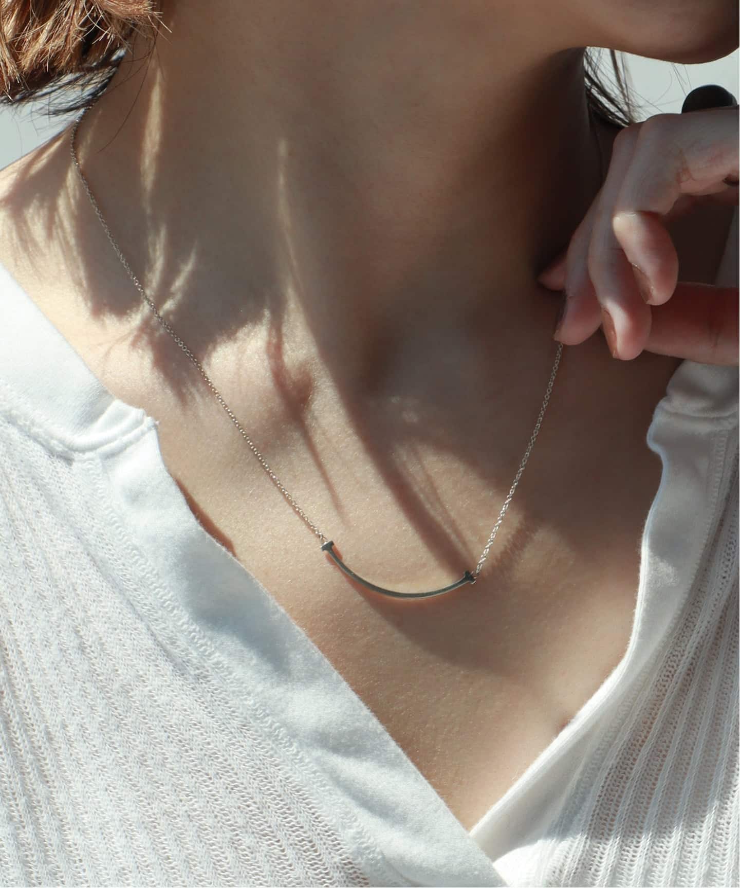 大人が選ぶスマイルのバランス。なめらかなラインがデコルテに沿うことで、夏の光をやさしく受け止め、シンプルな装いに自然な明るさを添えるスモールサイズをピックアップ。シルバーカラーのSmileを一本でさらりとつけることで、そのラインの美しさが引き立つ。