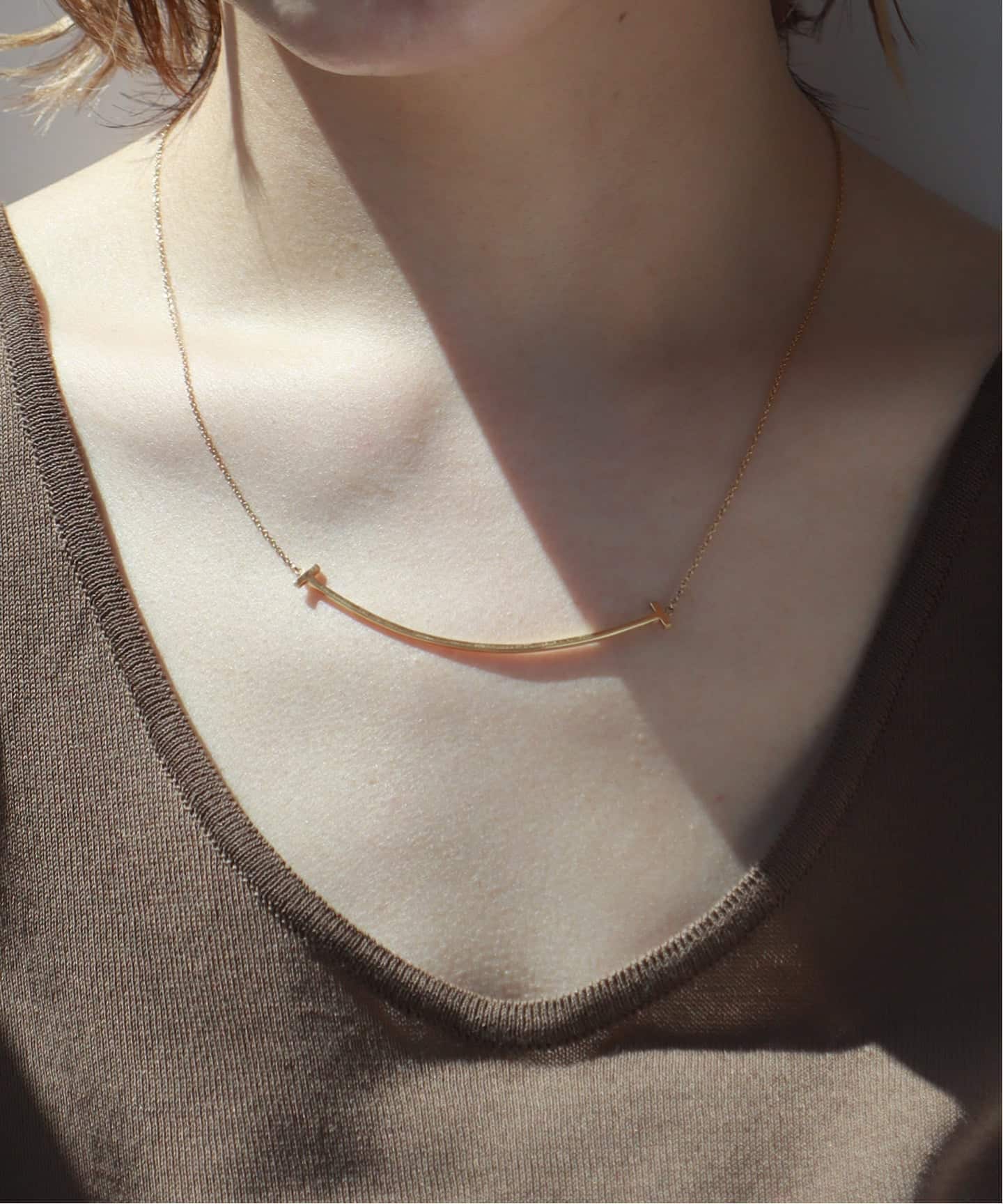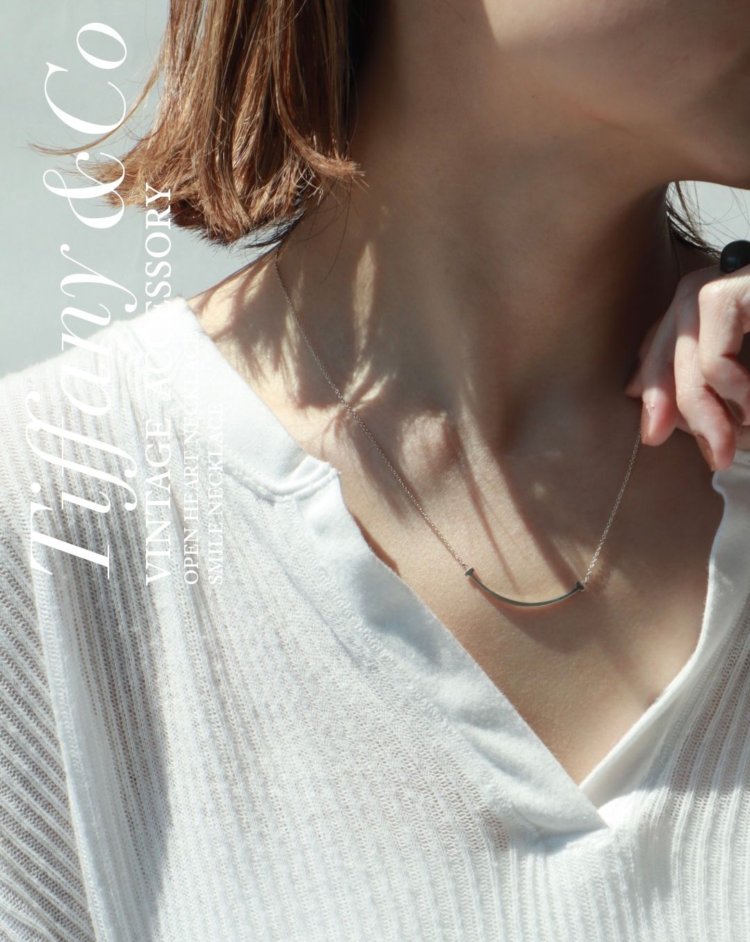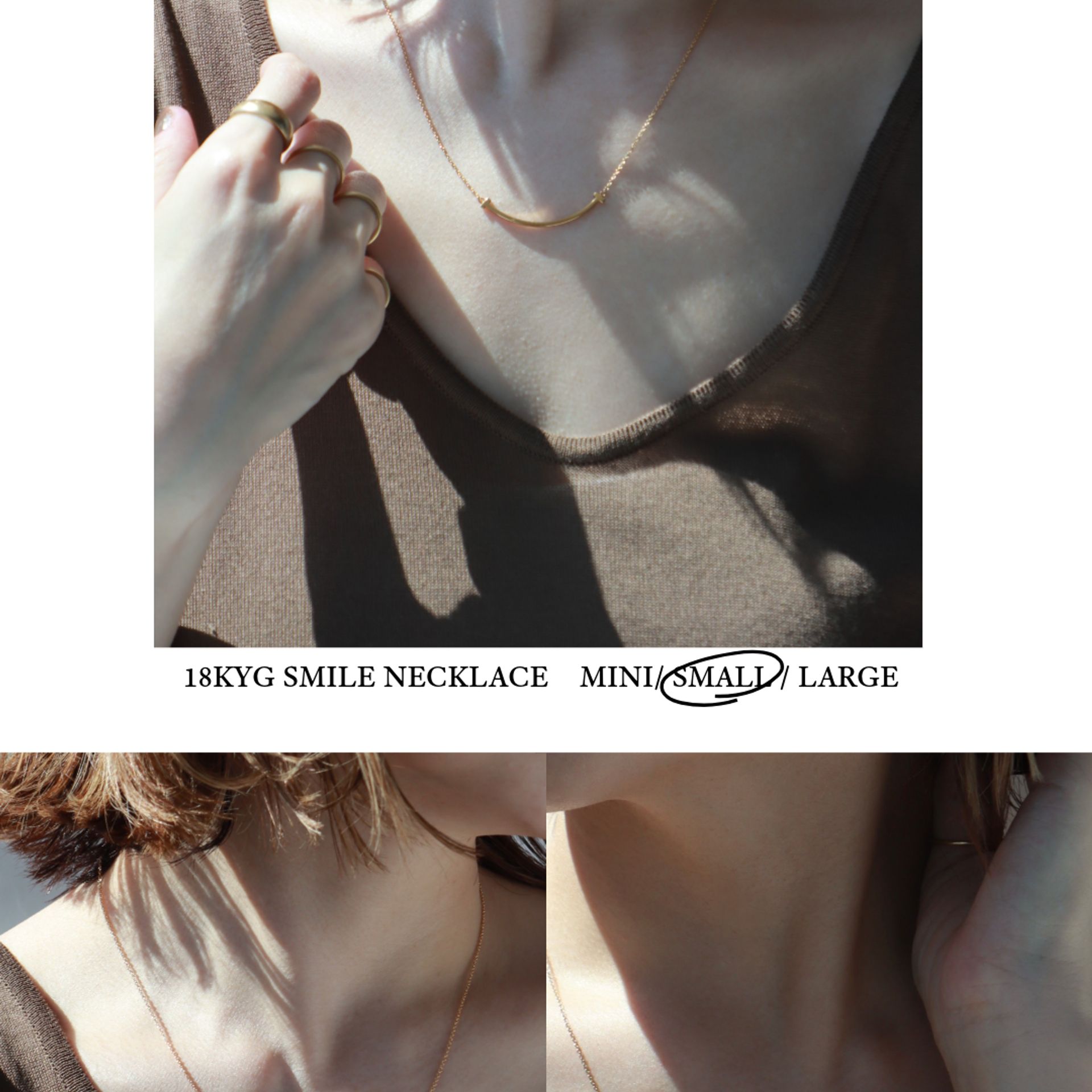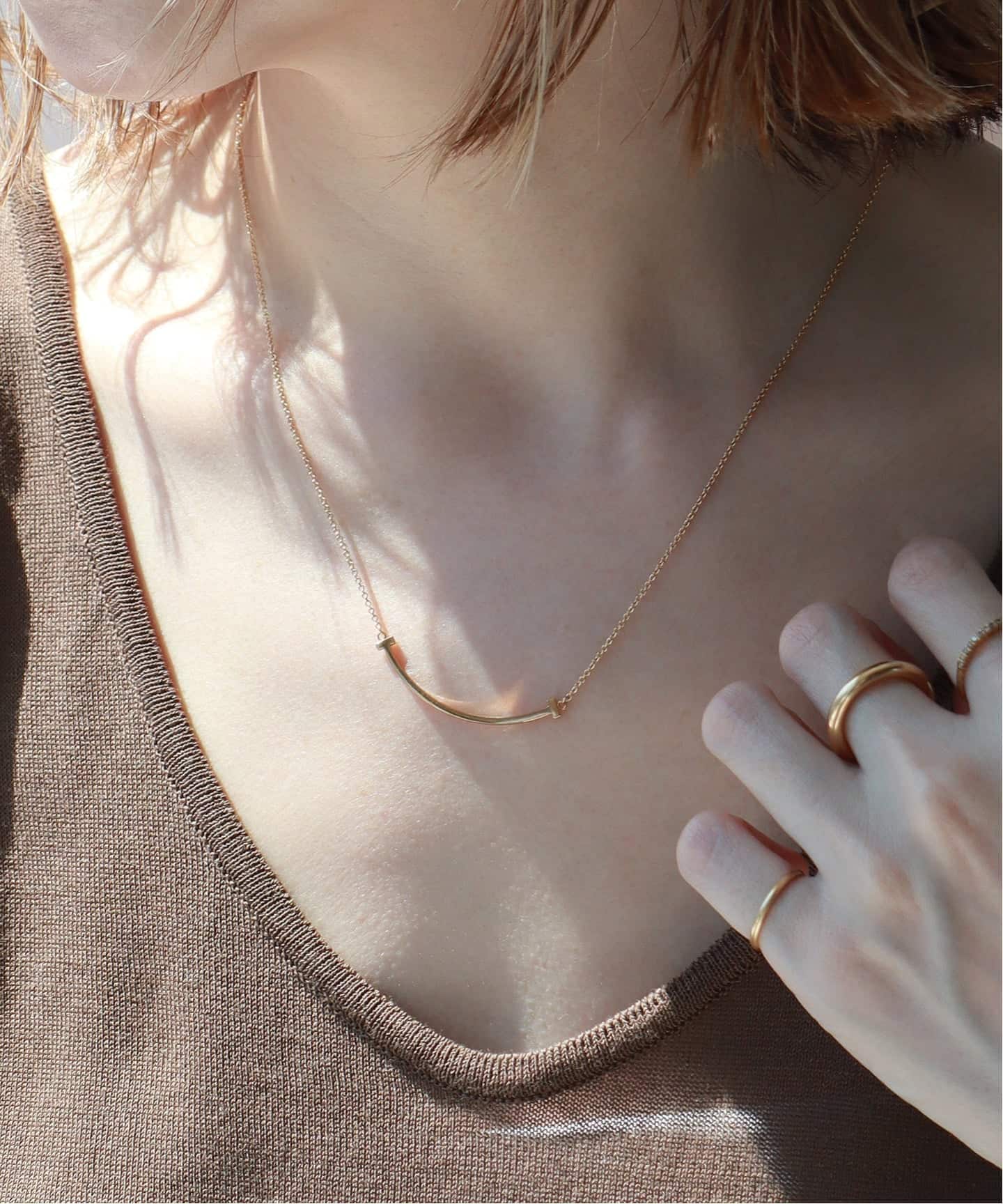 大人が選ぶスマイルのバランス。なめらかなラインがデコルテに沿うことで、夏の光をやさしく受け止め、シンプルな装いに自然な明るさを添えるスモールサイズをピックアップ。シルバーカラーのSmileを一本でさらりとつけることで、そのラインの美しさが引き立つ。