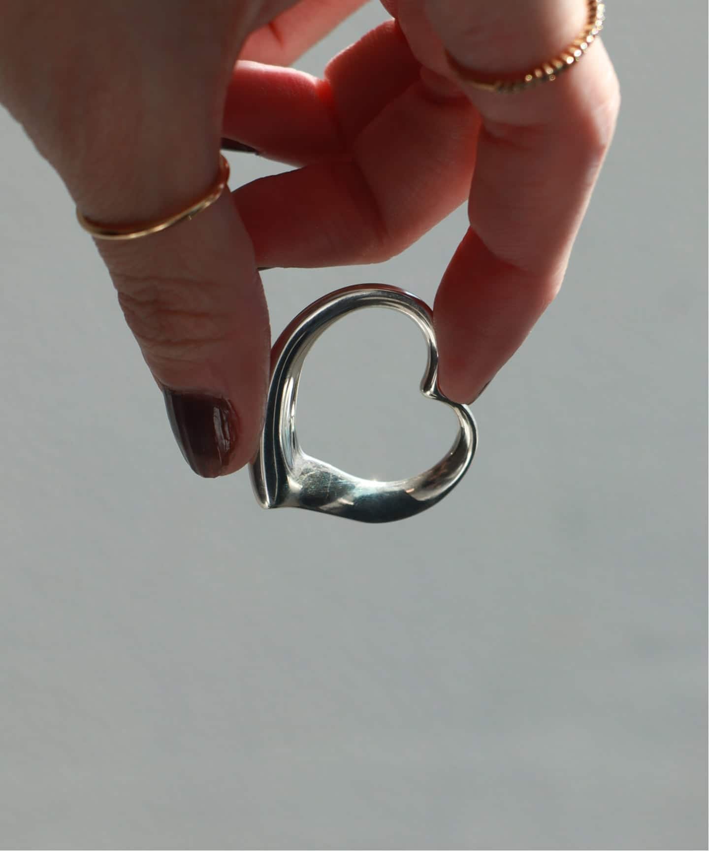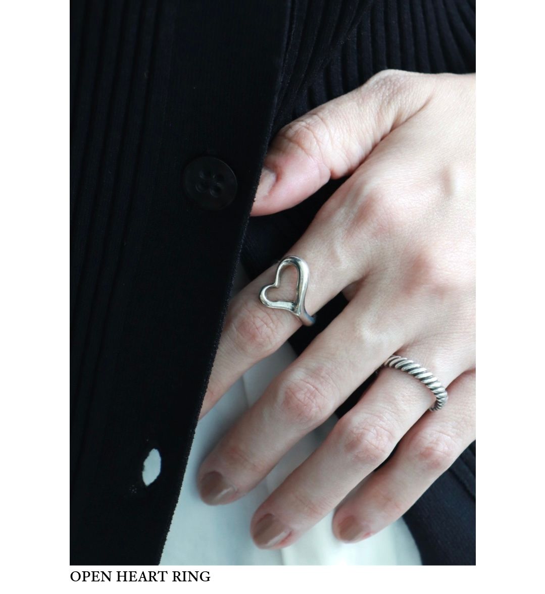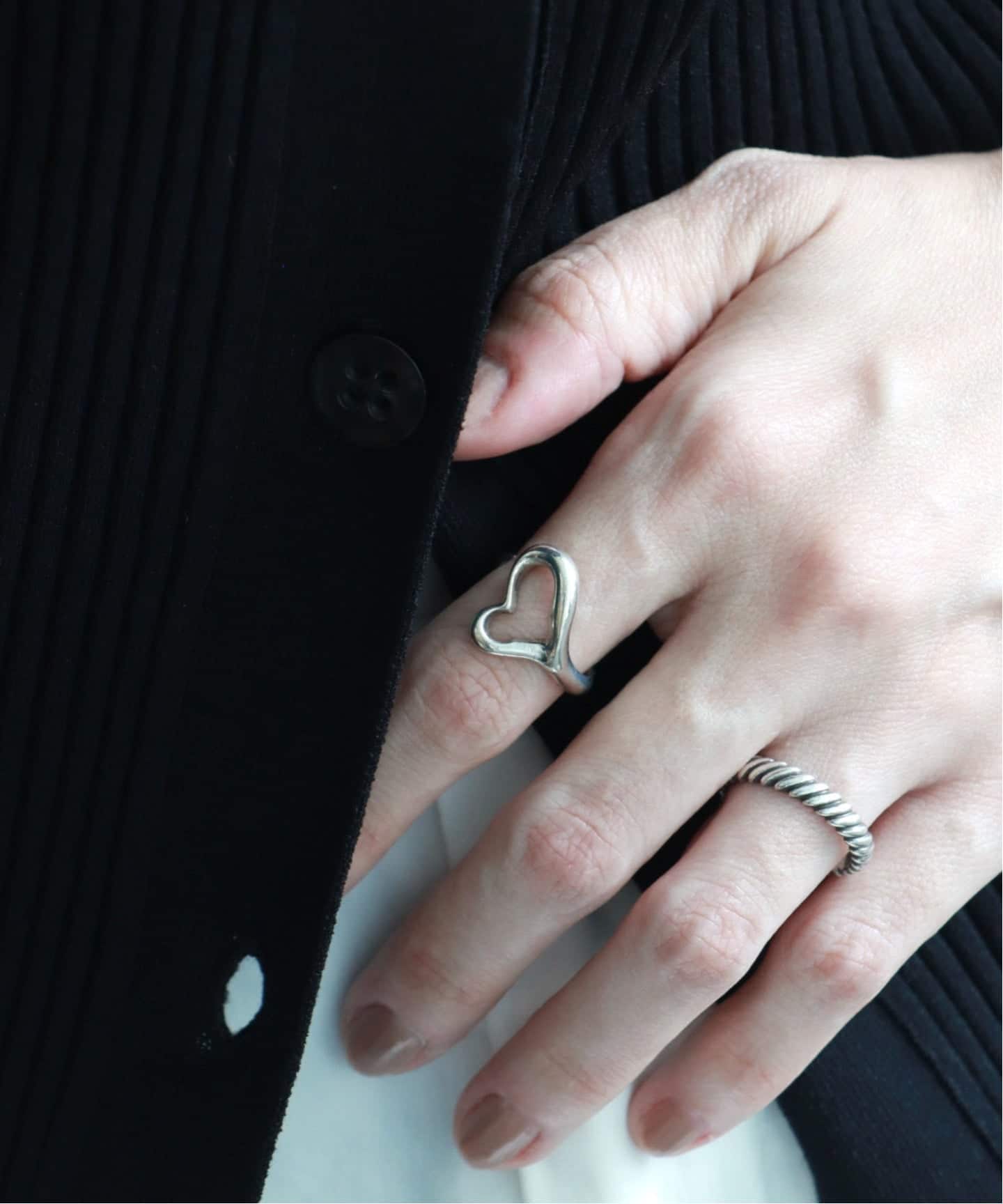 手元に、静かな余白を描くオープンハートのリング。指先に抜けをつくるように効くシルバーが大人の手元を品のあるバランスに整えてくれる。