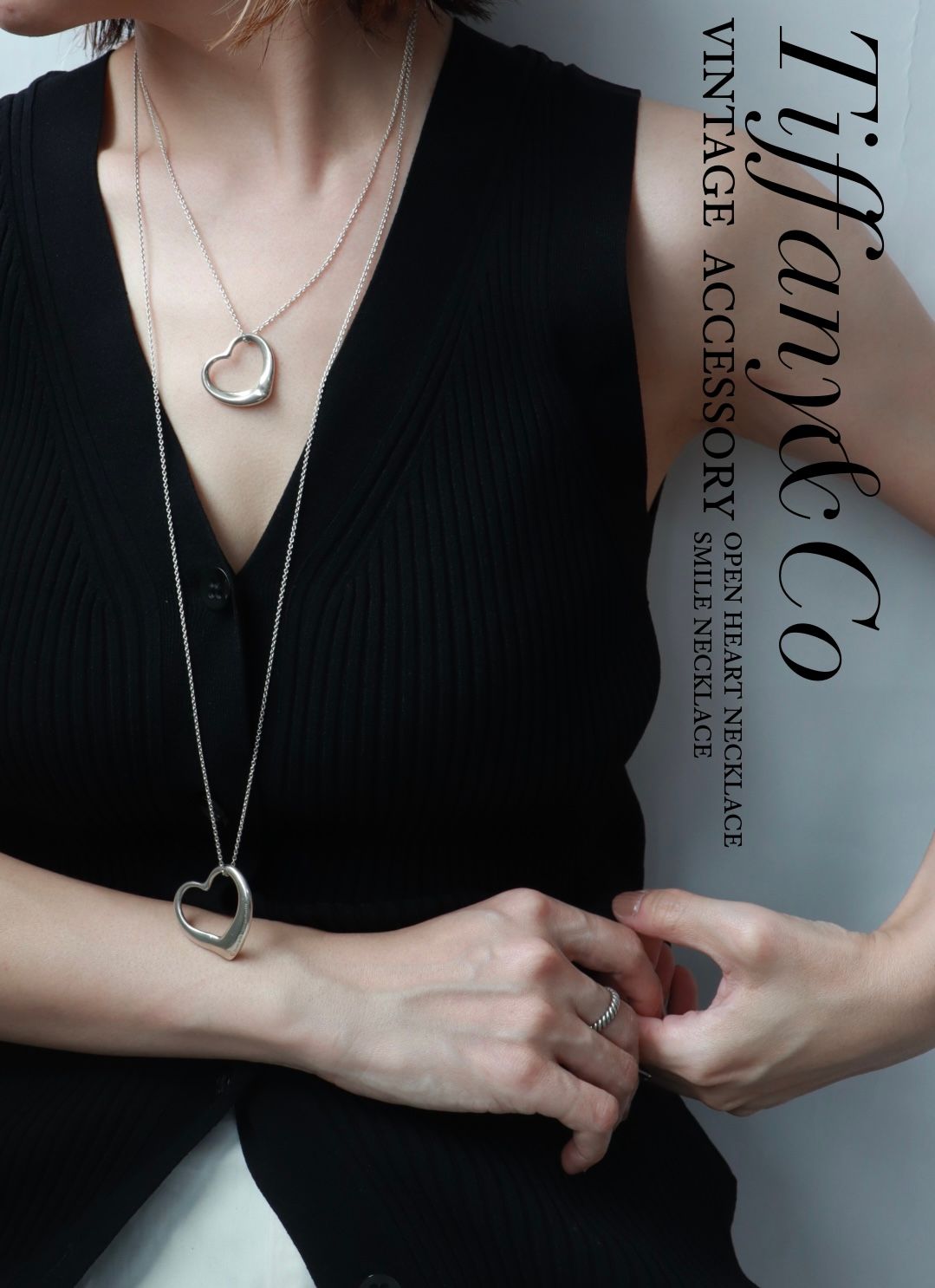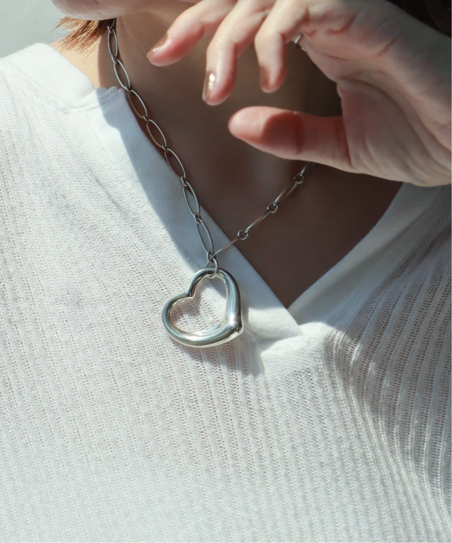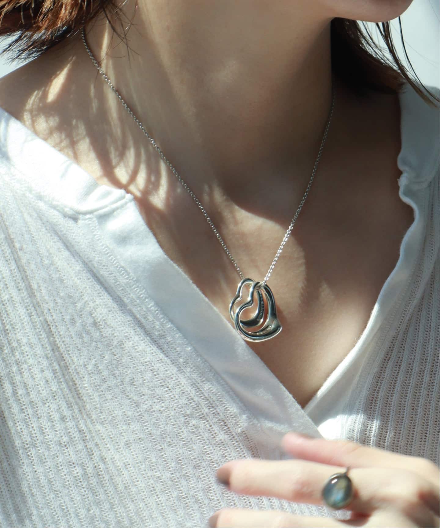 手元に、静かな余白を描くオープンハートのリング。指先に抜けをつくるように効くシルバーが大人の手元を品のあるバランスに整えてくれる。