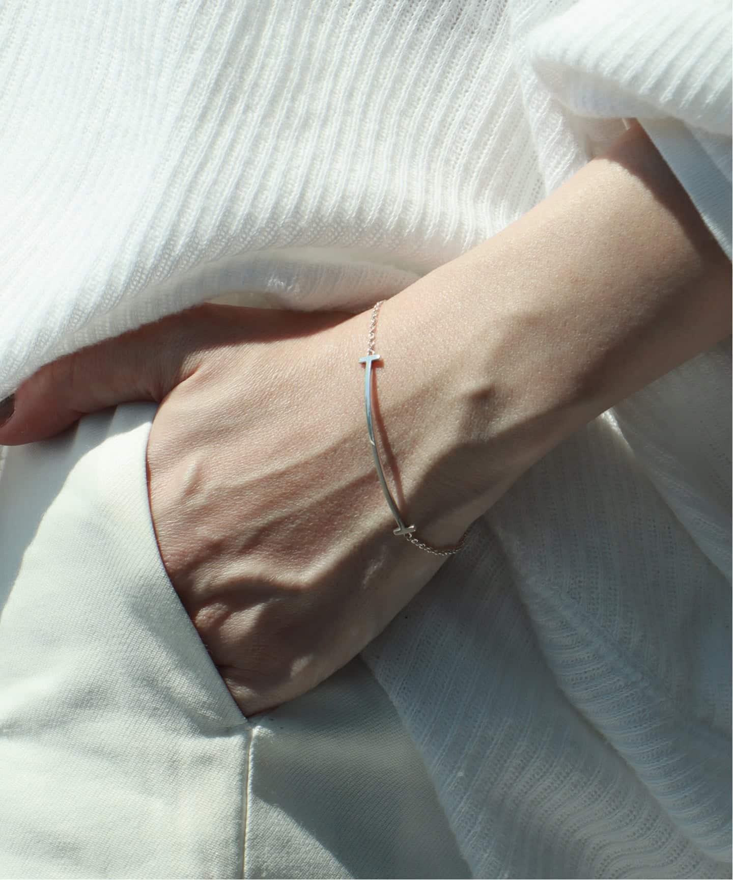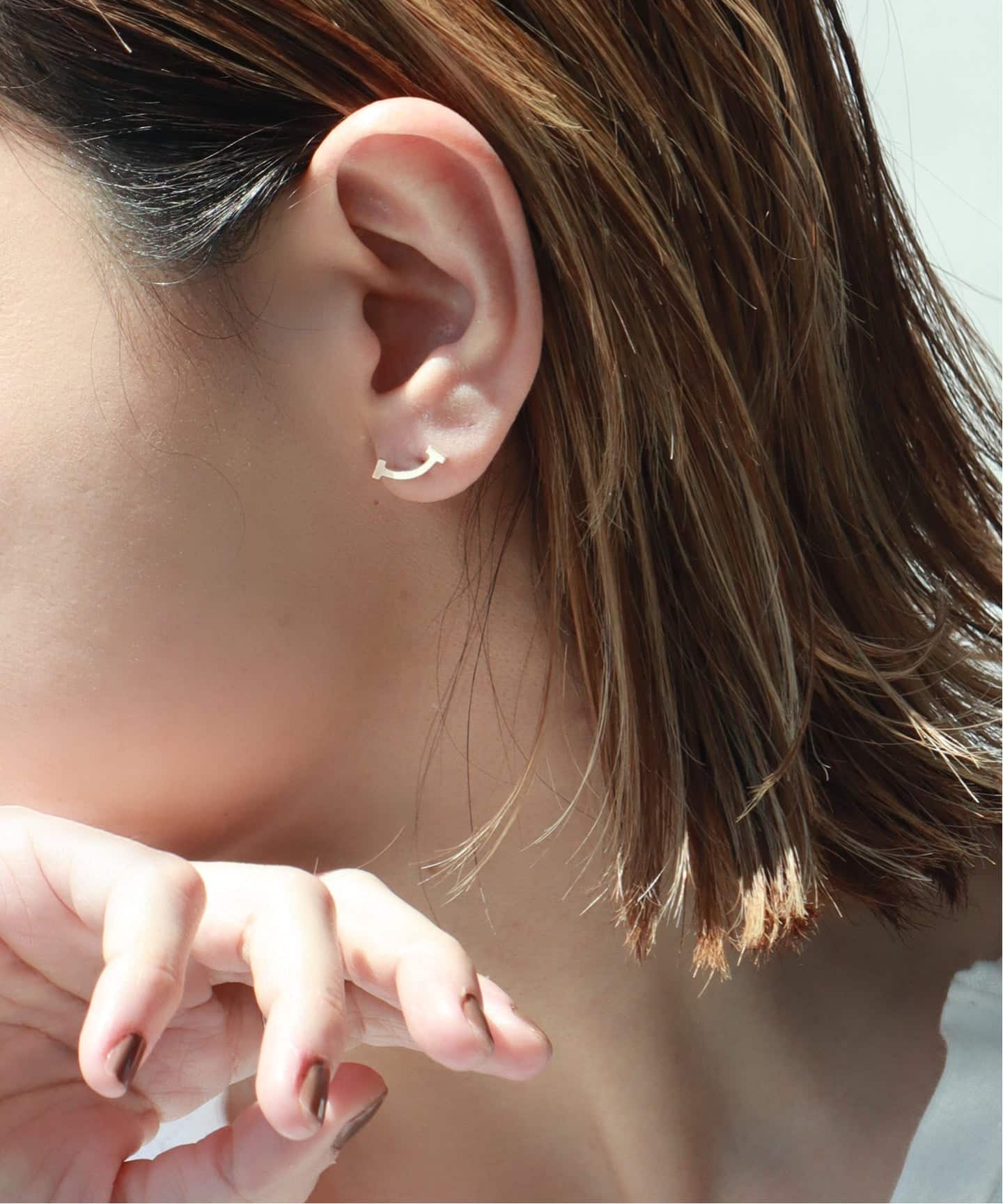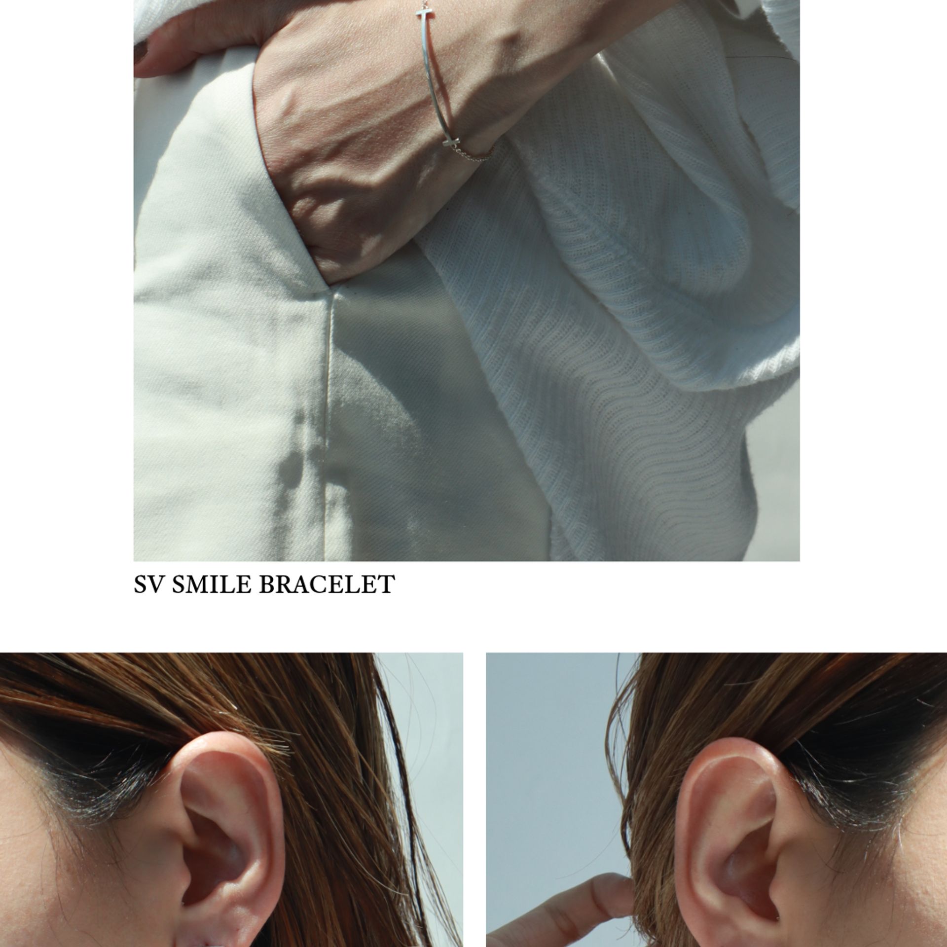 シルバースマイルのブレスレットとピアス。スマイルのブレスレットは、動きに合わせてさりげなくきらめく。顔まわりに、ほんの少しのやわらかさをプラスしてくれるのはミニマムなシルバースマイルピアス。主張しないのにさりげない、他にはない存在感。