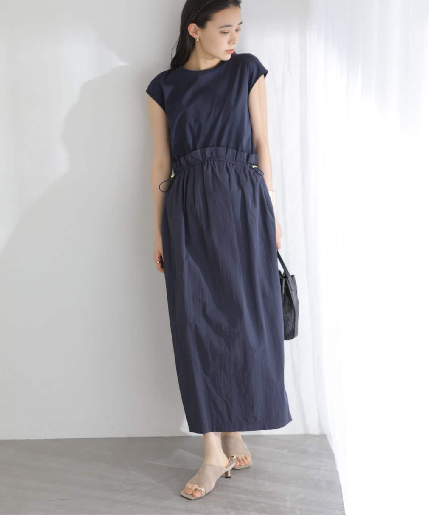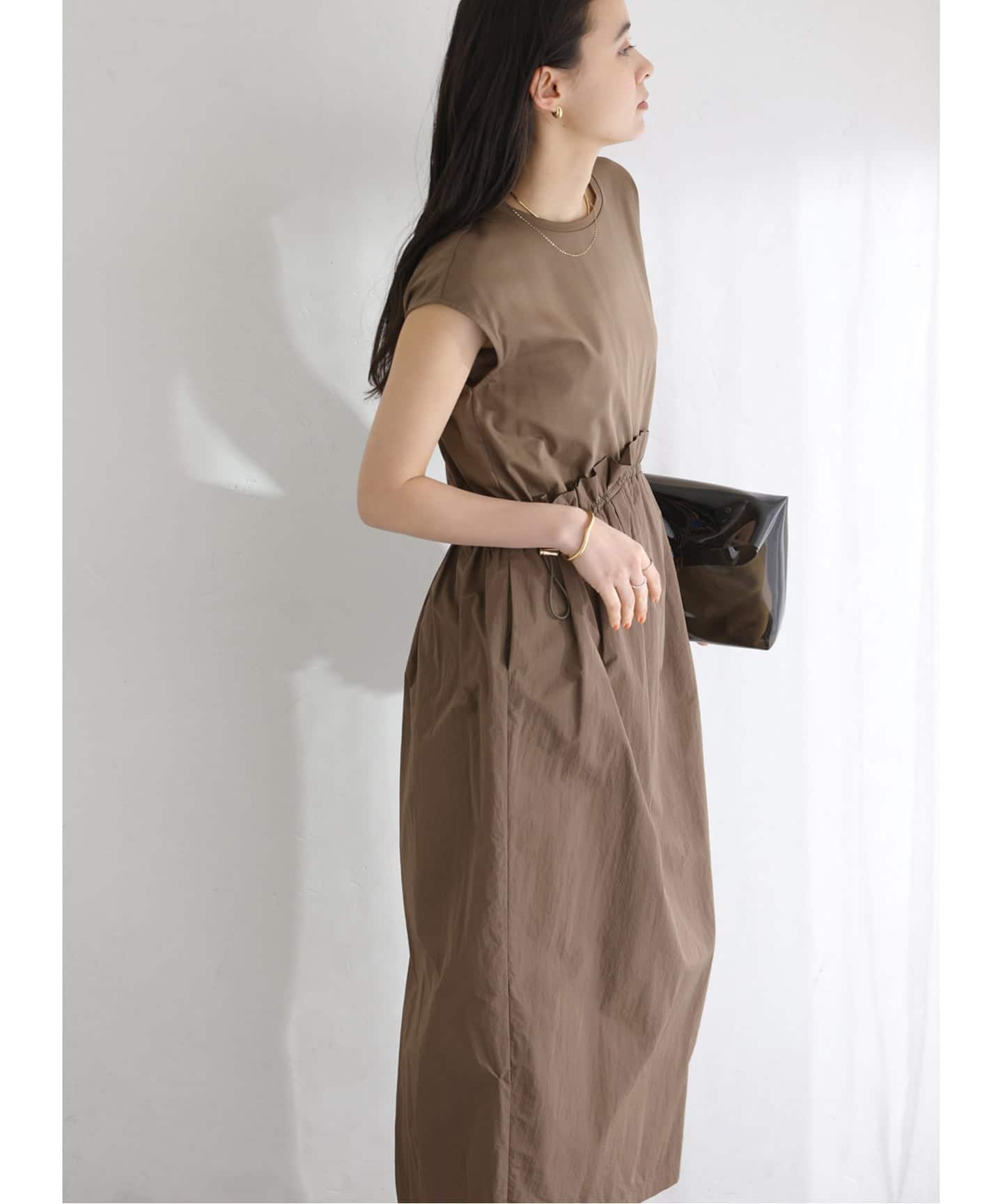 一枚でスタイルが完成する、タフタ素材のドッキングワンピース。