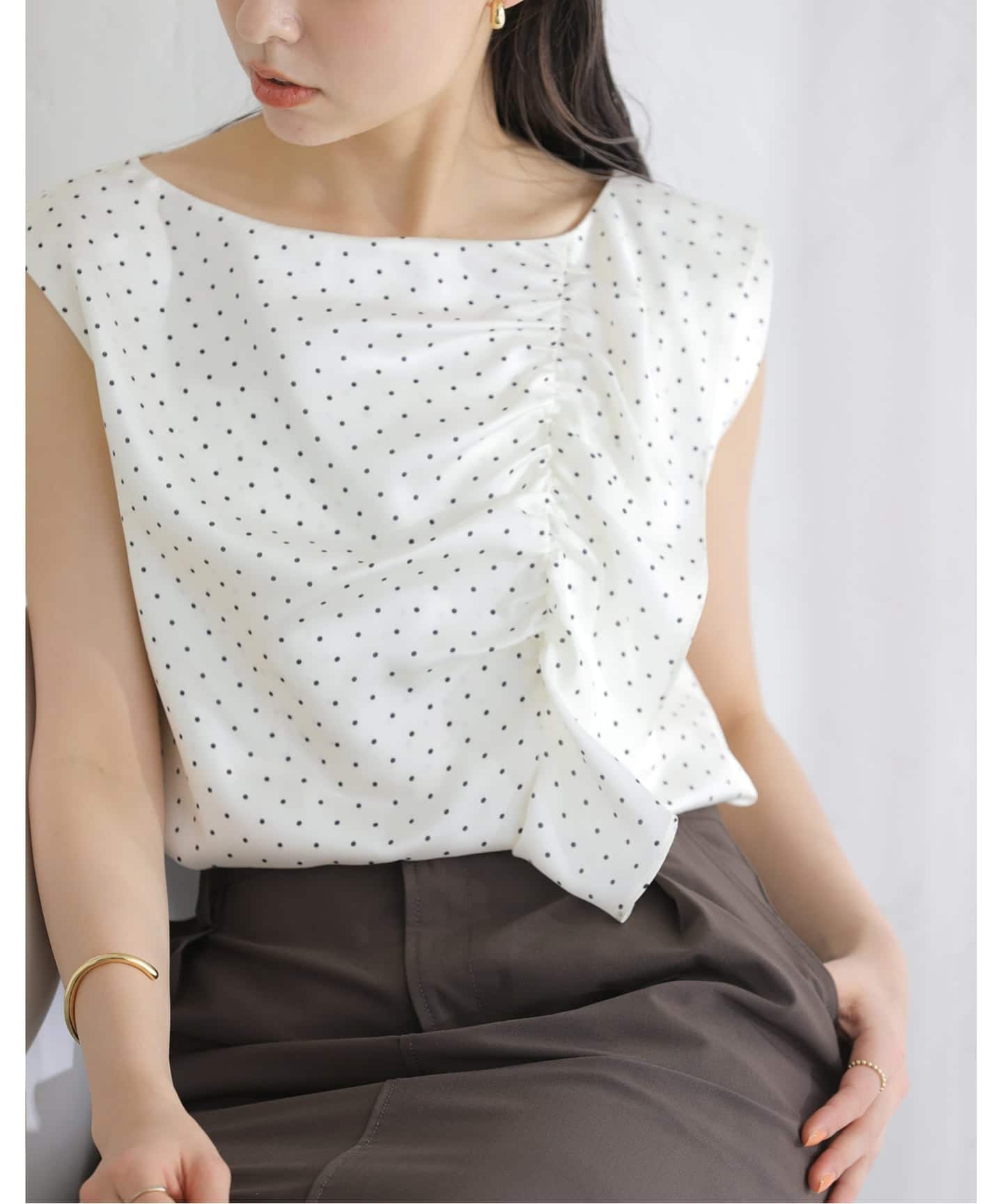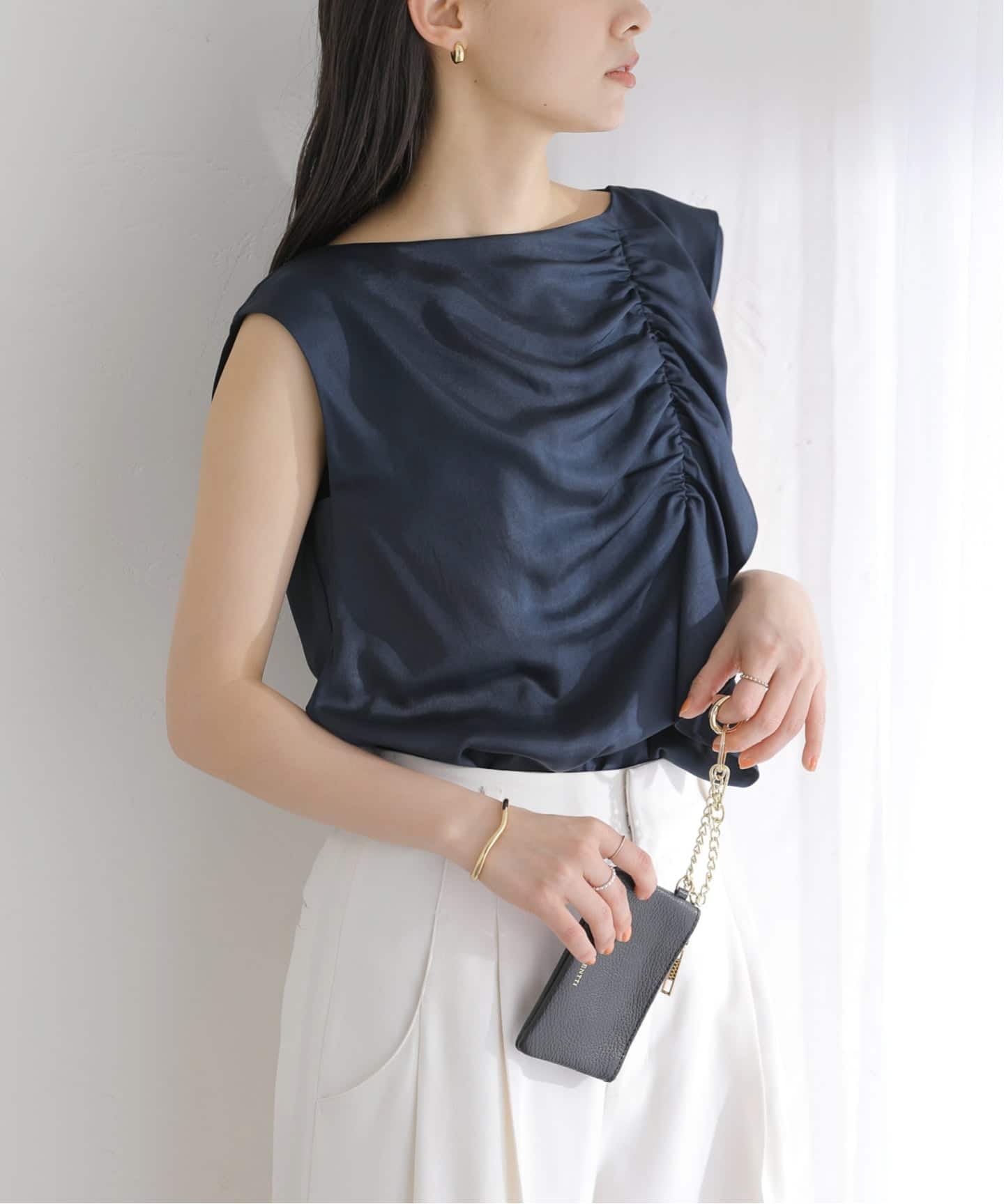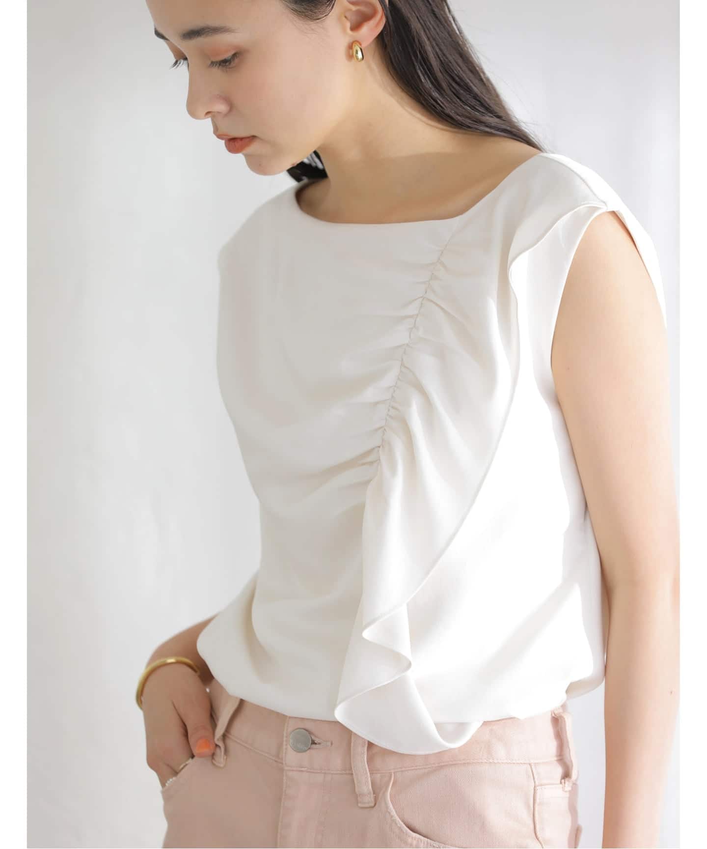 アシンメトリーに寄せたギャザーが自然な立体感を生み、シンプルながらも一枚で華やかなスタイルに仕上がります。