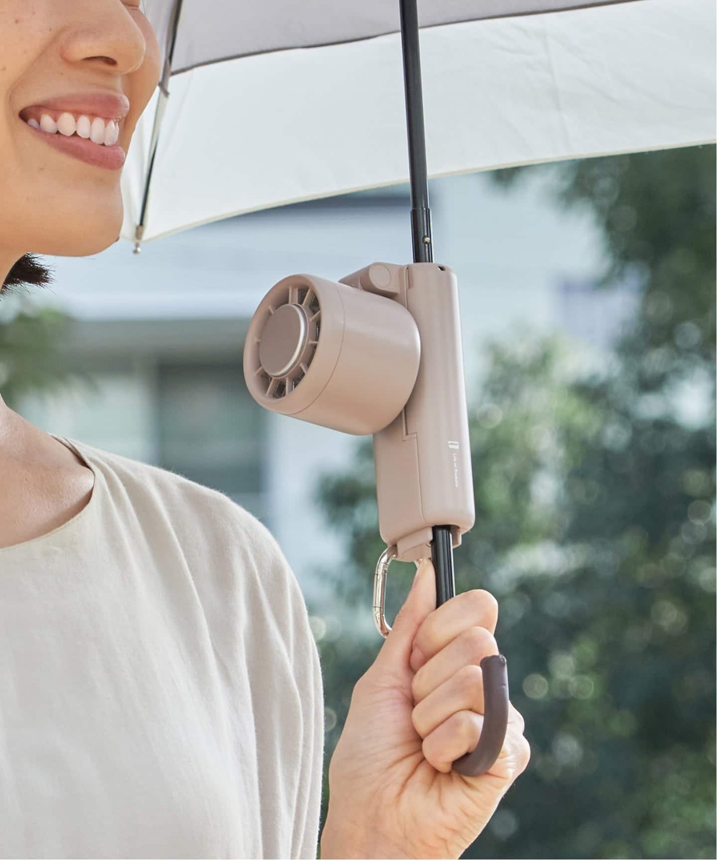 日傘とハンディファンで両手が塞がるストレスをフリーに。