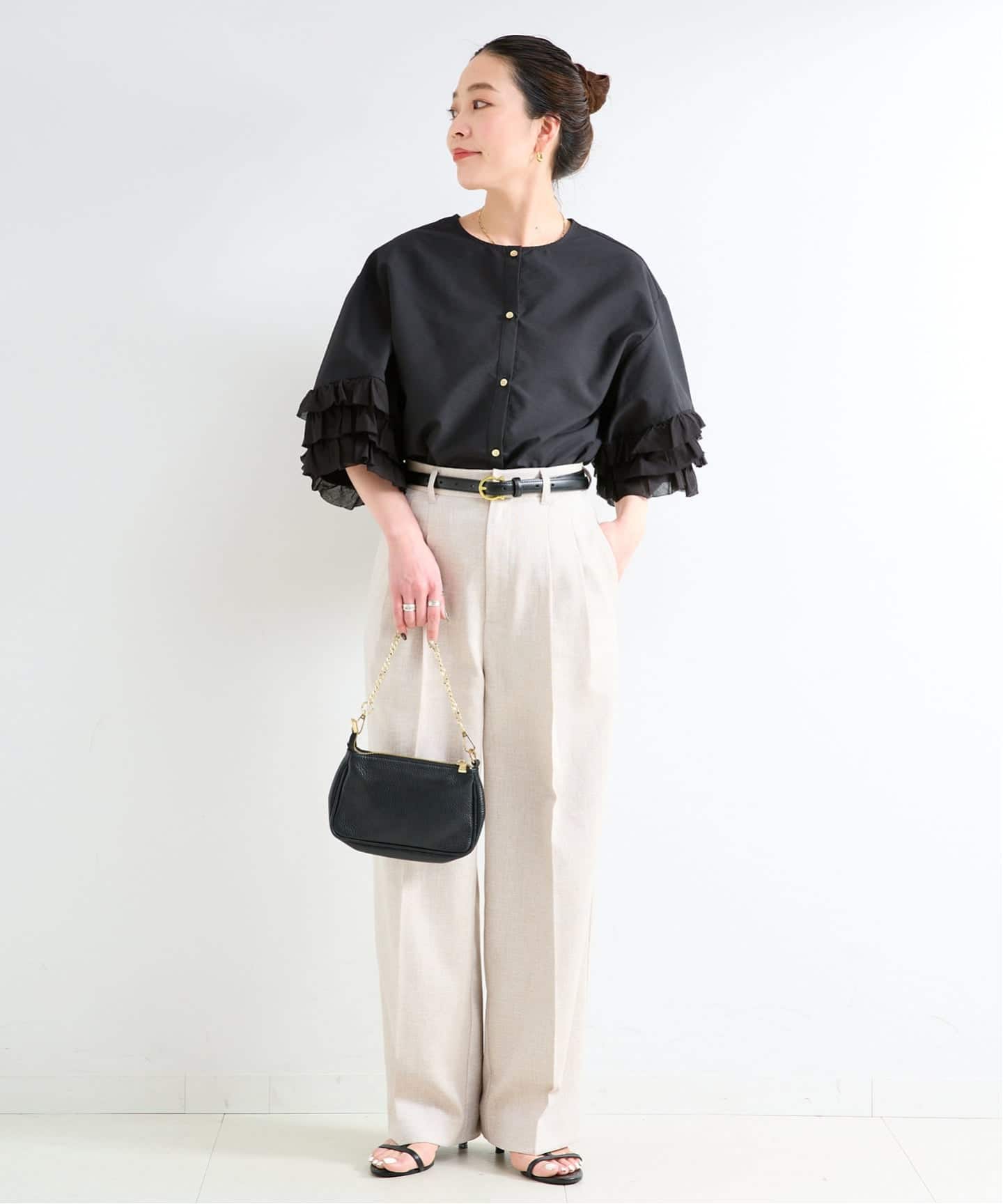 華やかなフリル袖がポイントのブラウス。