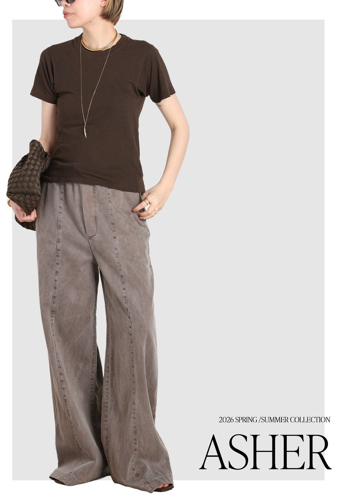 シルエットは太すぎないワイドストレートで、すっきりとした印象に。