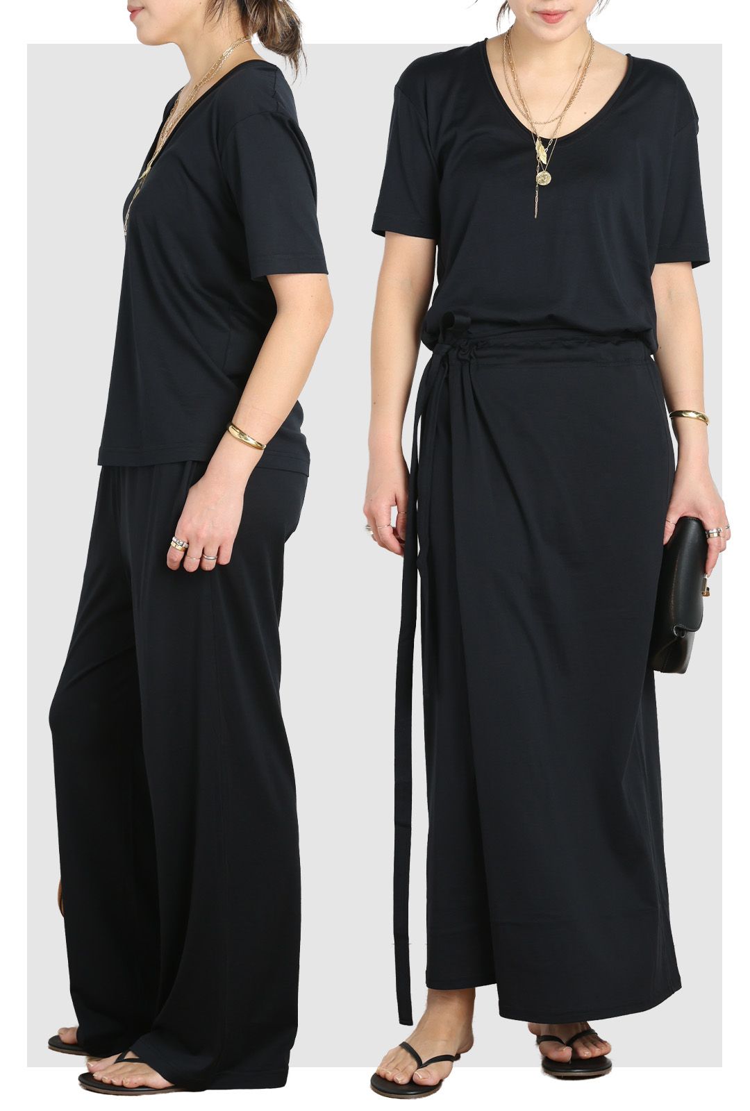 そして、ドレスのように決まるイージーパンツとラップスカートもセレクト。