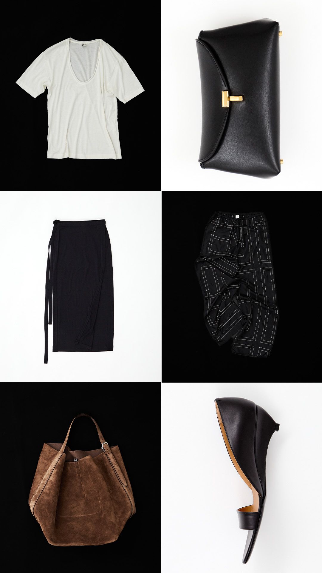 優雅に持ちたいワンハンドルのスエードバッグをモノトーンスタイルのアクセントに。