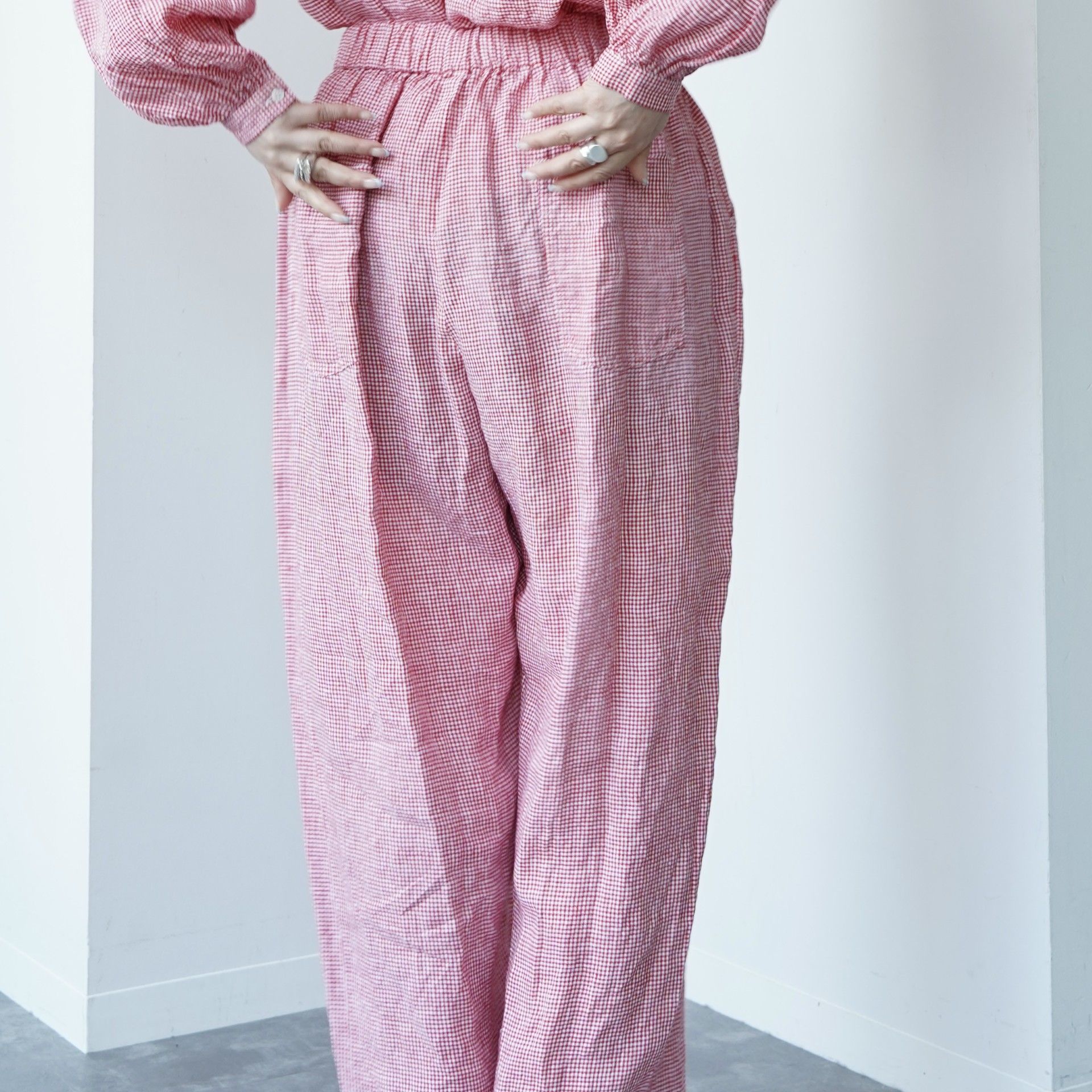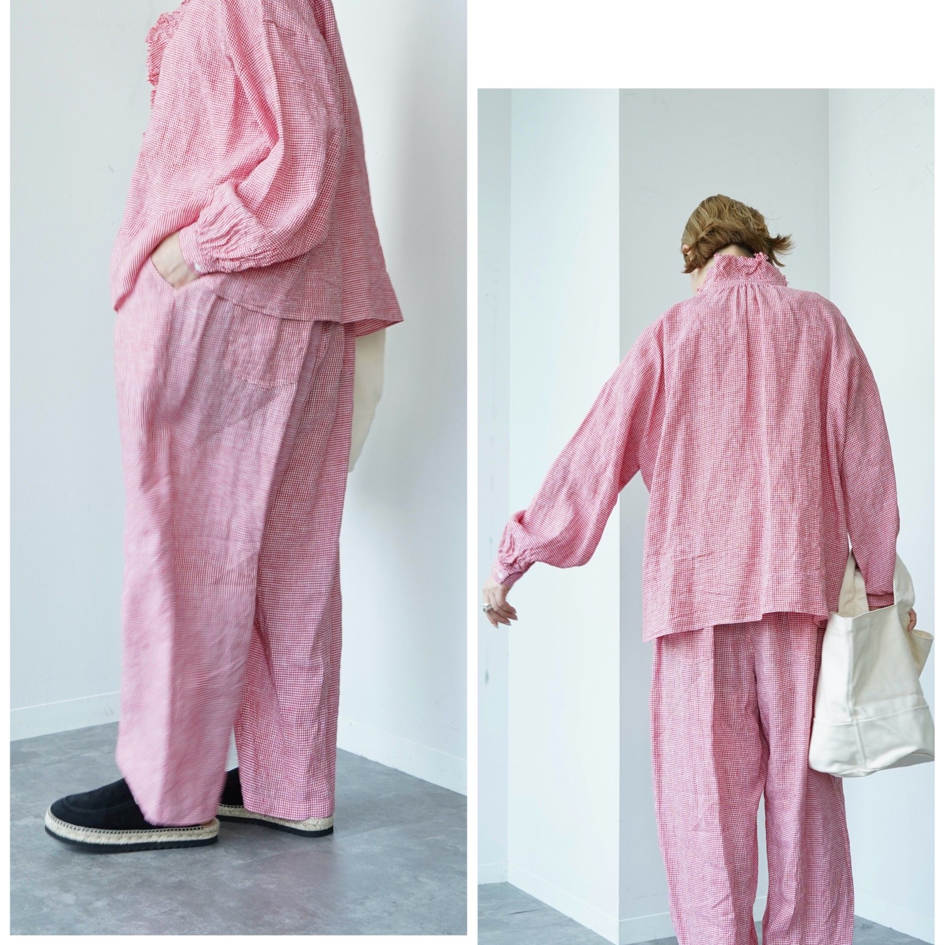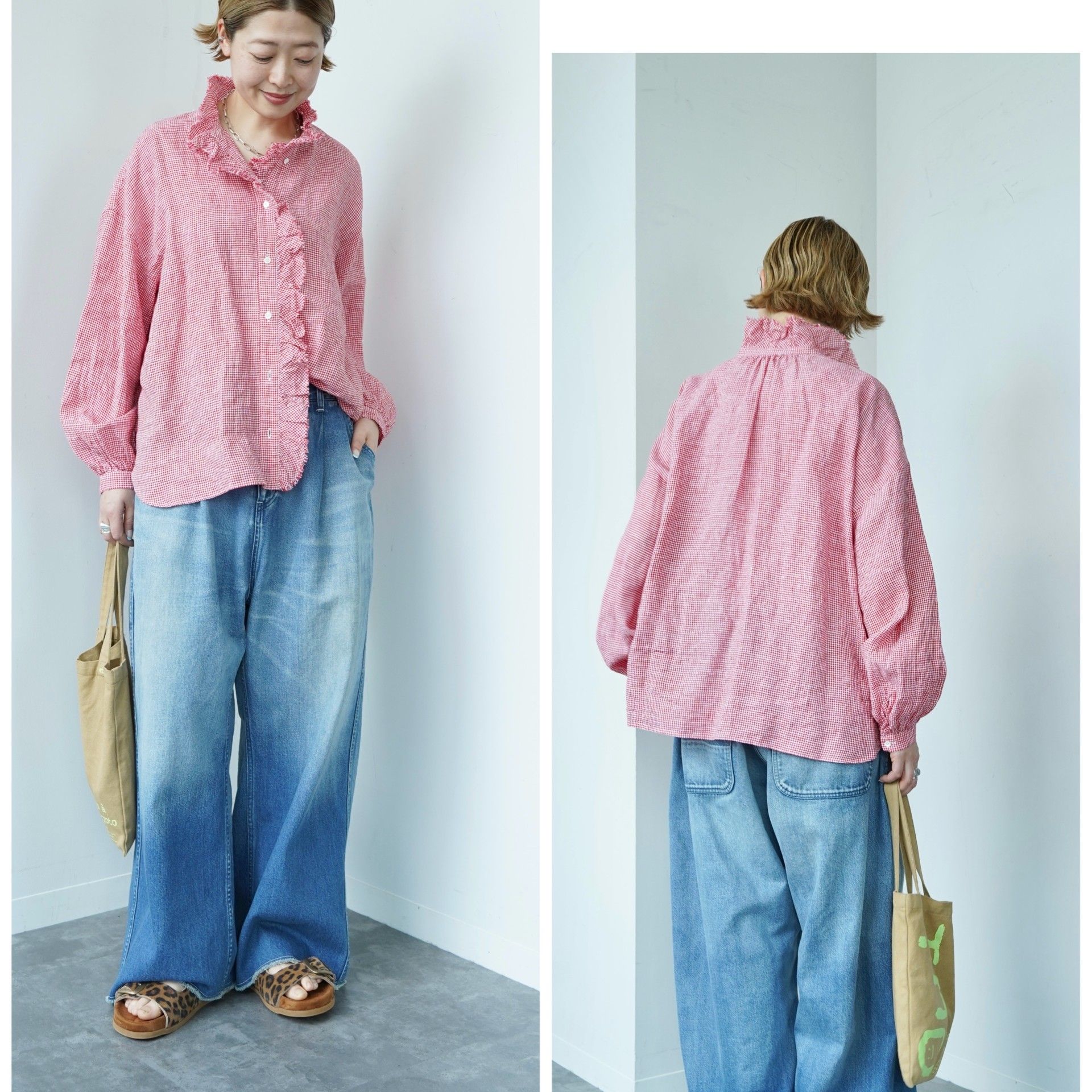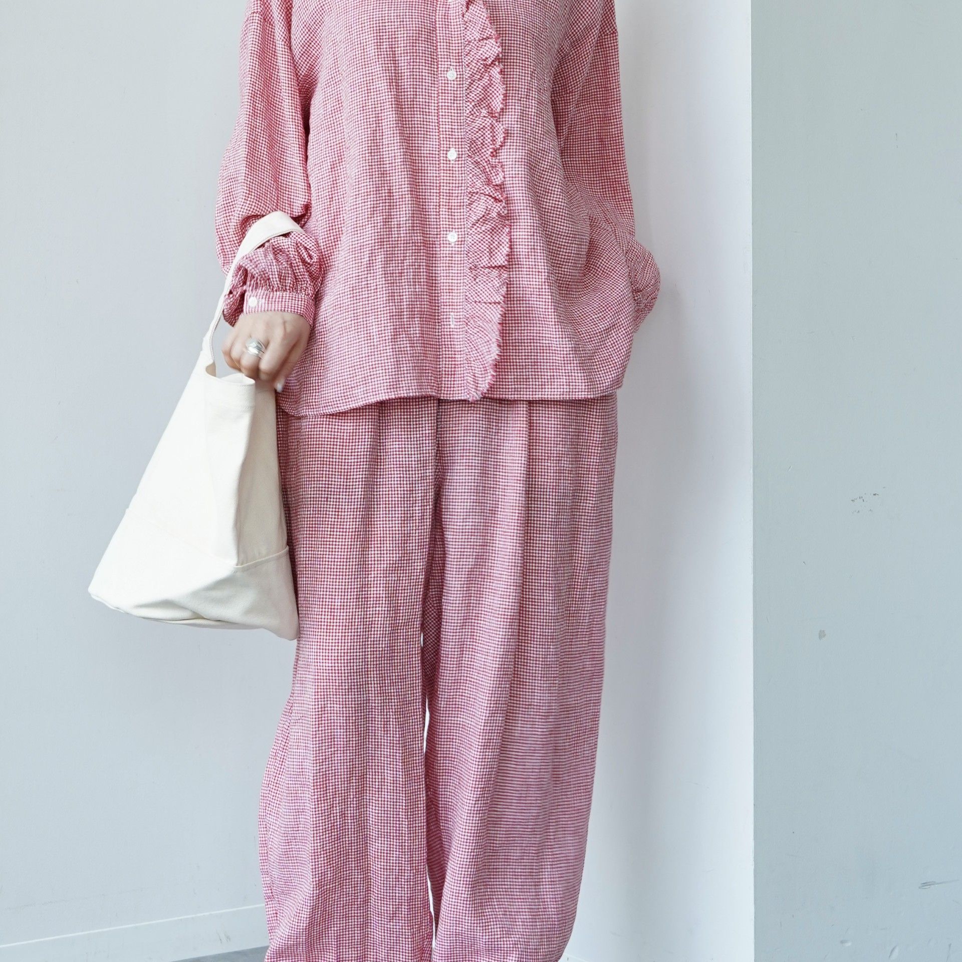 先ほどご紹介したフリルブラウスと同じく、ネイビーは【ギンガム・中】、レッドは【ギンガム・小】のデザインなので、セットアップで着るのもおすすめです。