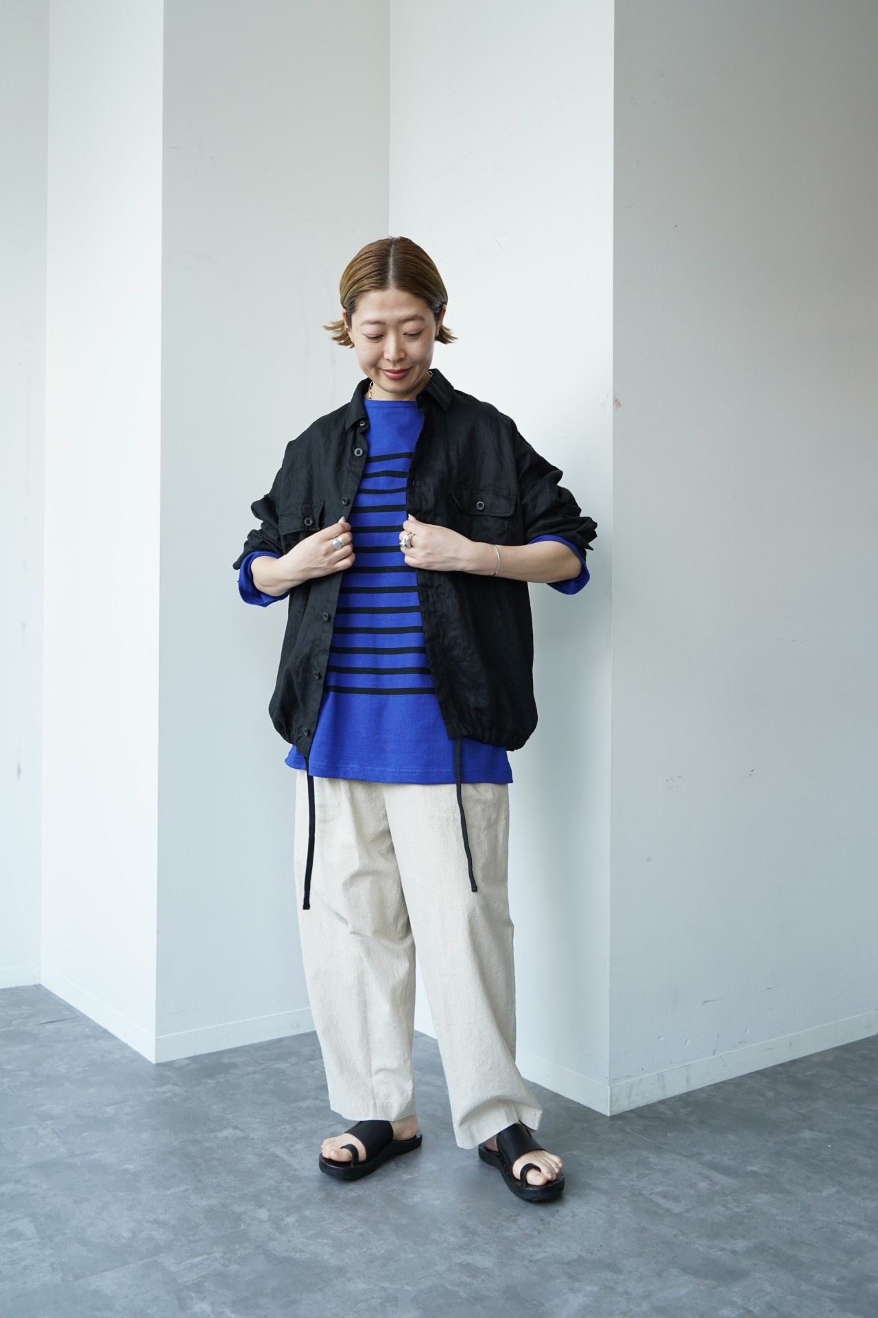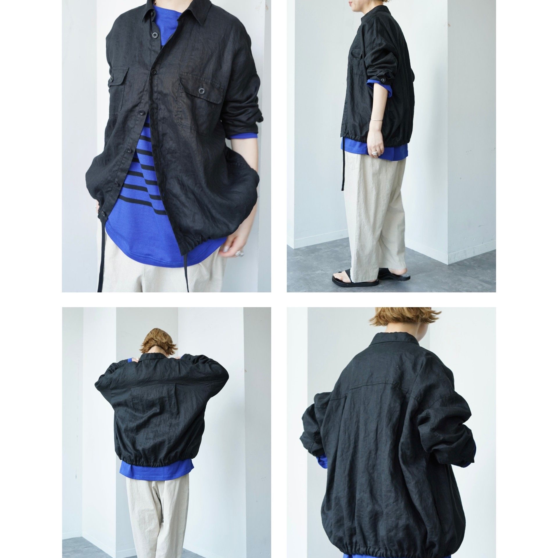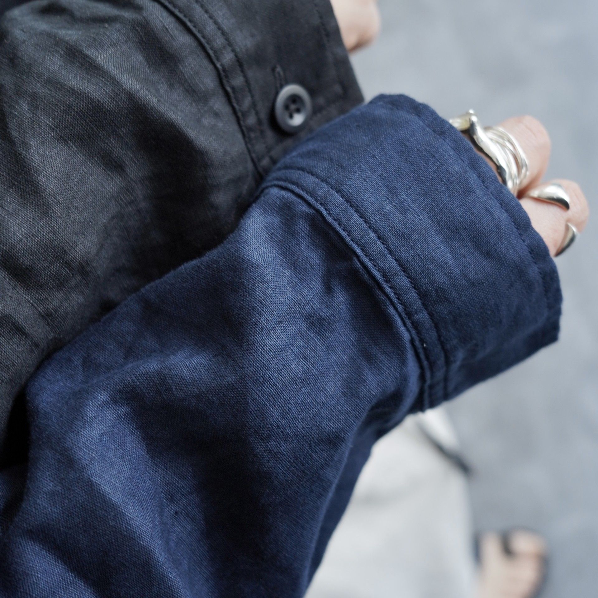 これまでご紹介したブラウスやパンツと同じリネン100%の生地を用いたブルゾンです。こちらのモデルはシリーズに合わせて羽織りやすい、ブラックとネイビーの無地でご用意しています。