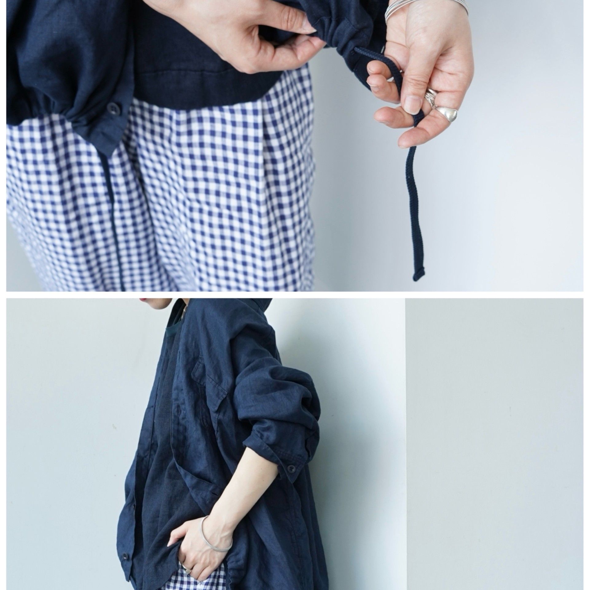 裾のドローコードで絞って裾の見せ方を変えることができます。サイドにポケット付きもついていて、夏の羽織りに便利な一着です。