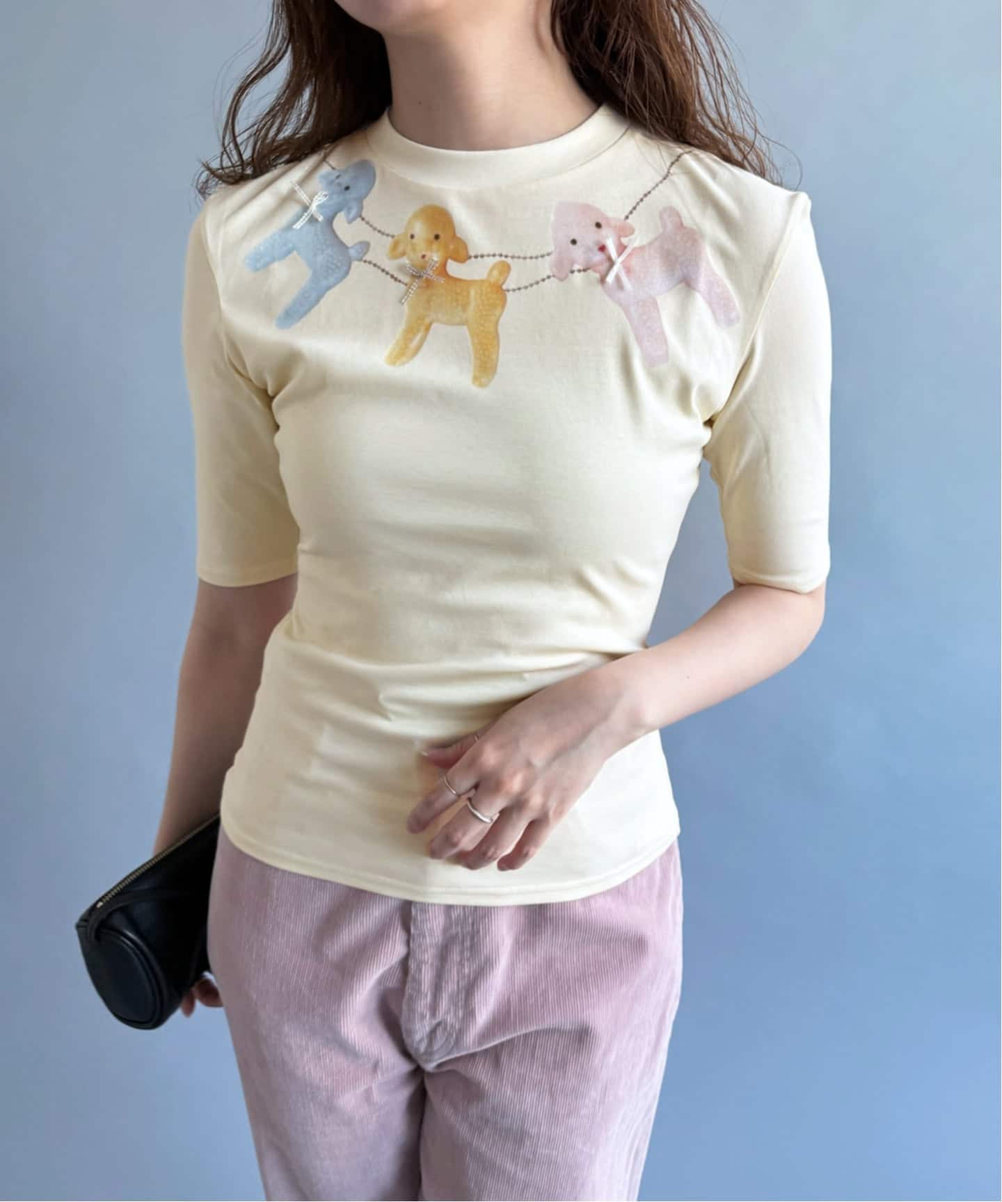 3色レイヤードしたようなロングスリーブと、とぼけた羊がかわいいTシャツはLULUで大人気ブランドのYUHAN WANG。