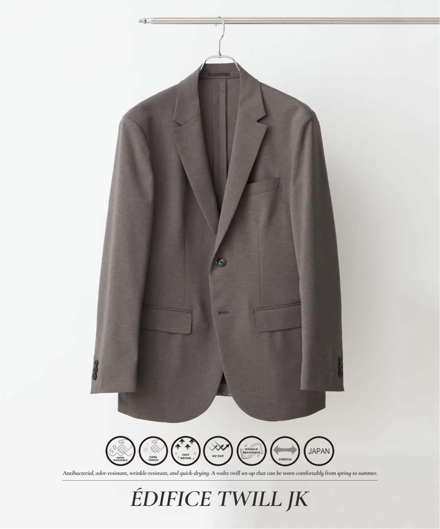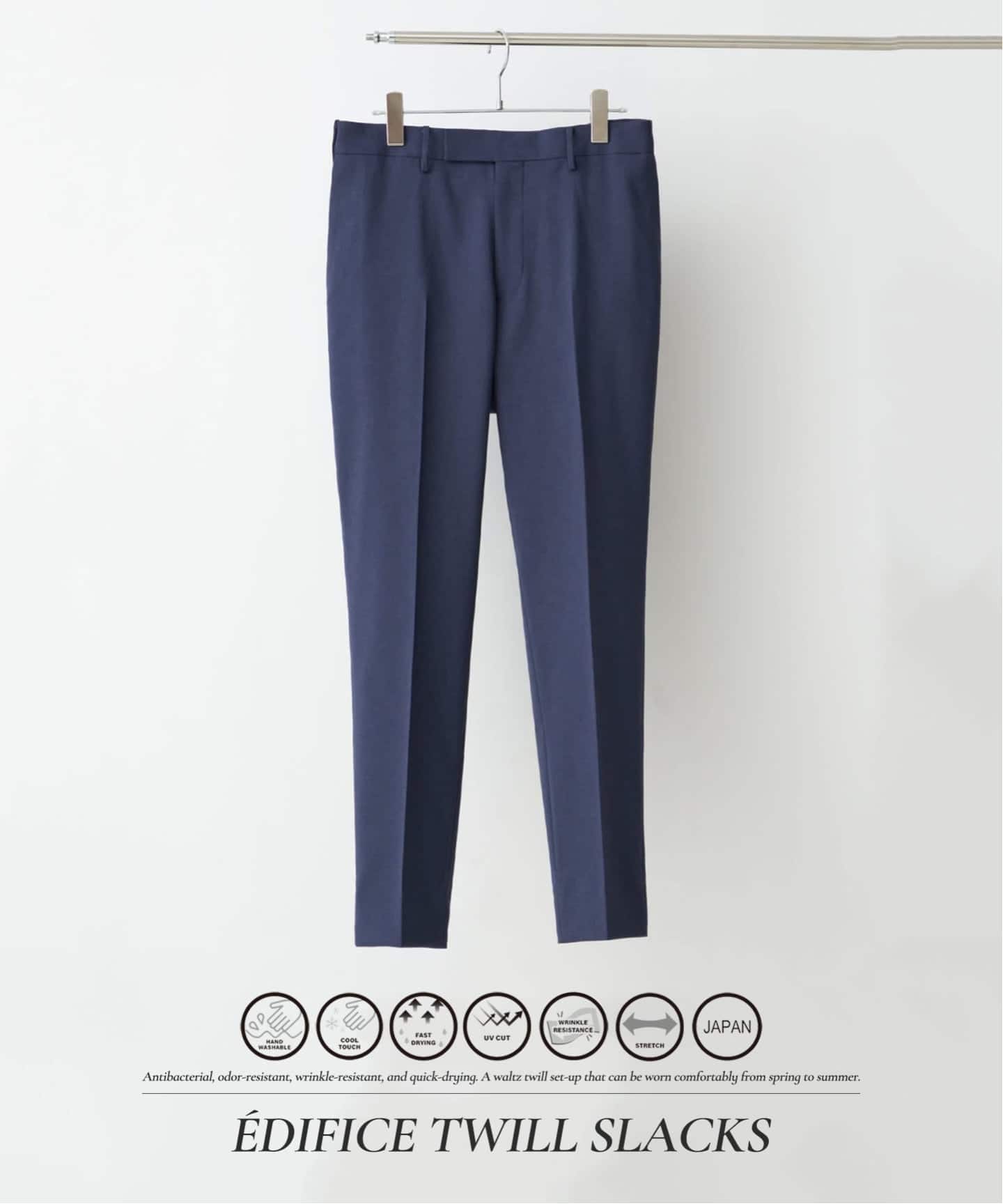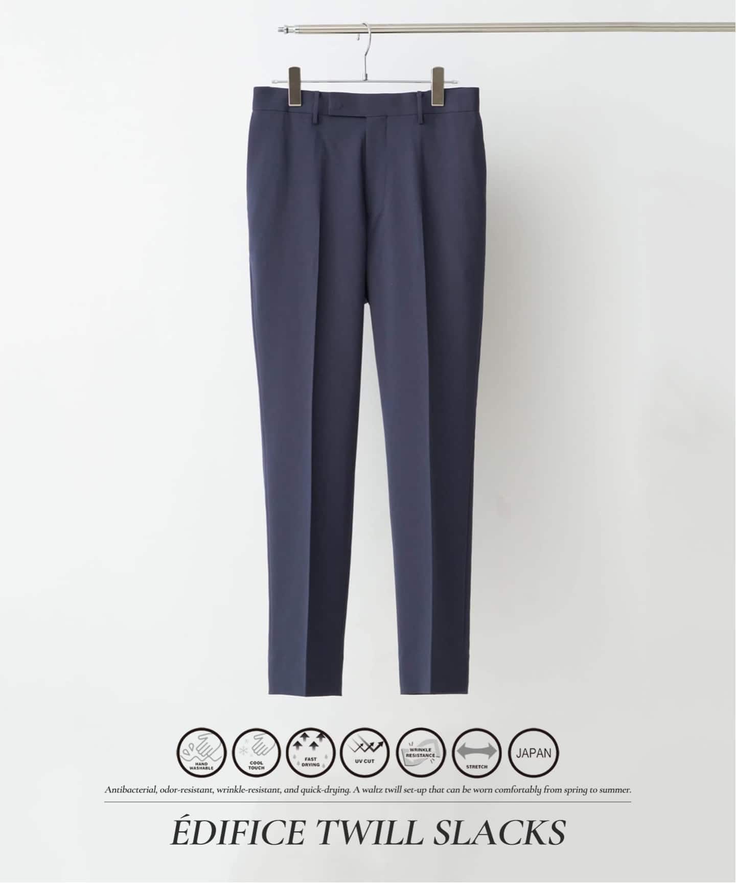 EDIFICEのセットアップは、ストレッチ・撥水・防シワ・ウォッシャブルなど、日常を快適にする多彩な機能をバランス良く備え、暑い季節でも快適な着用感を実現。