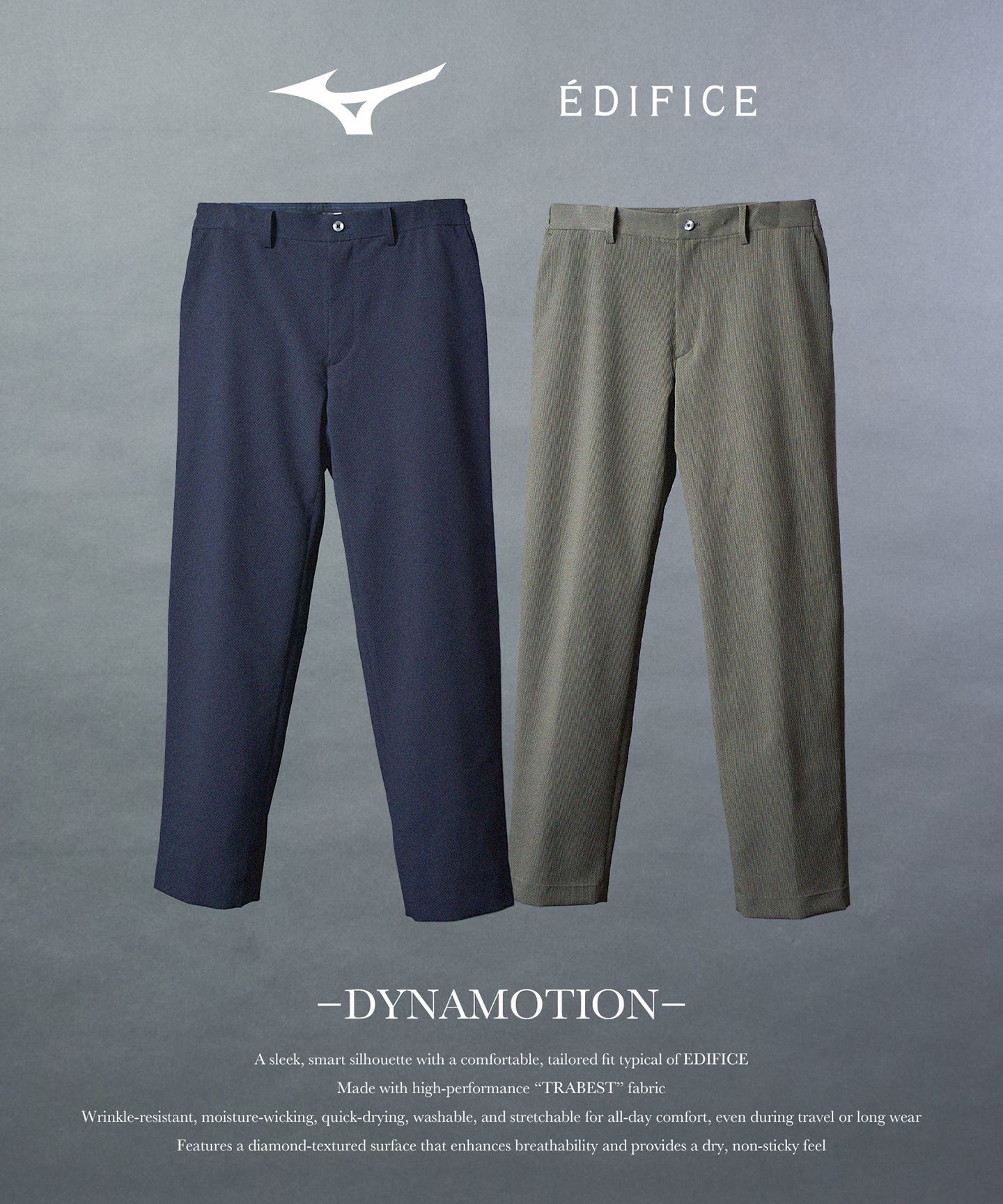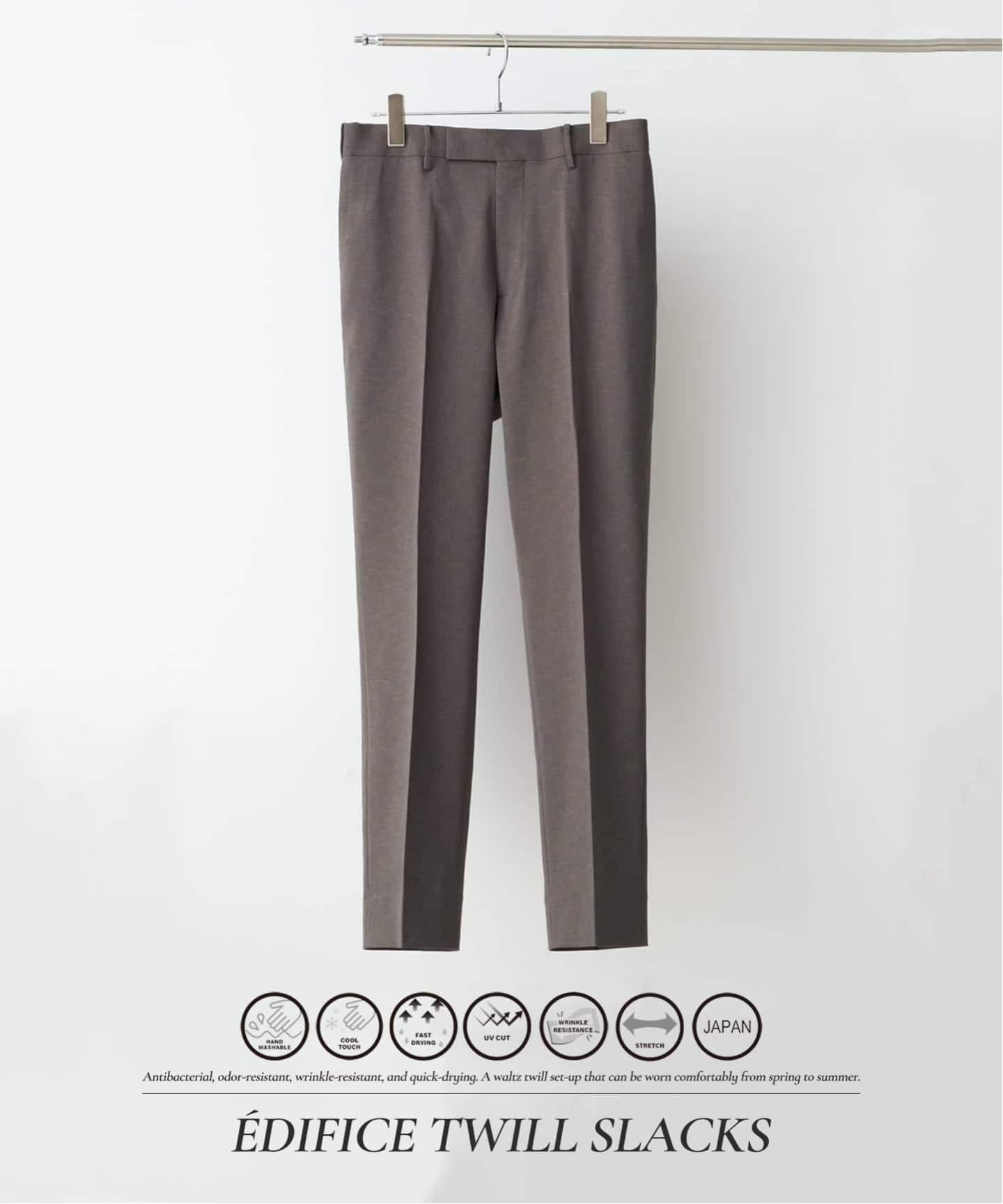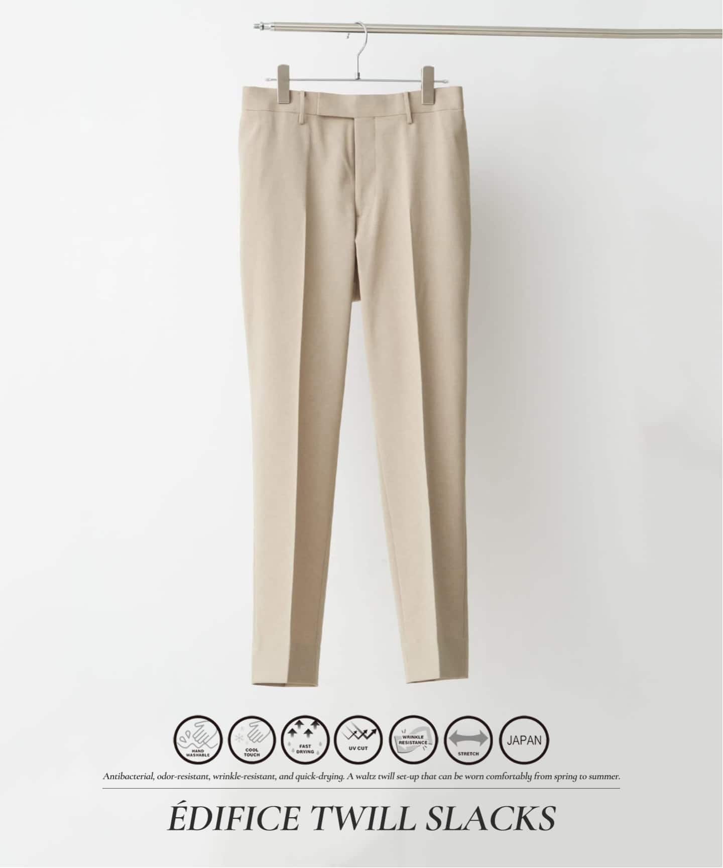 EDIFICEのセットアップは、ストレッチ・撥水・防シワ・ウォッシャブルなど、日常を快適にする多彩な機能をバランス良く備え、暑い季節でも快適な着用感を実現。