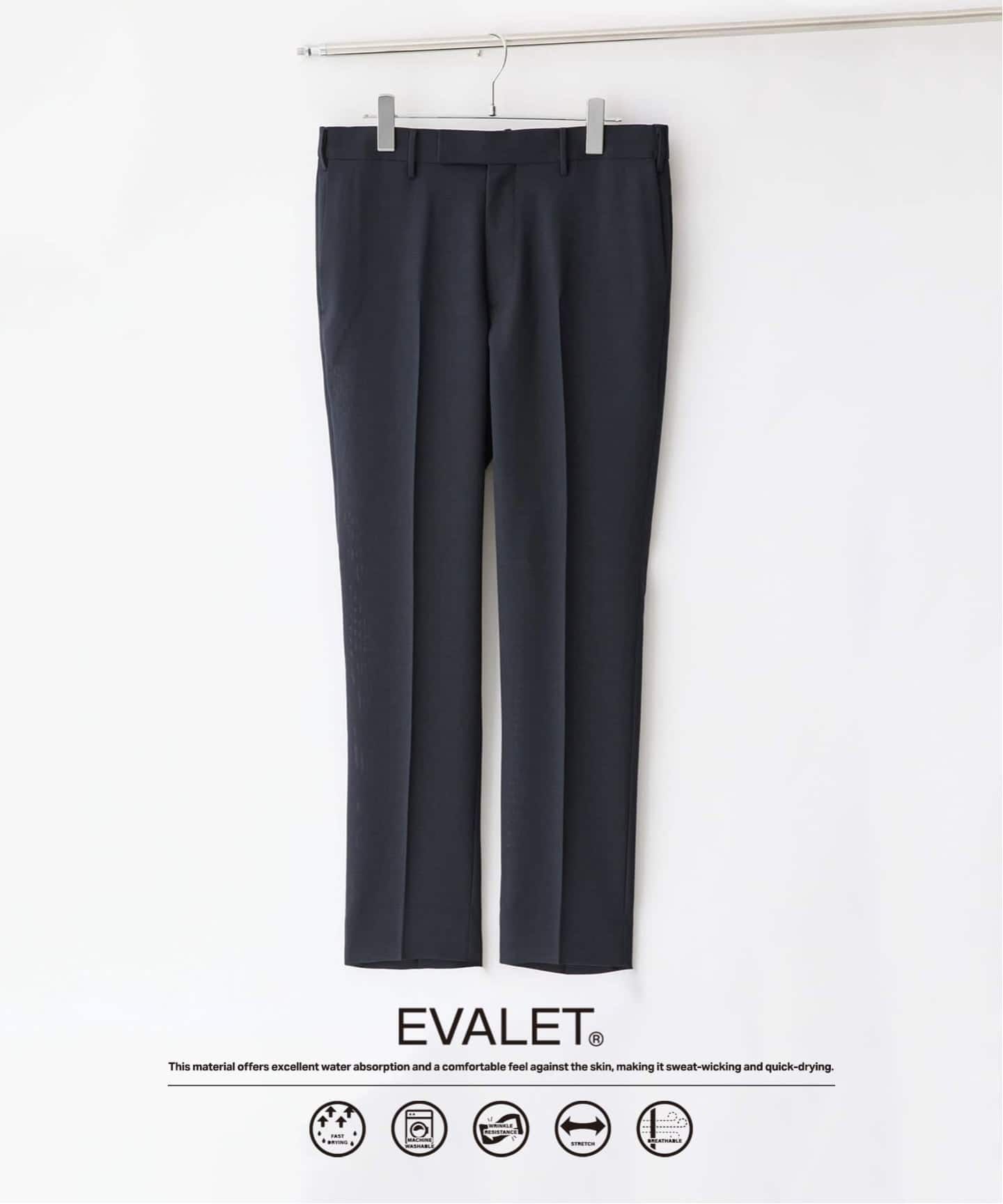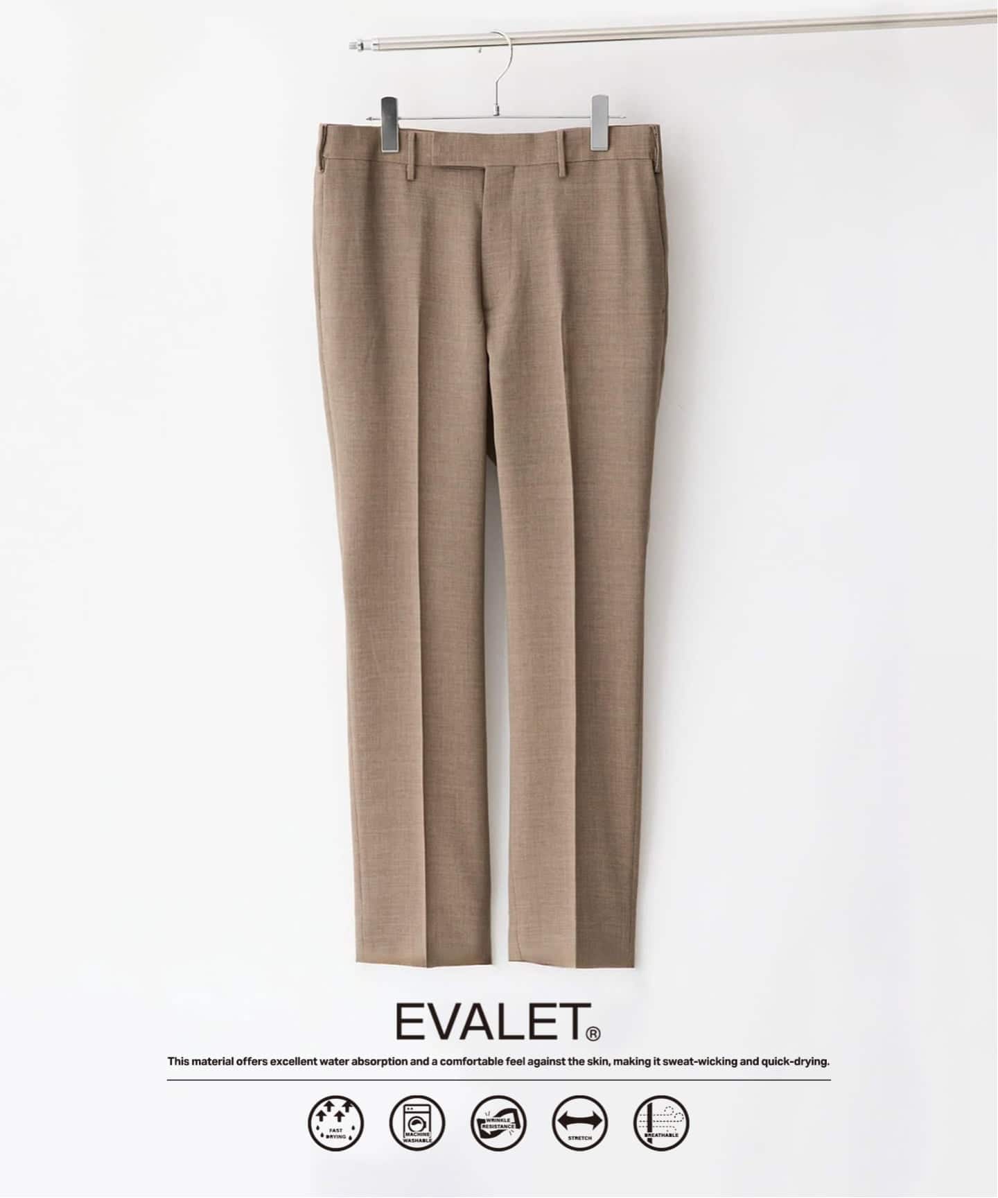 東レが開発した優れた吸水性を持つ機能素材”EVALET"のメッシュ素材を使用し、肌離れのよい凹凸感ある肌離れの良さ、清涼感あるドライなタッチ感が盛夏に向けておすすめの快適な着心地のセットアップ。