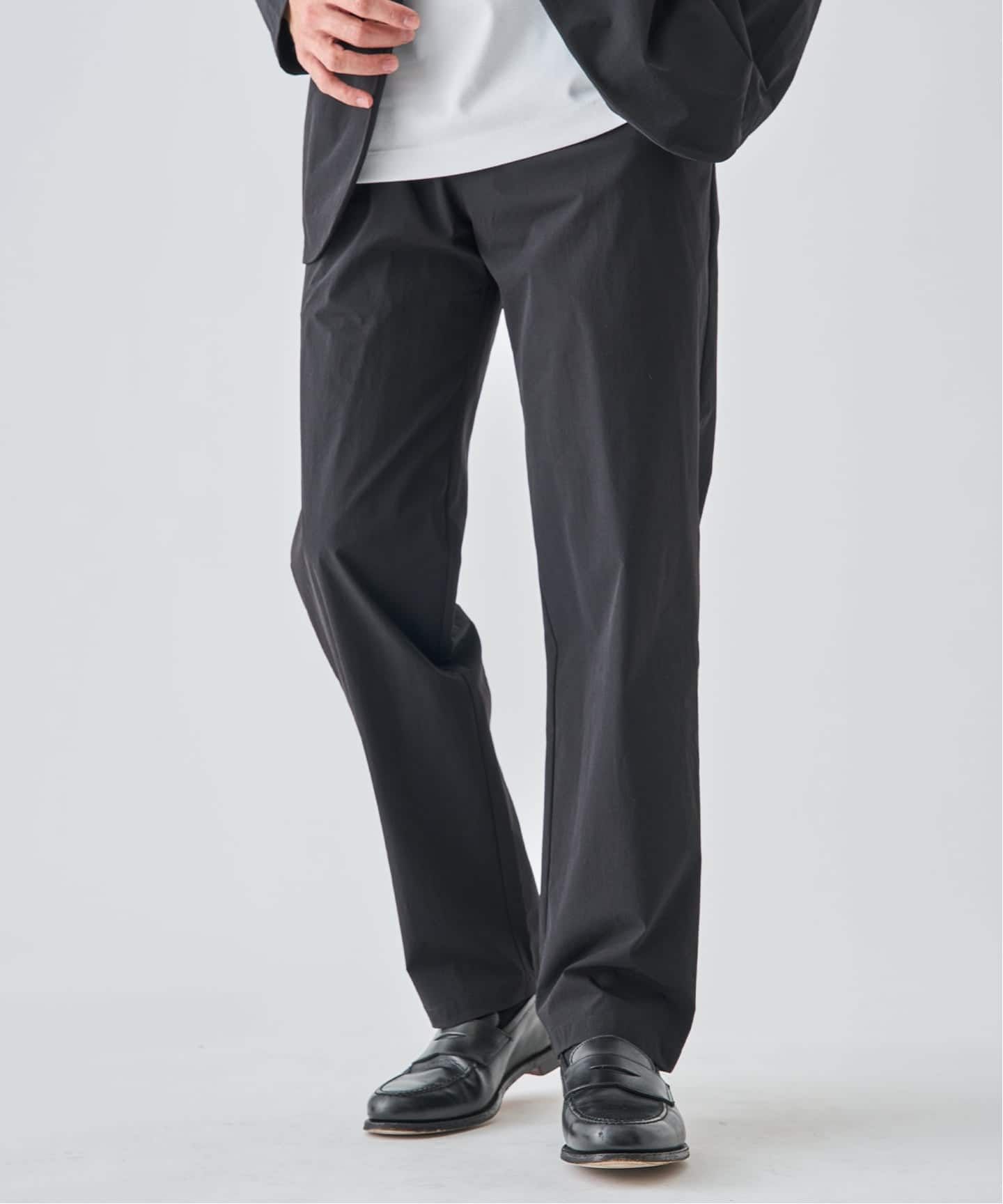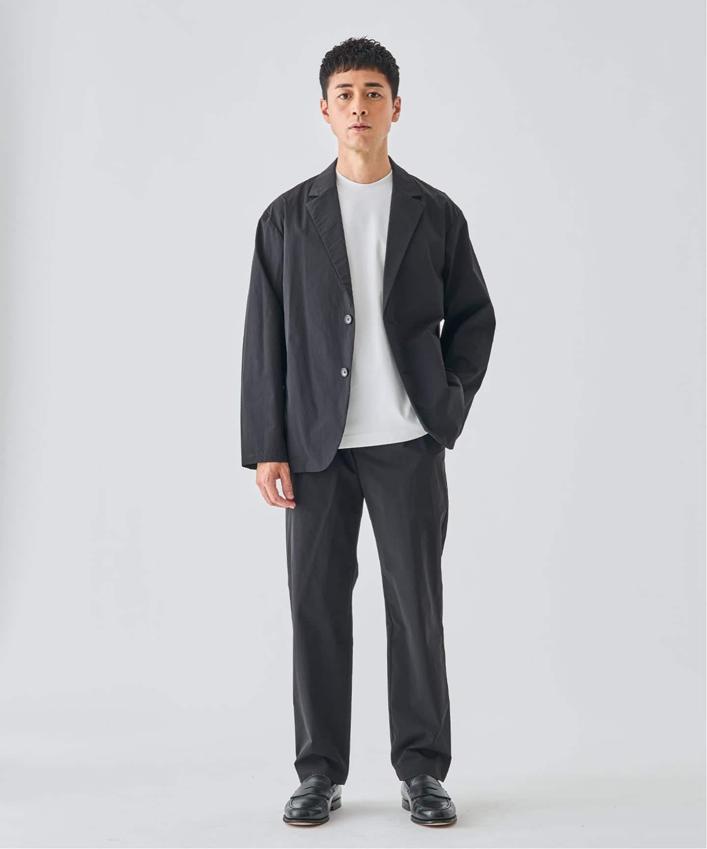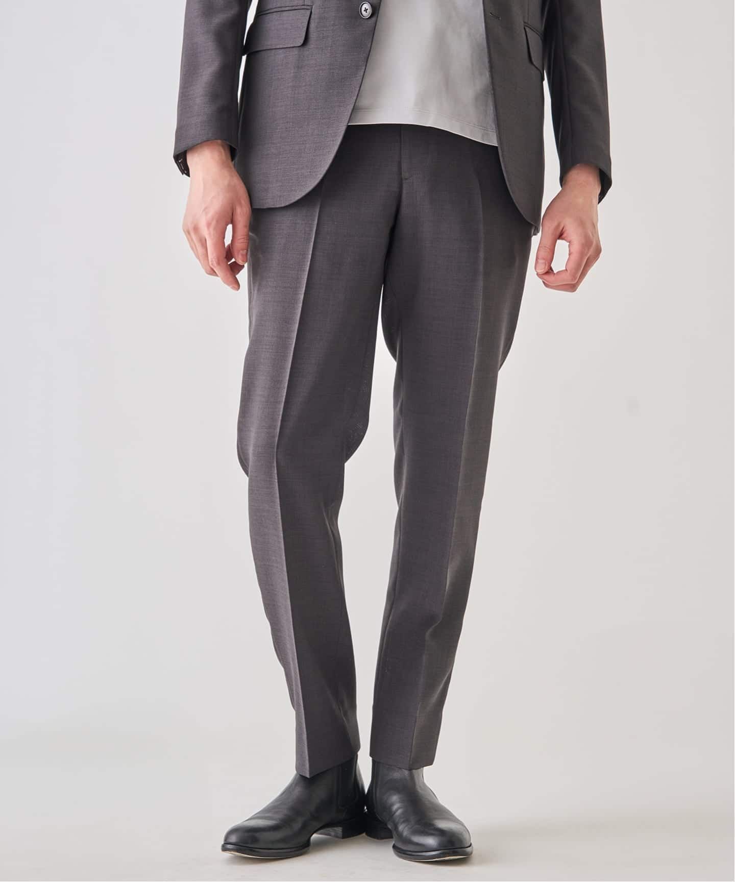 トラウザーはマチ構造や可動域を意識した設計で、座る・歩くなどの動作もストレスフリーに対応。セットアップでも単品でも活躍し、日常から出張まで幅広く対応する一着です。