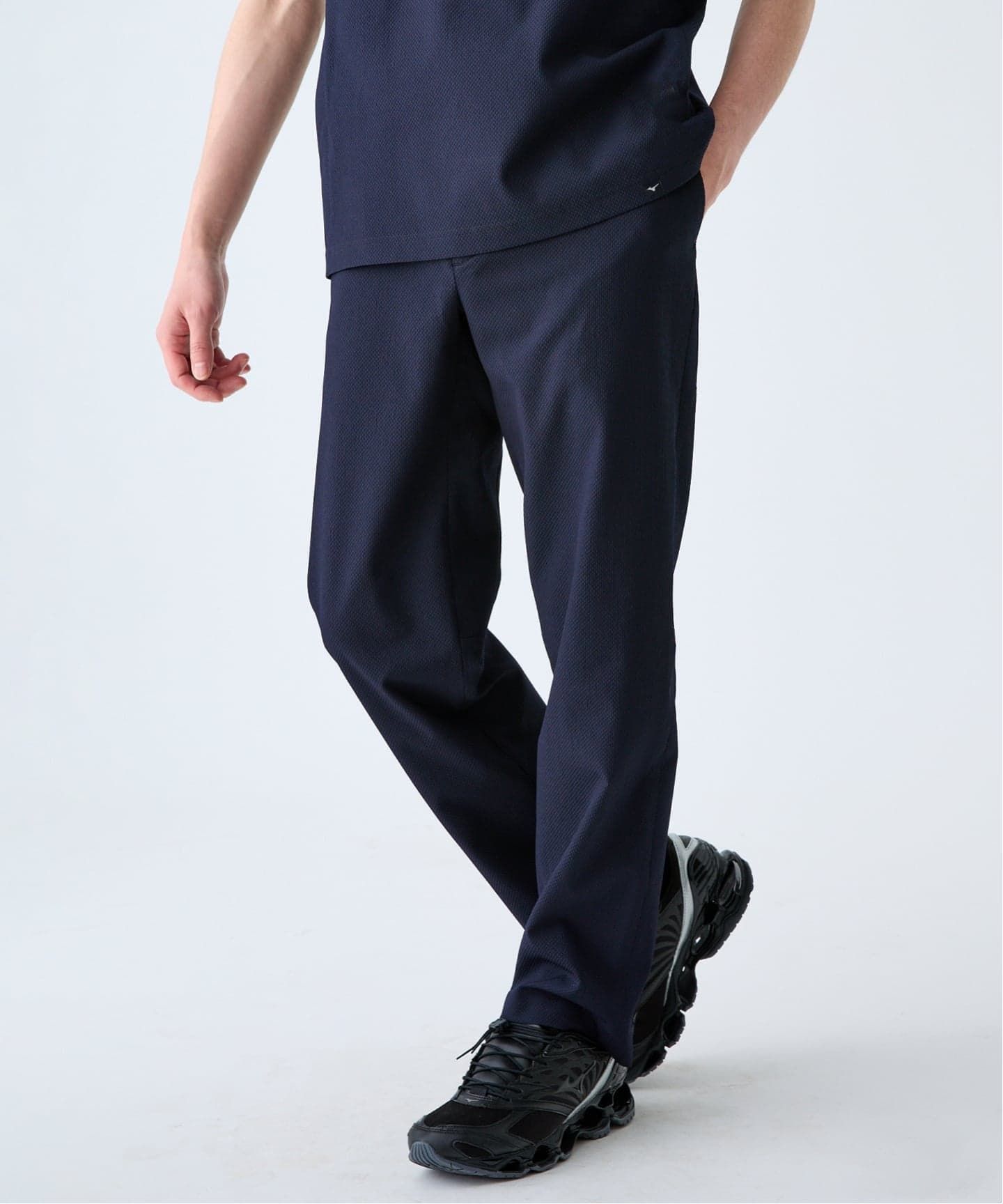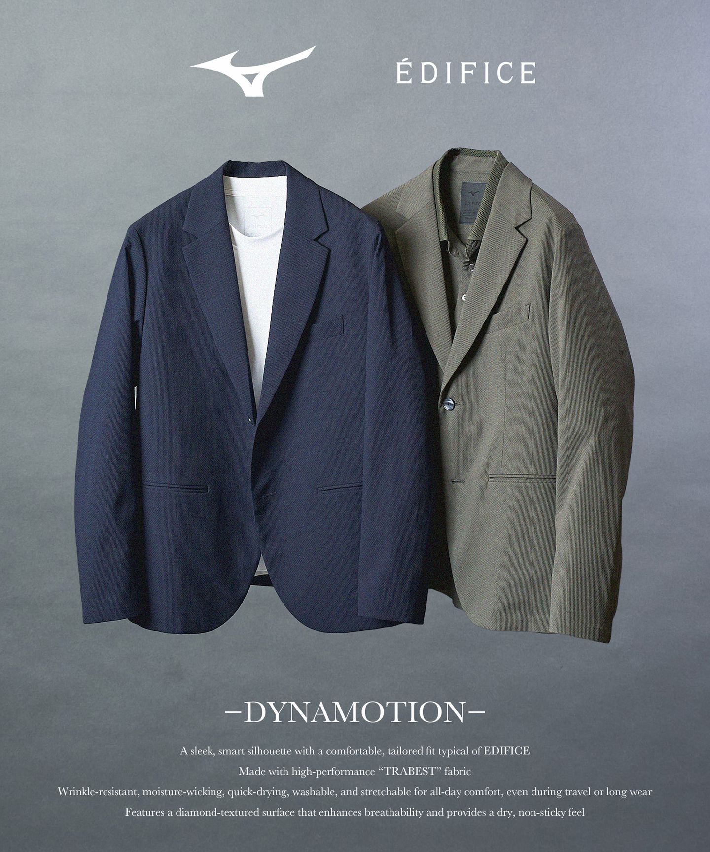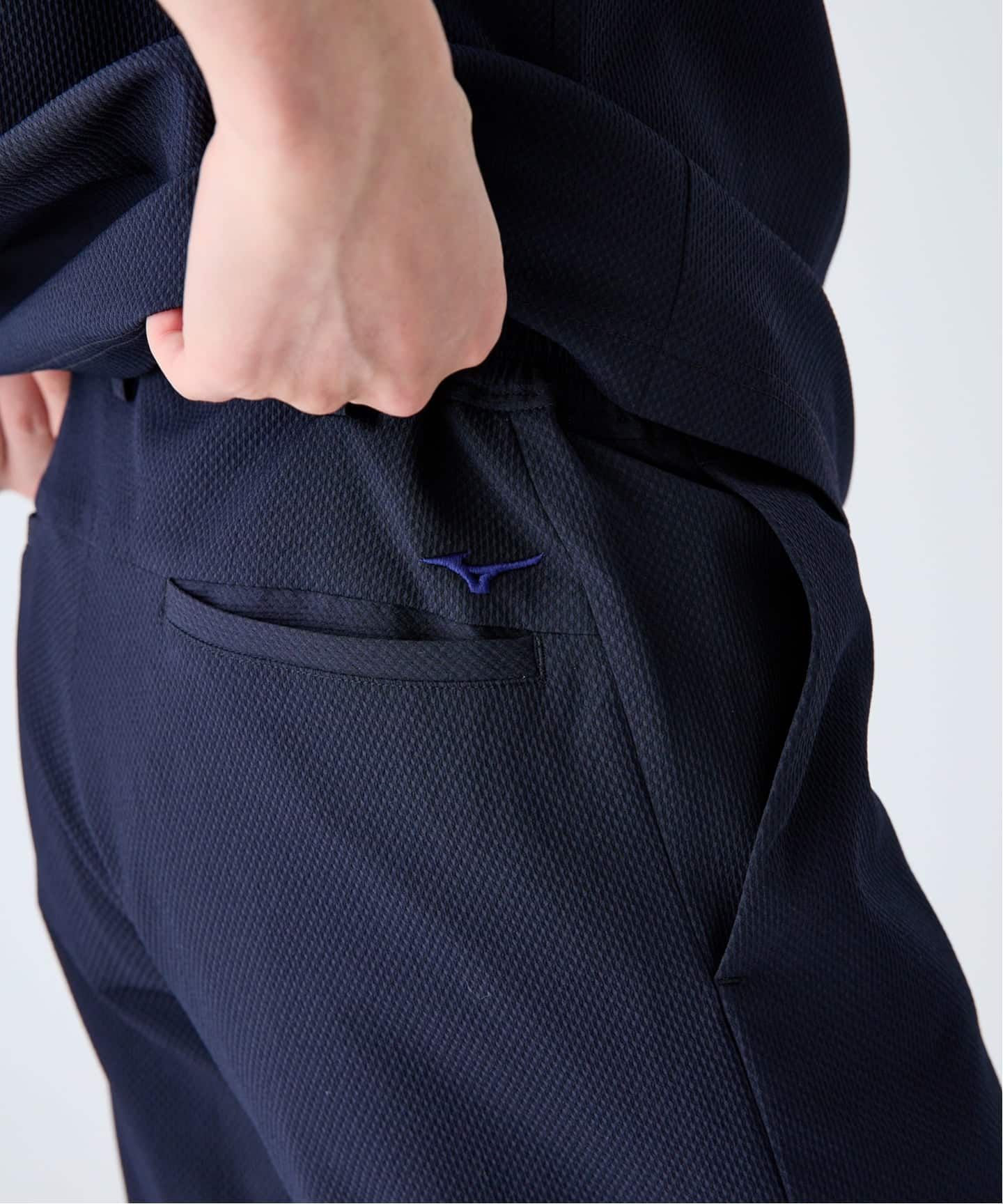 ジャケットはハイブリッドなパターン設計により動きやすさと美しいシルエットを両立し、「TRABEST」素材で防シワ・吸水速乾・ストレッチ性を備えています。