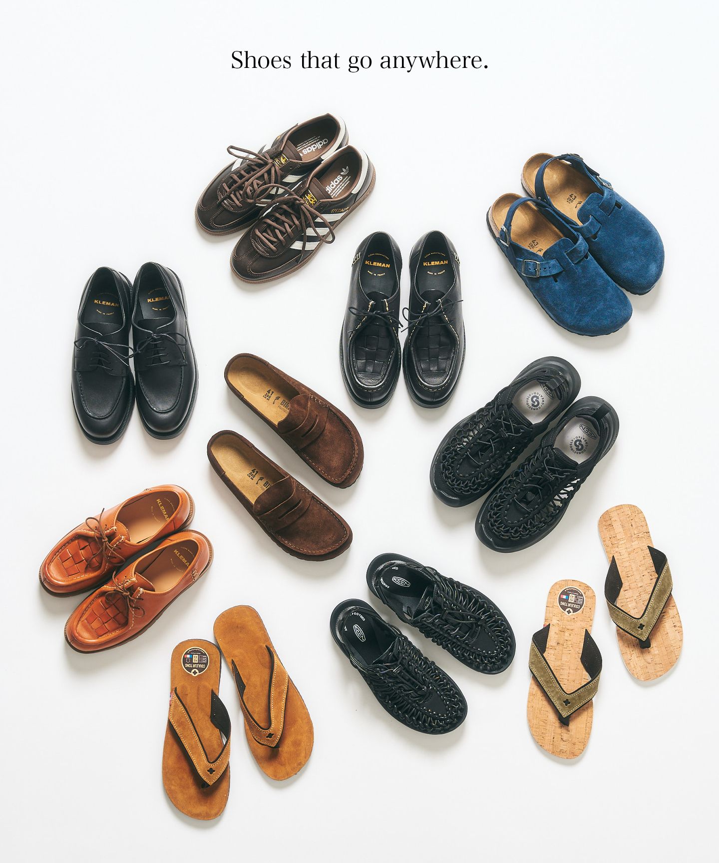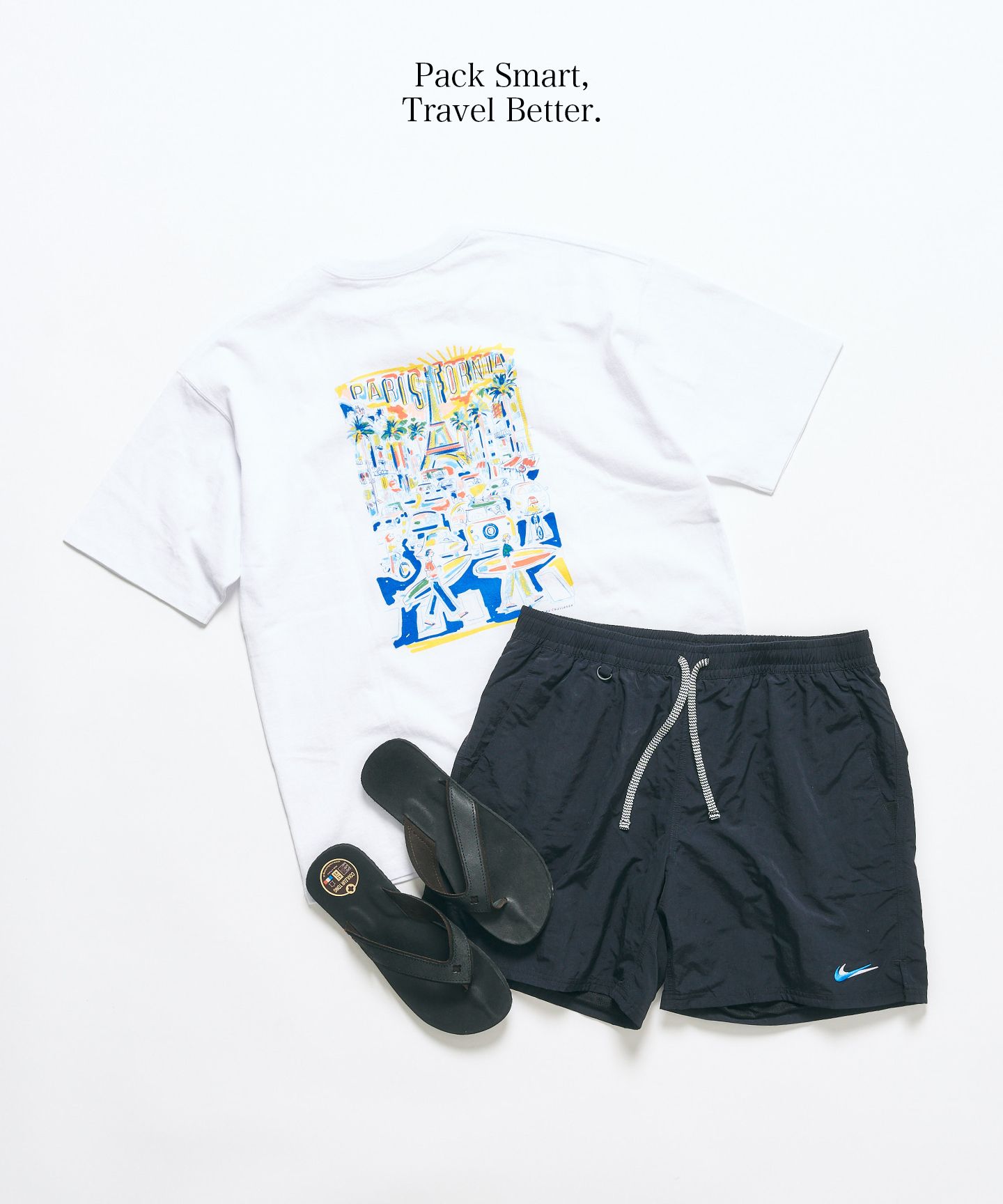 濡れても、乾くのが早い。気を使わずに動ける服は、それだけで自由度が上がる。上品に履けるサンダルも頼りになる。脱ぎ履きも楽で、そのまま海にも入れる軽さ。“どこでも行ける”を一番感じるセット。
