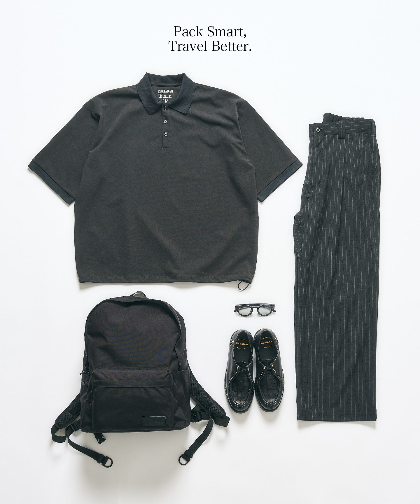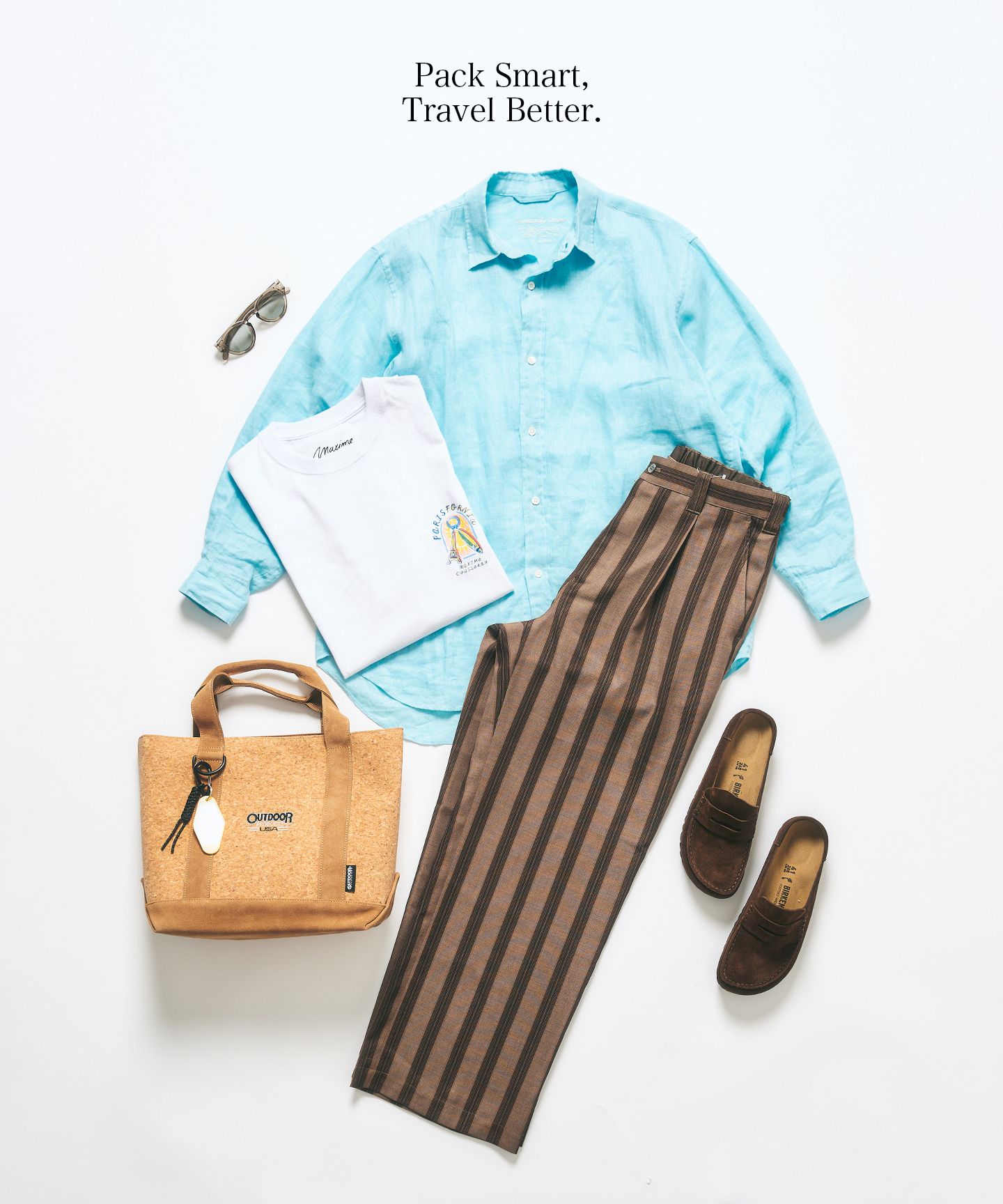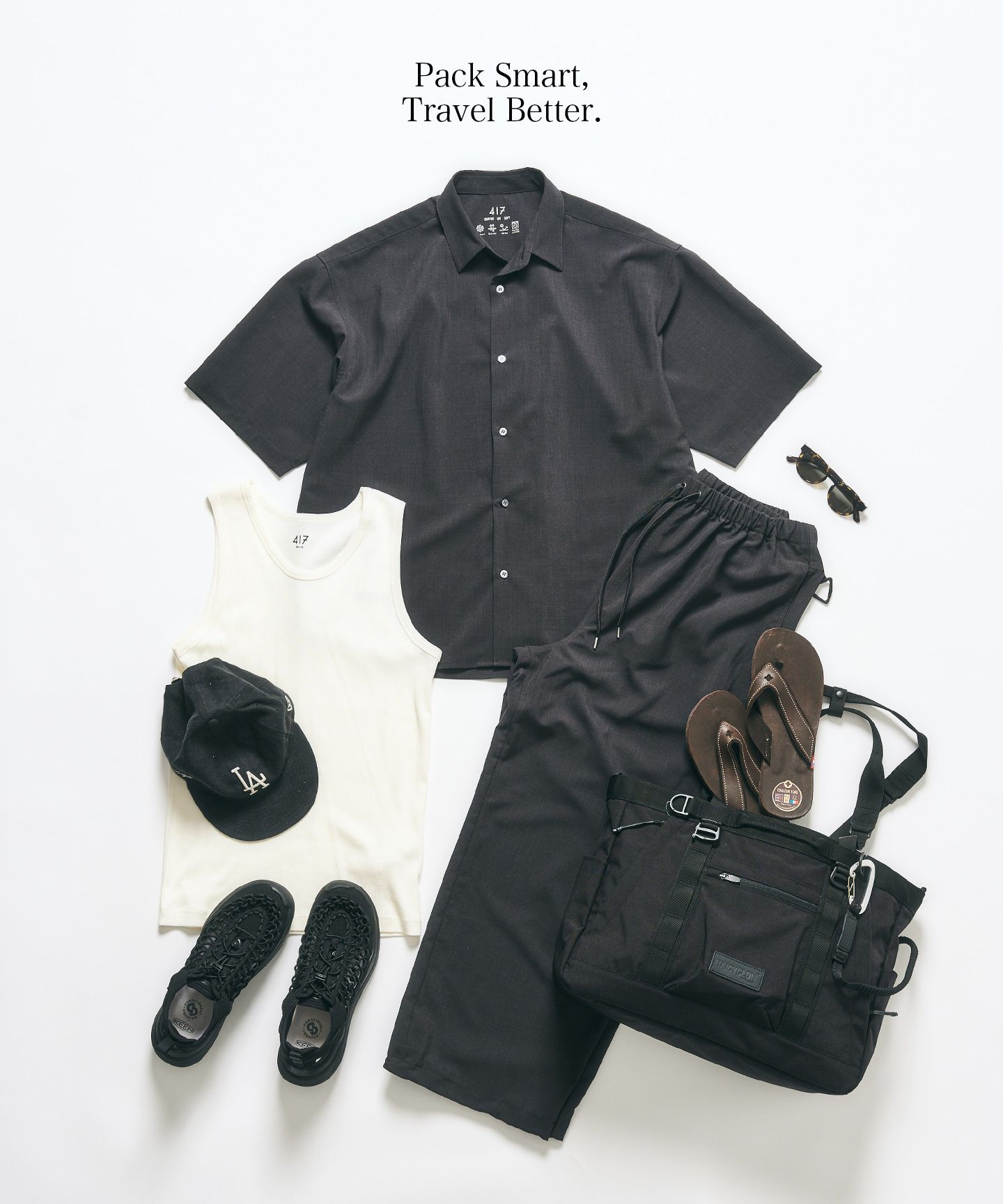 WEB限定のシャツセットアップをベースにすれば、考えずに組んで、ちゃんと成立する。軽さと動きやすさ、どちらも外さないバランス。あとは、このボストンバッグもちょうどいい。一泊分が無理なく収まって、持ち方も変えられる。移動も、そのまま街に出るのも、これでいい。