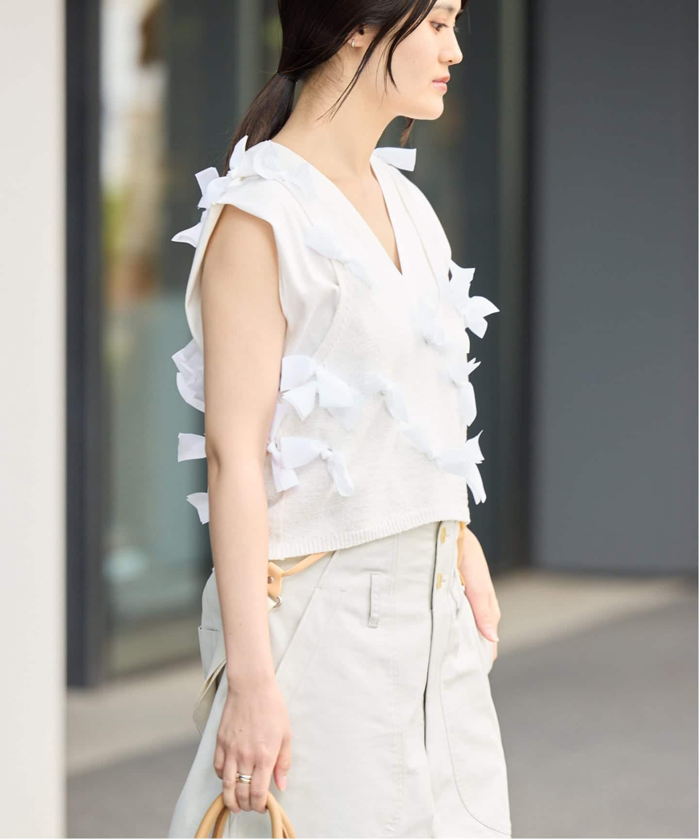 たくさん歩く日は、機能性のあるパンツで軽やかに。リボンのタンクニットで、さりげない女性らしさを添えました。