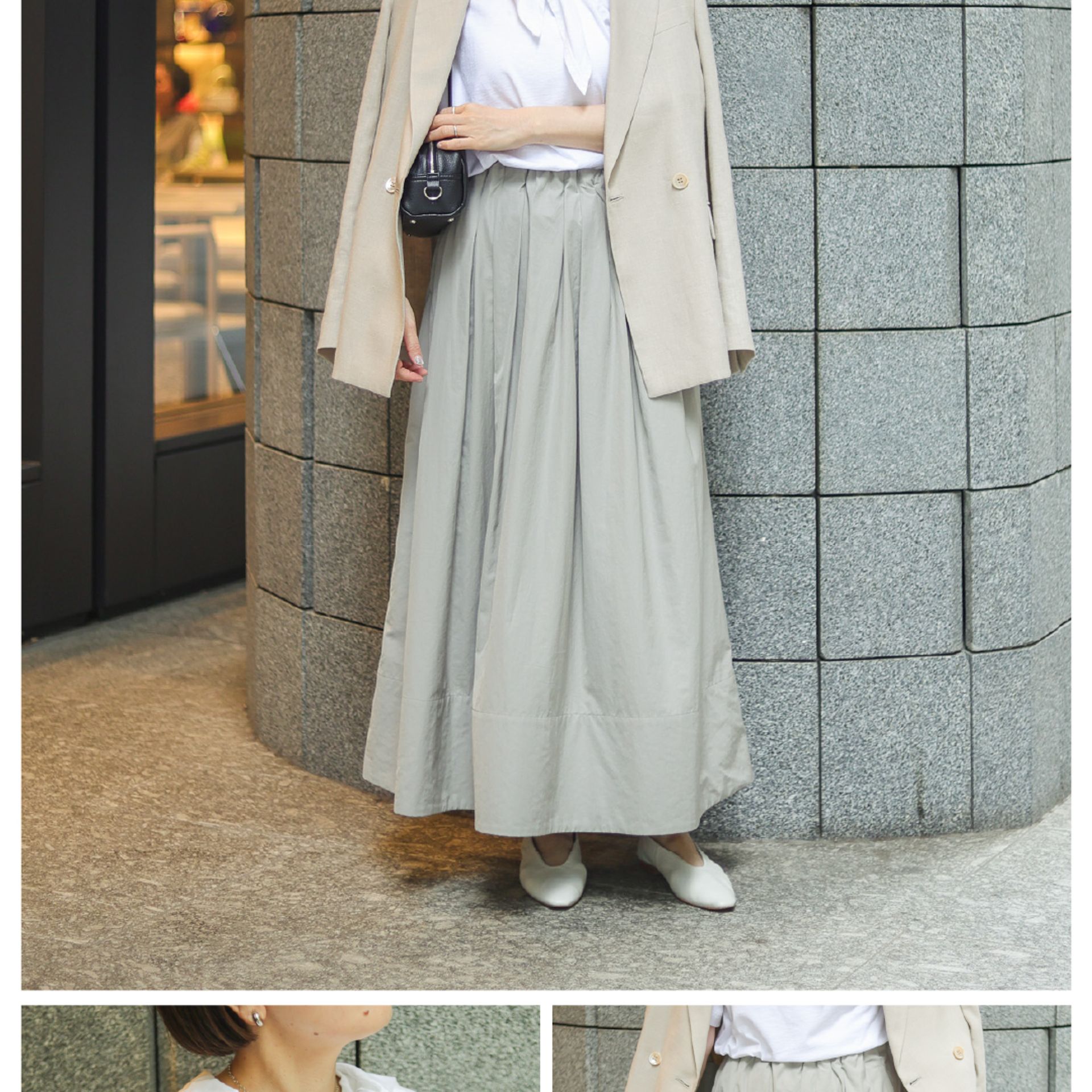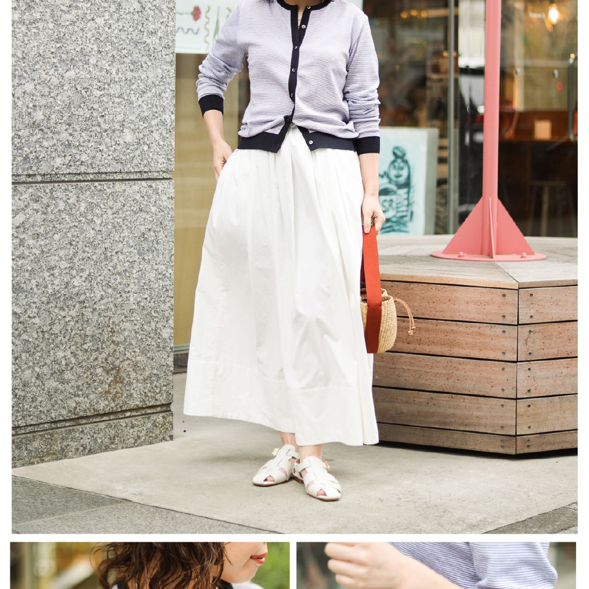 カーディガンは裾をブラウジングして一枚でさらりと、白いスカートを合わせてやわらかくもどこかラフな印象にしました。