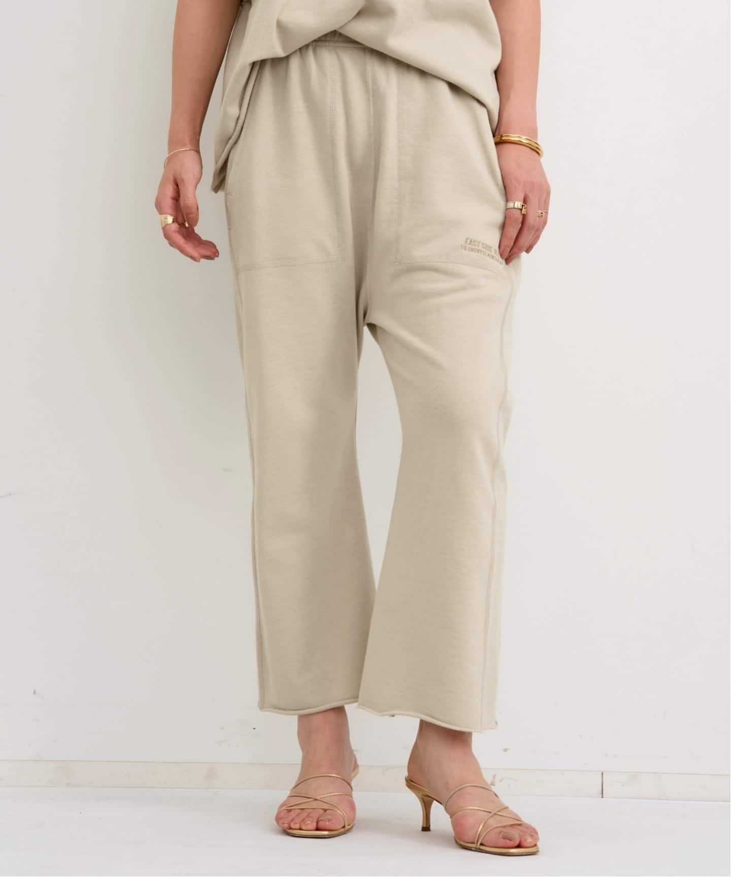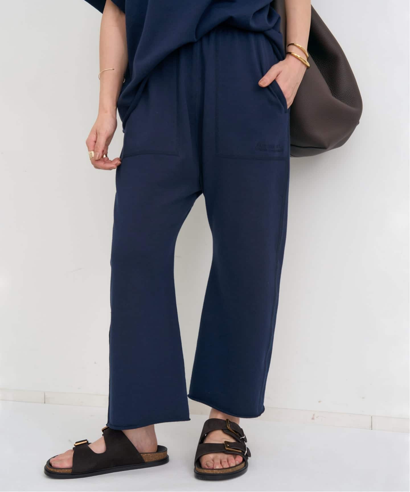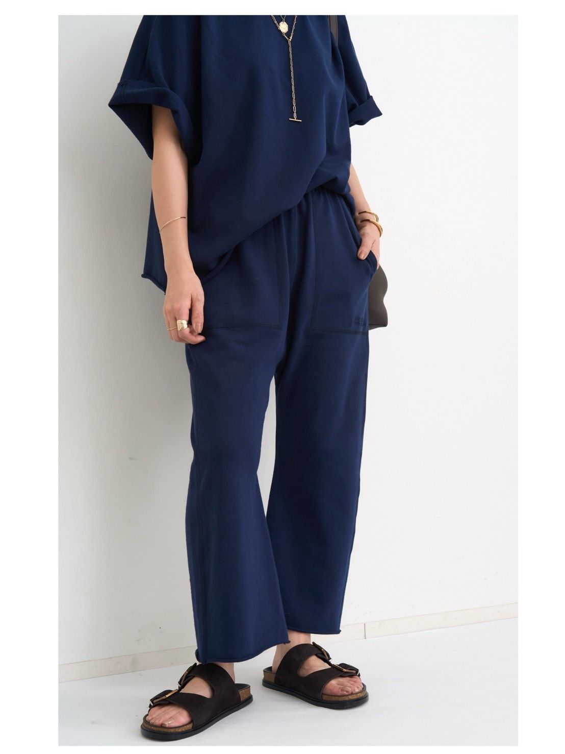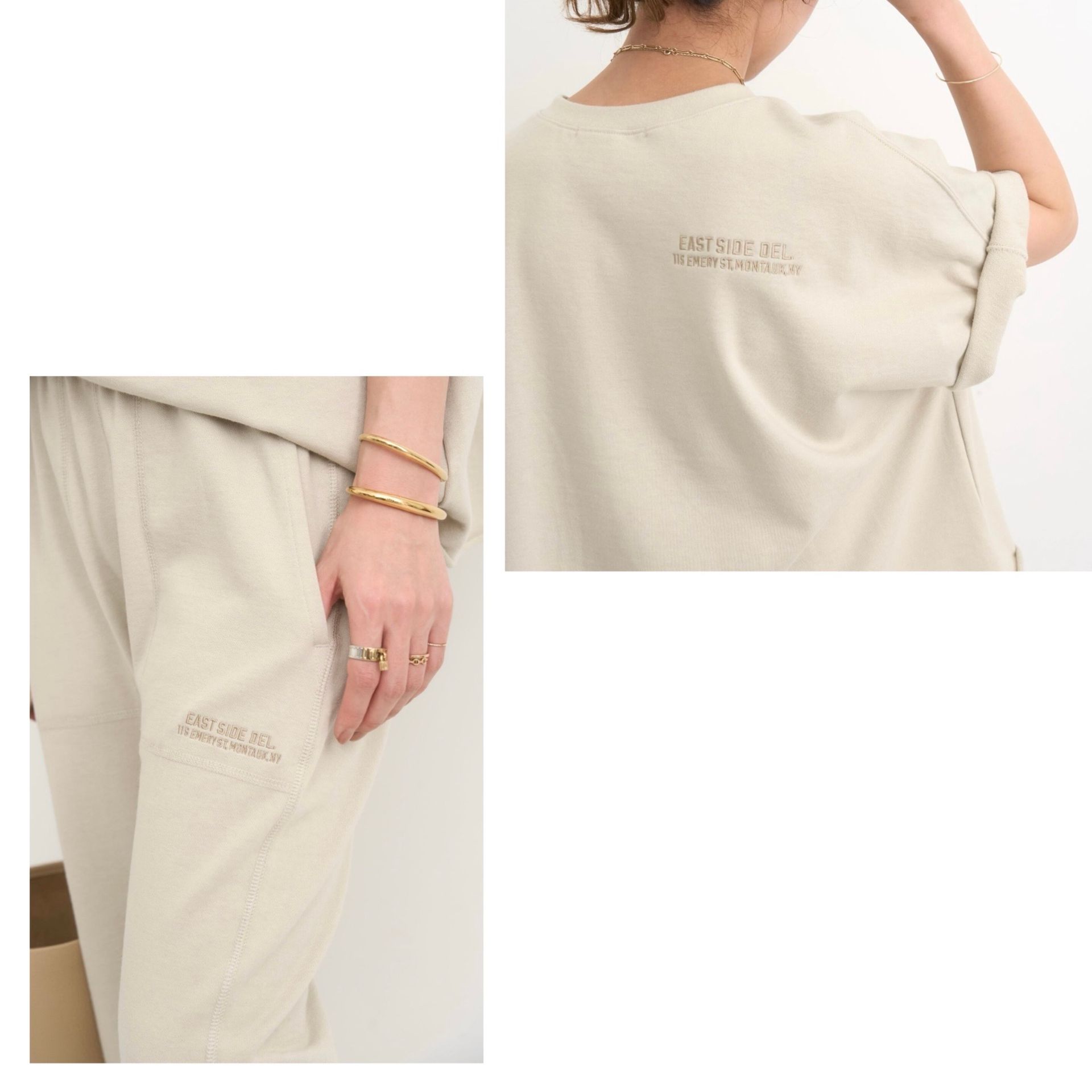 どこか品のある女性らしい佇まいのスウェットパンツはサルエルデザインで程良く抜け感を。それにバランス感を合わせたトップスは、ライトブルーと同じボディでリラックス感のあるシルエットにしています。