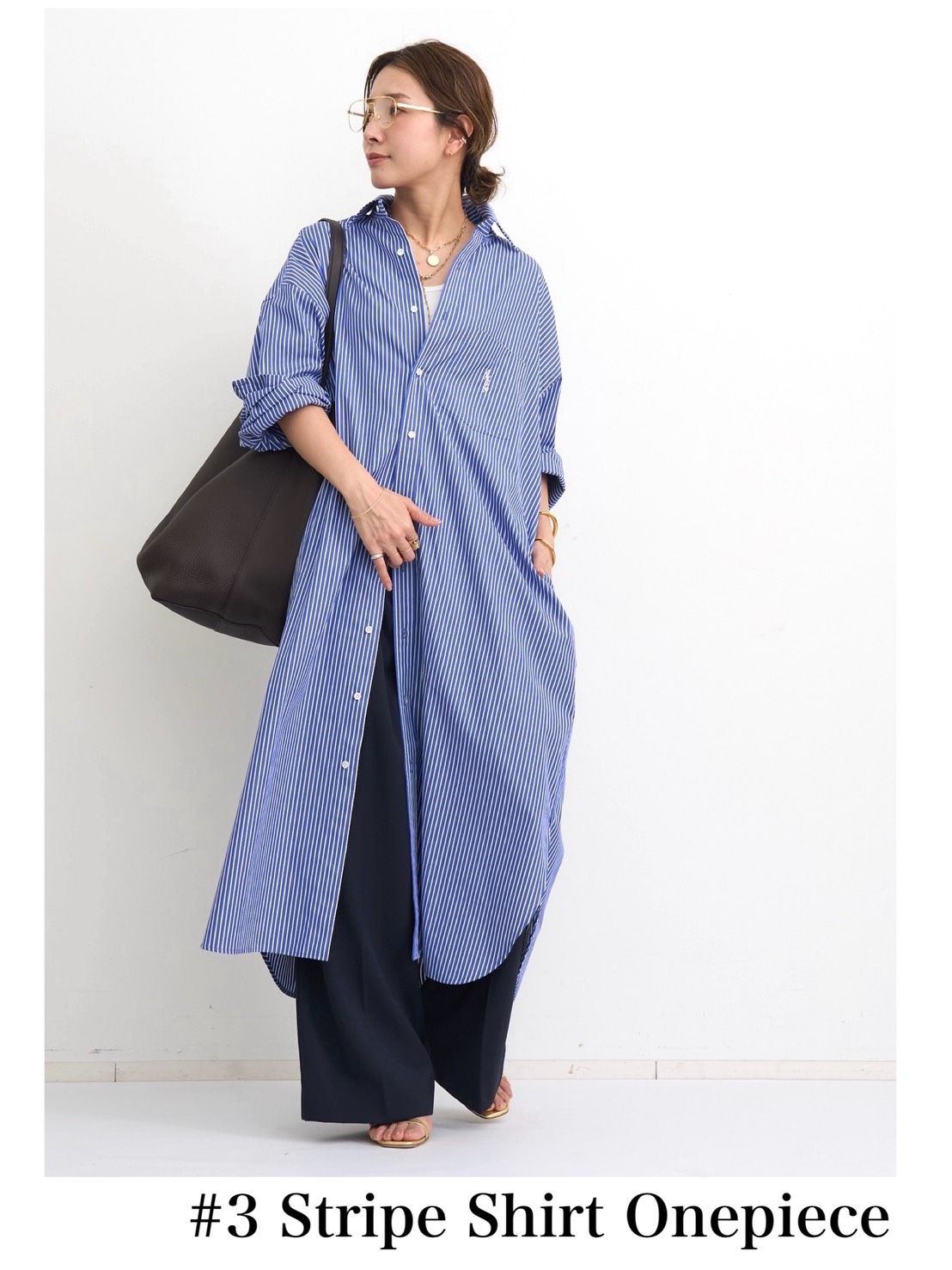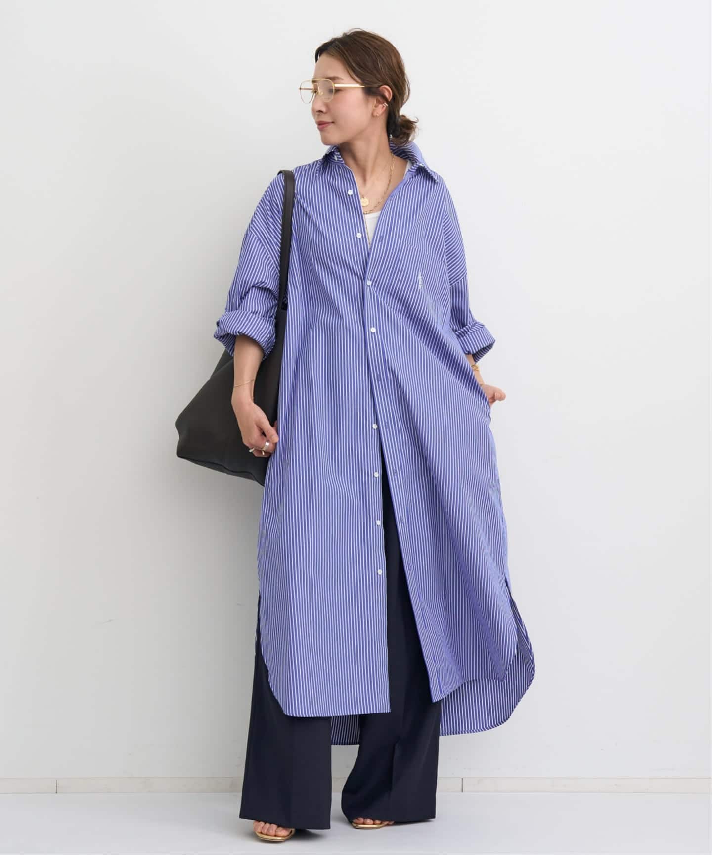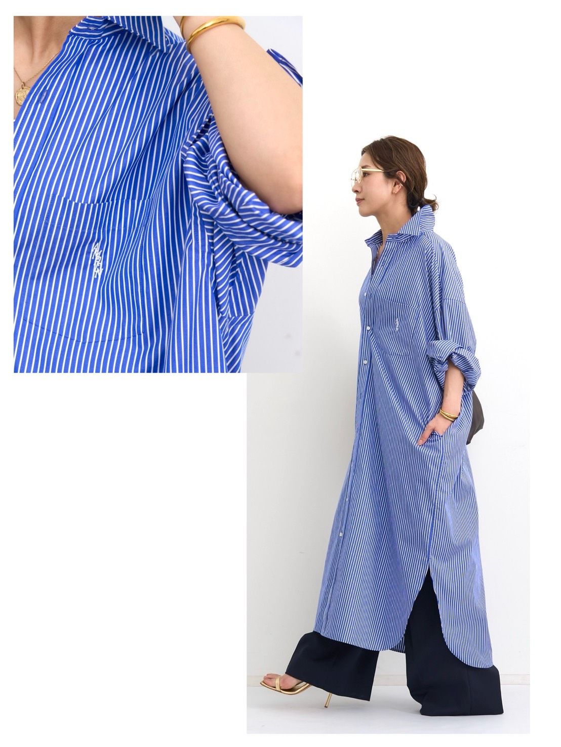清涼感のあるブルーのストライプが印象的なシャツワンピース。