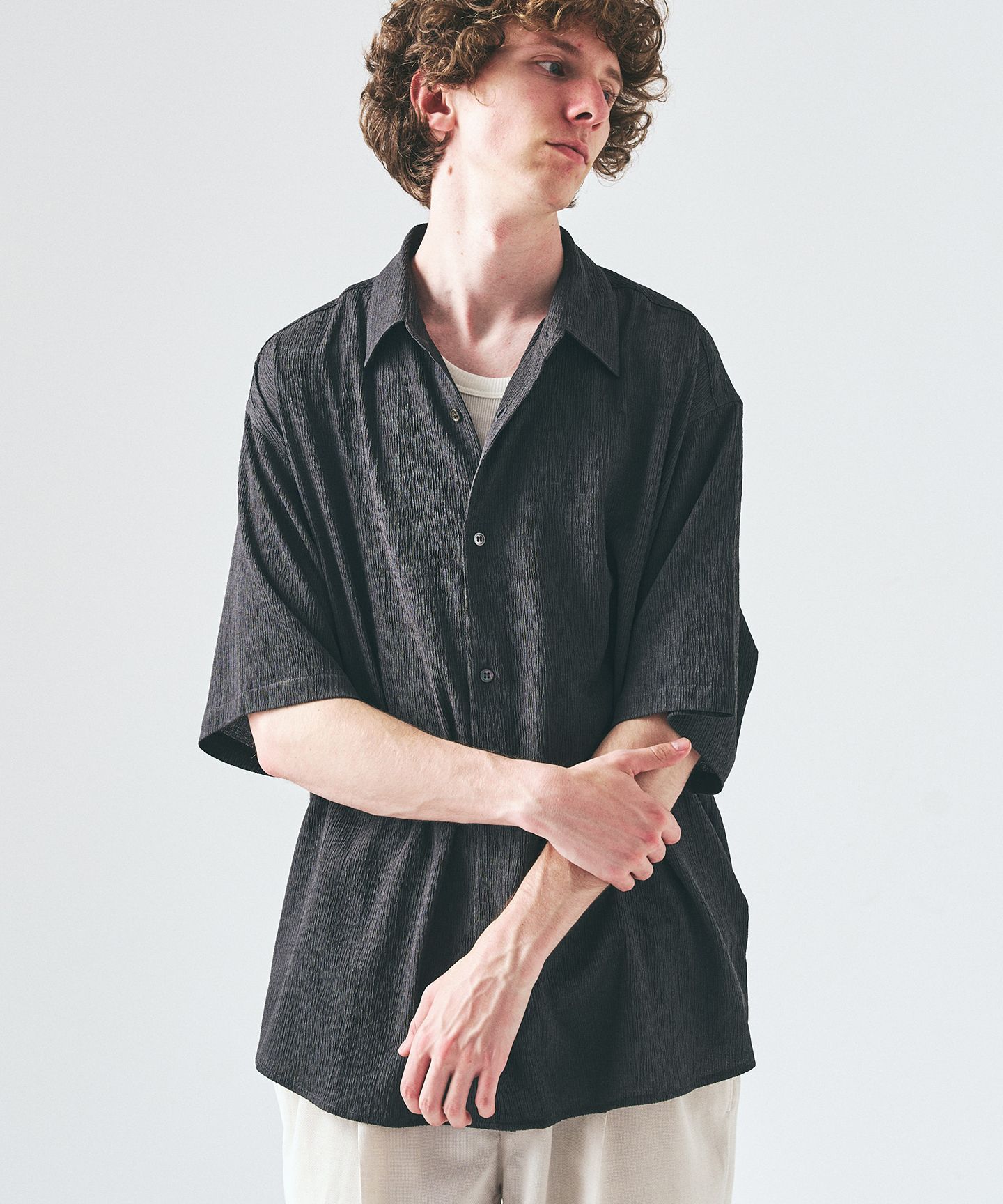 クレープ クロップドスリーブ スキッパーシャツ