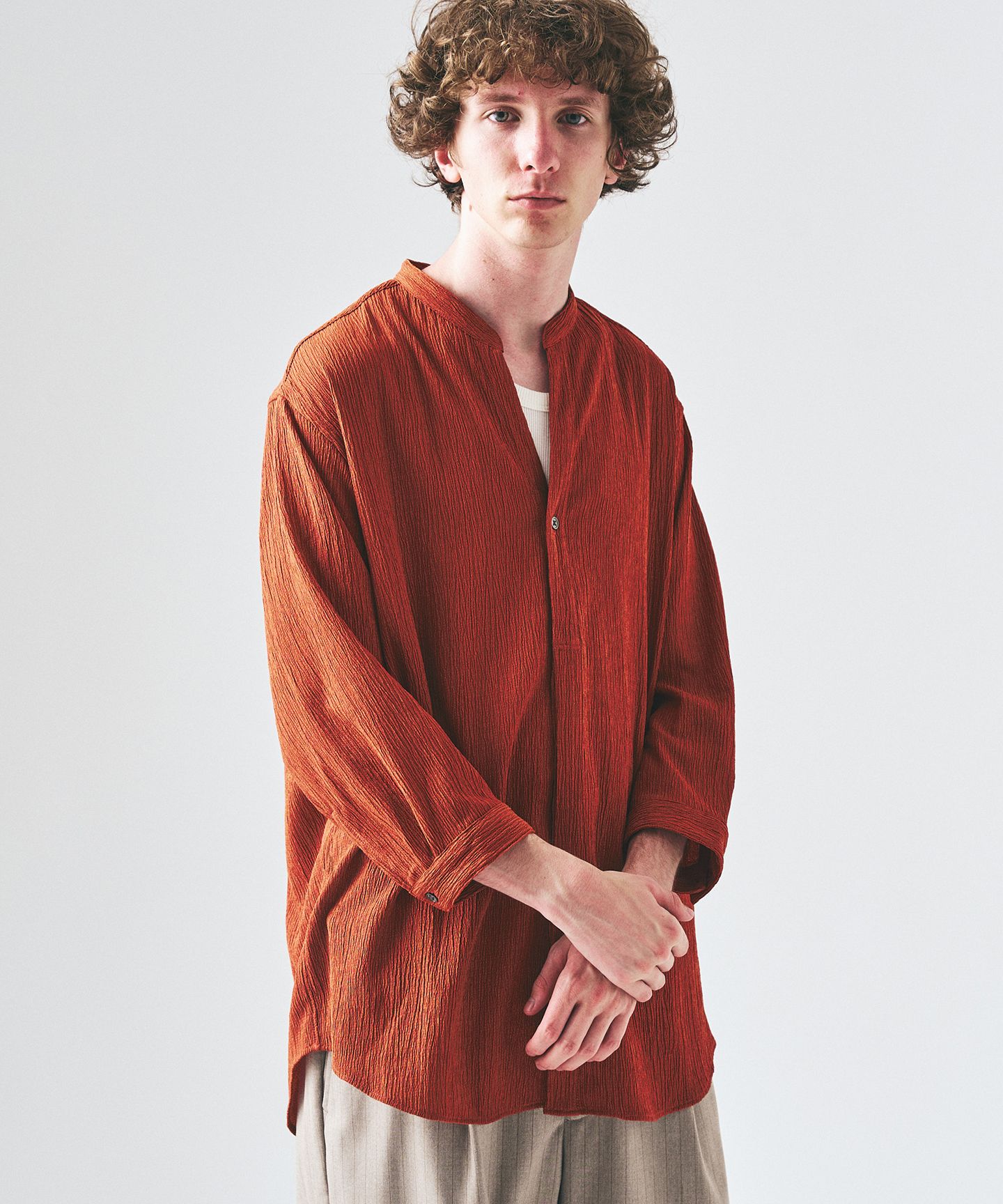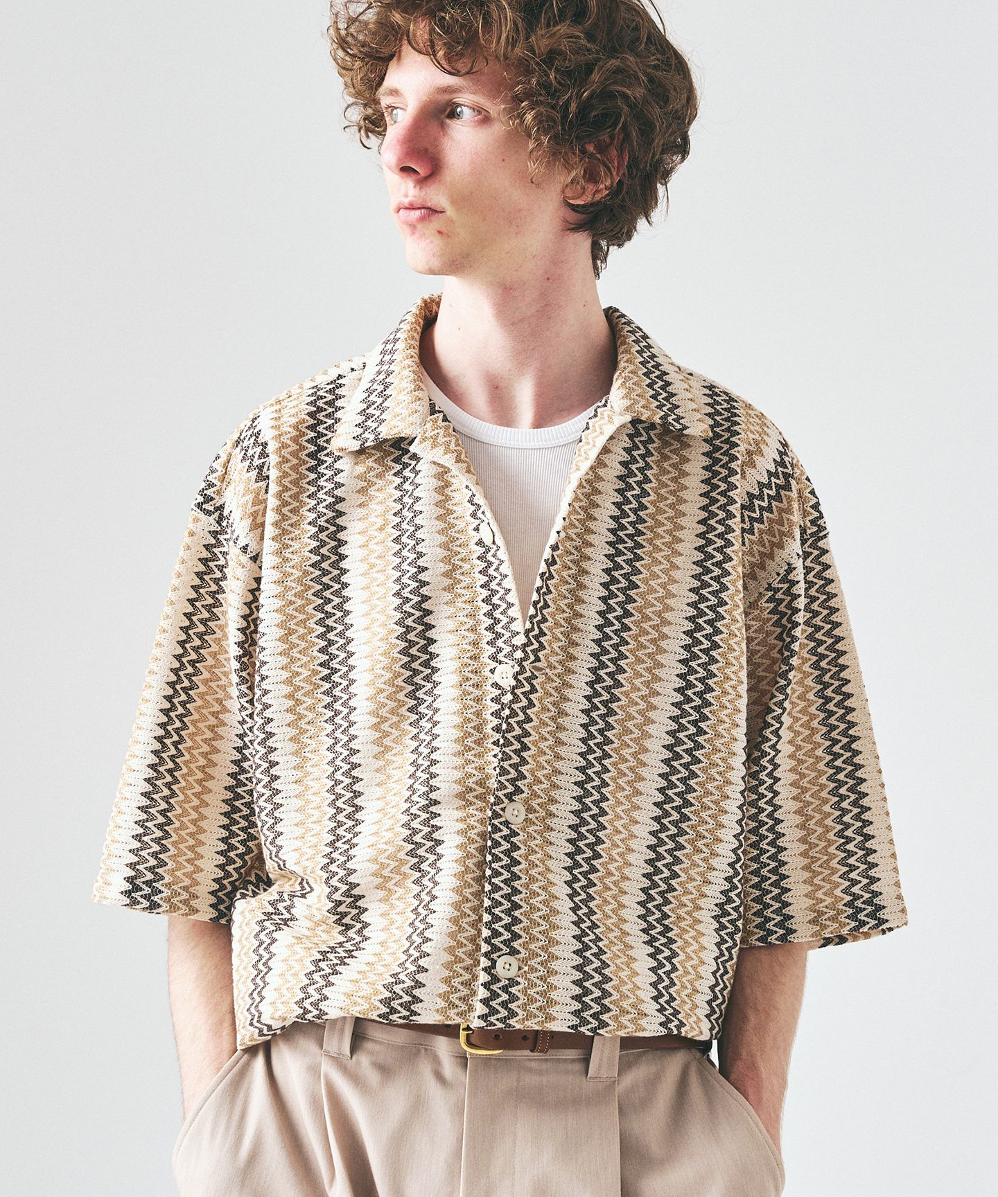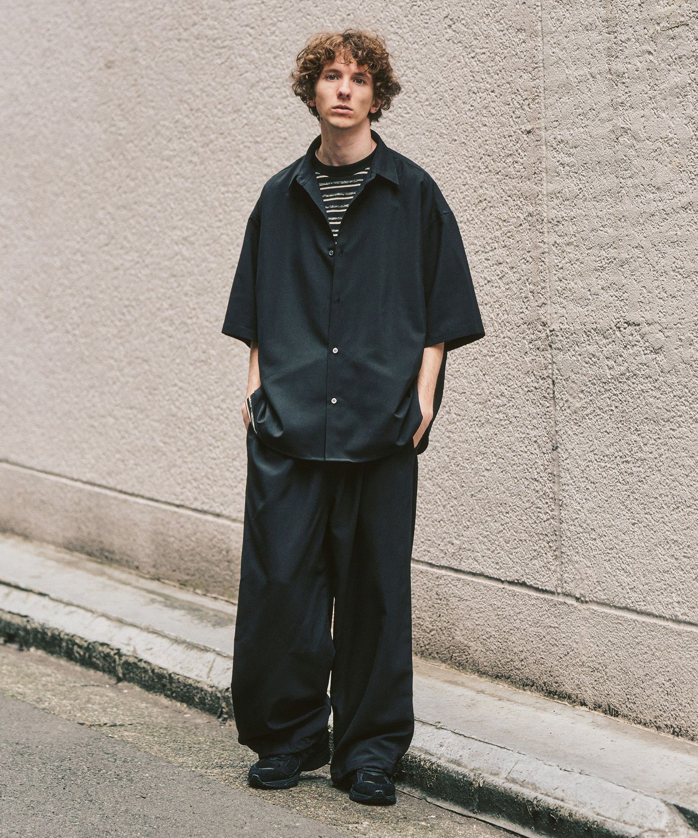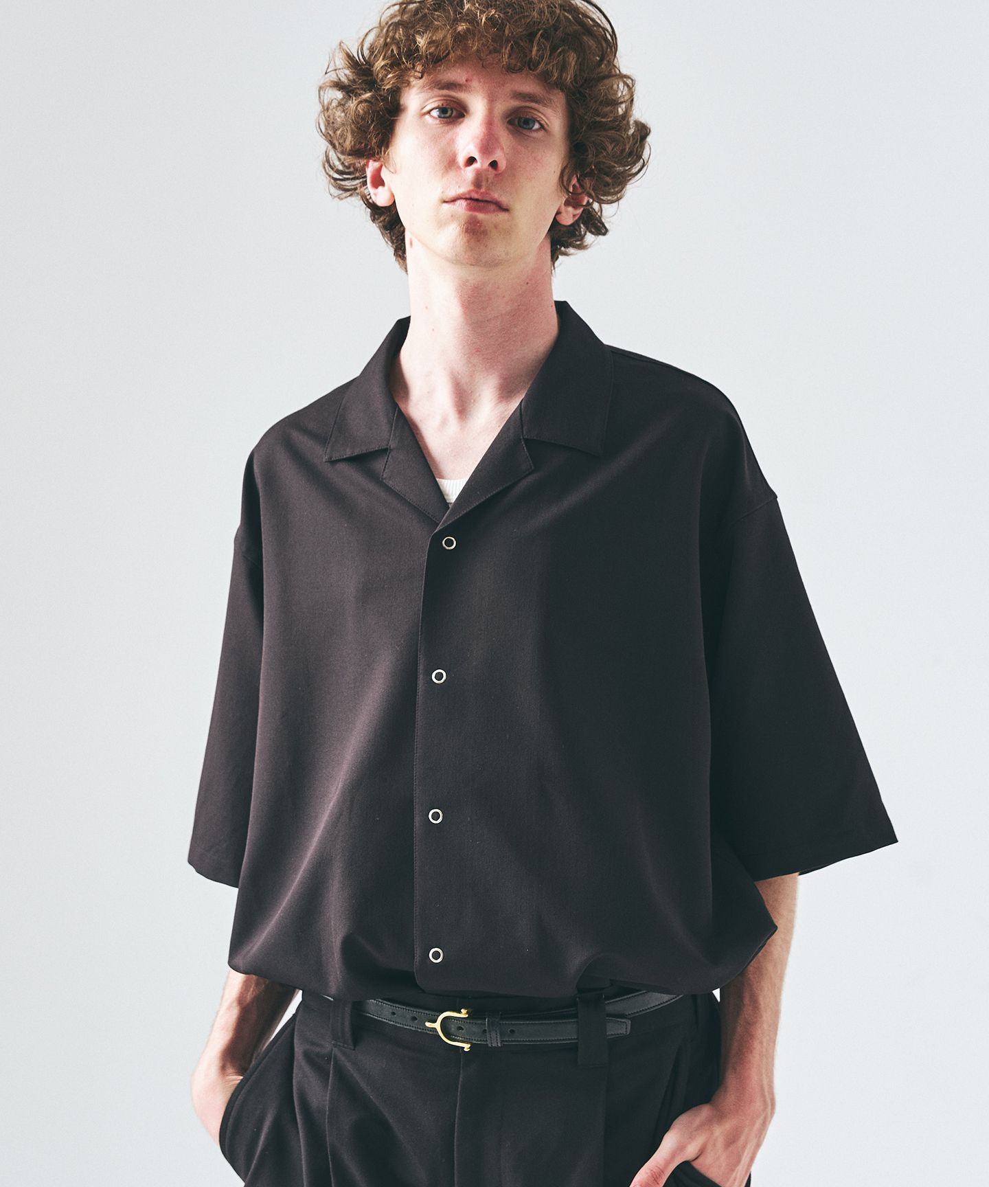 抜け感で、整える。スキッパーの軽さと、短めのバランス。一枚で雰囲気が出る今の一着。