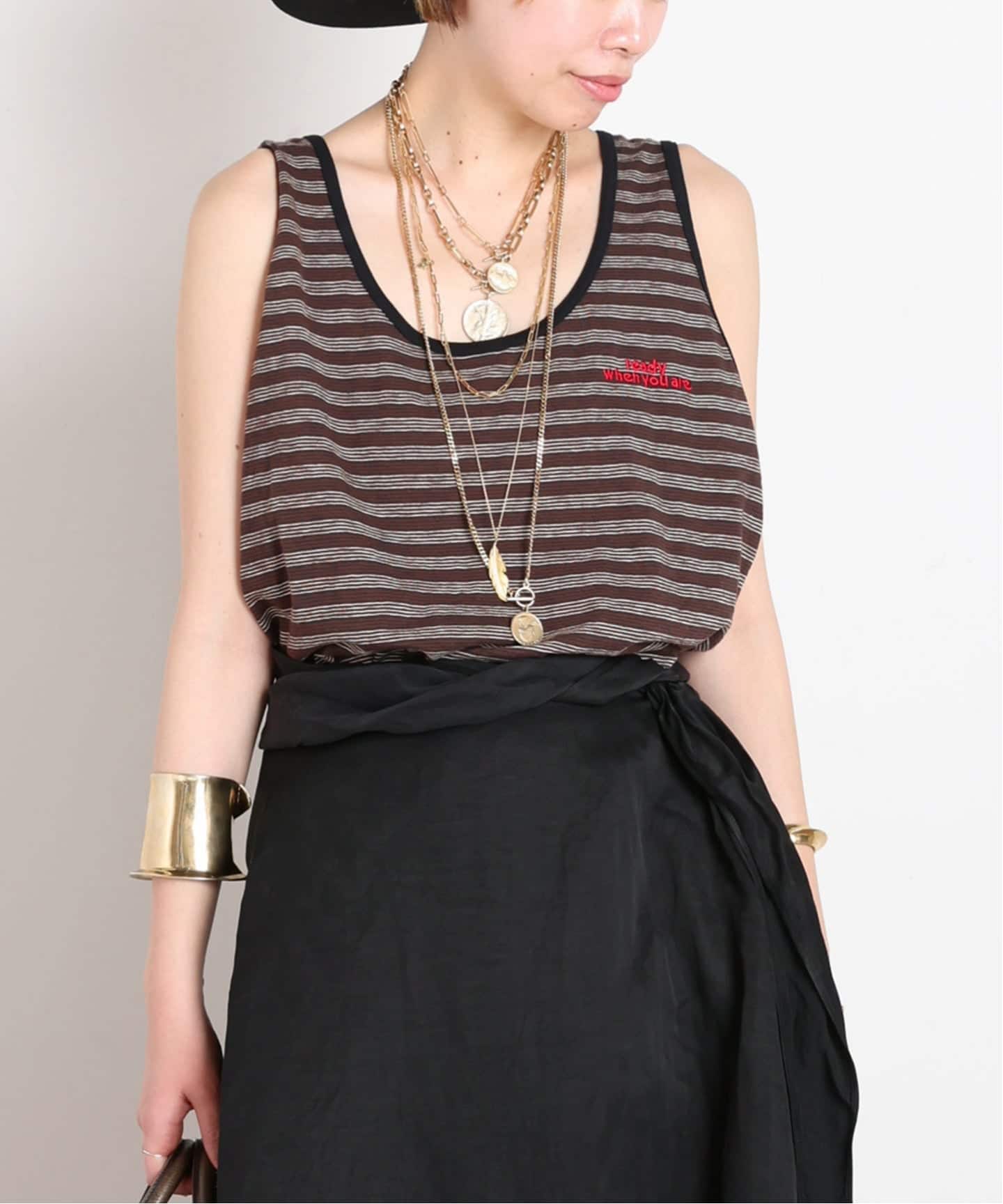 女性らしいムードのボルドーカラーは、今年らしいマルチボーダーに合わせてカジュアルダウンして着こなしたい。