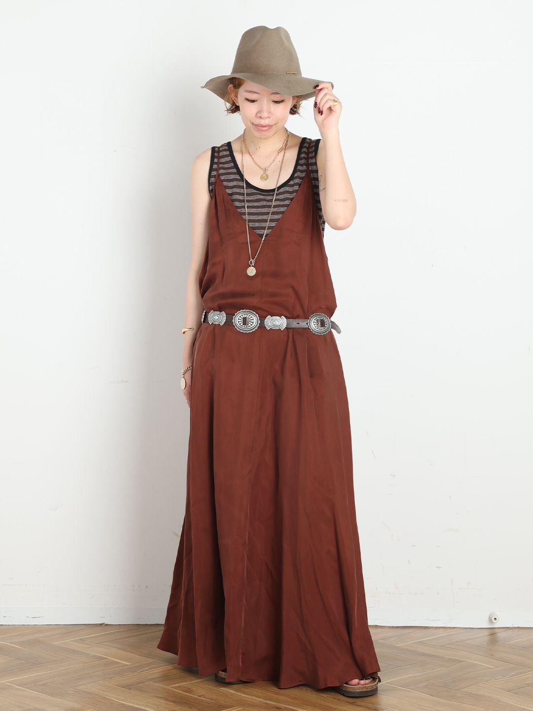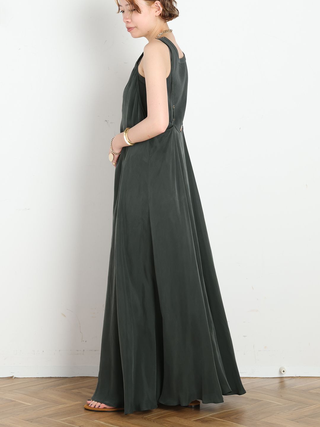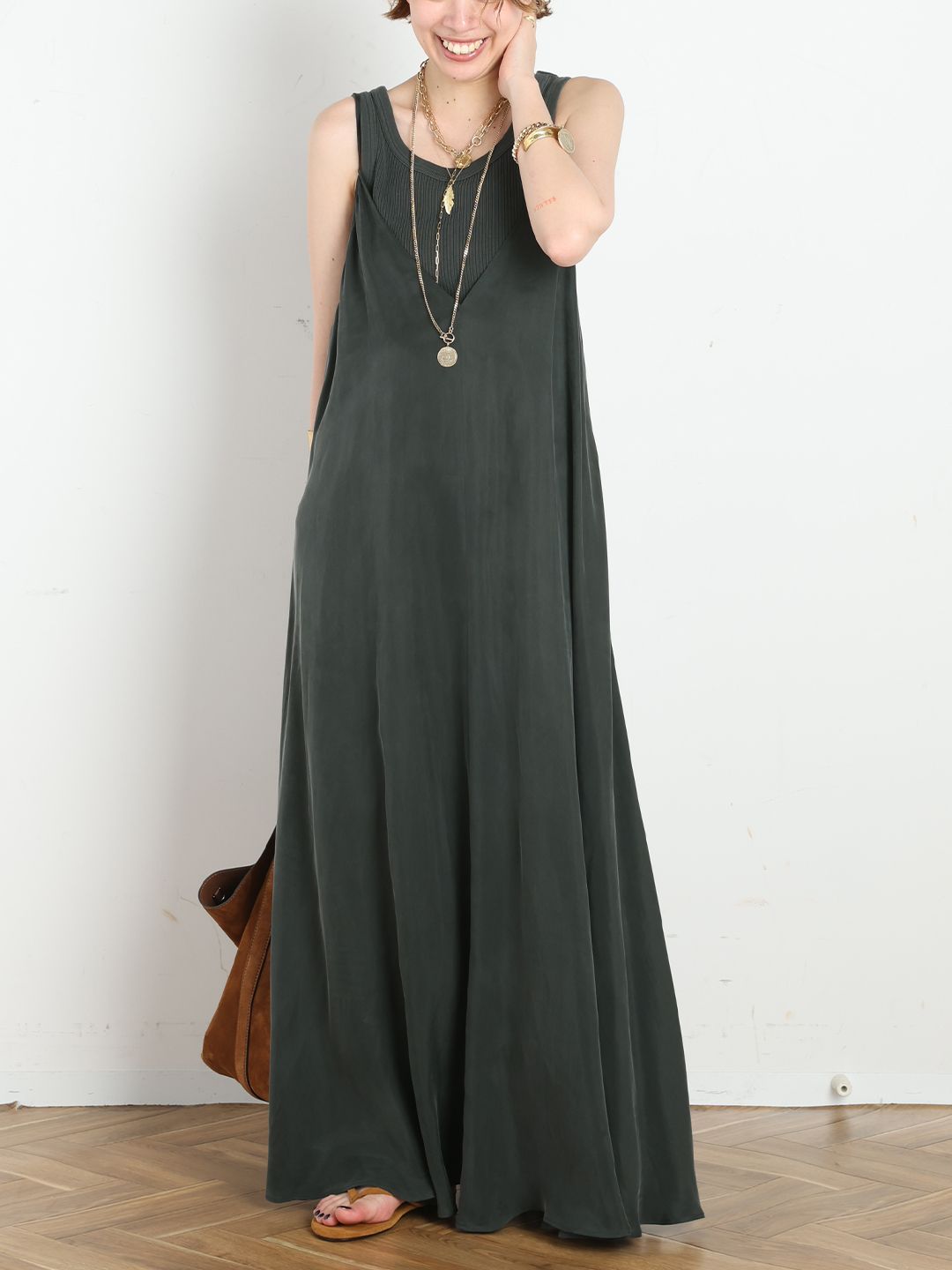 細いストラップに、Vネックのデザインがどんなインナーにもマッチするフレアワンピース。