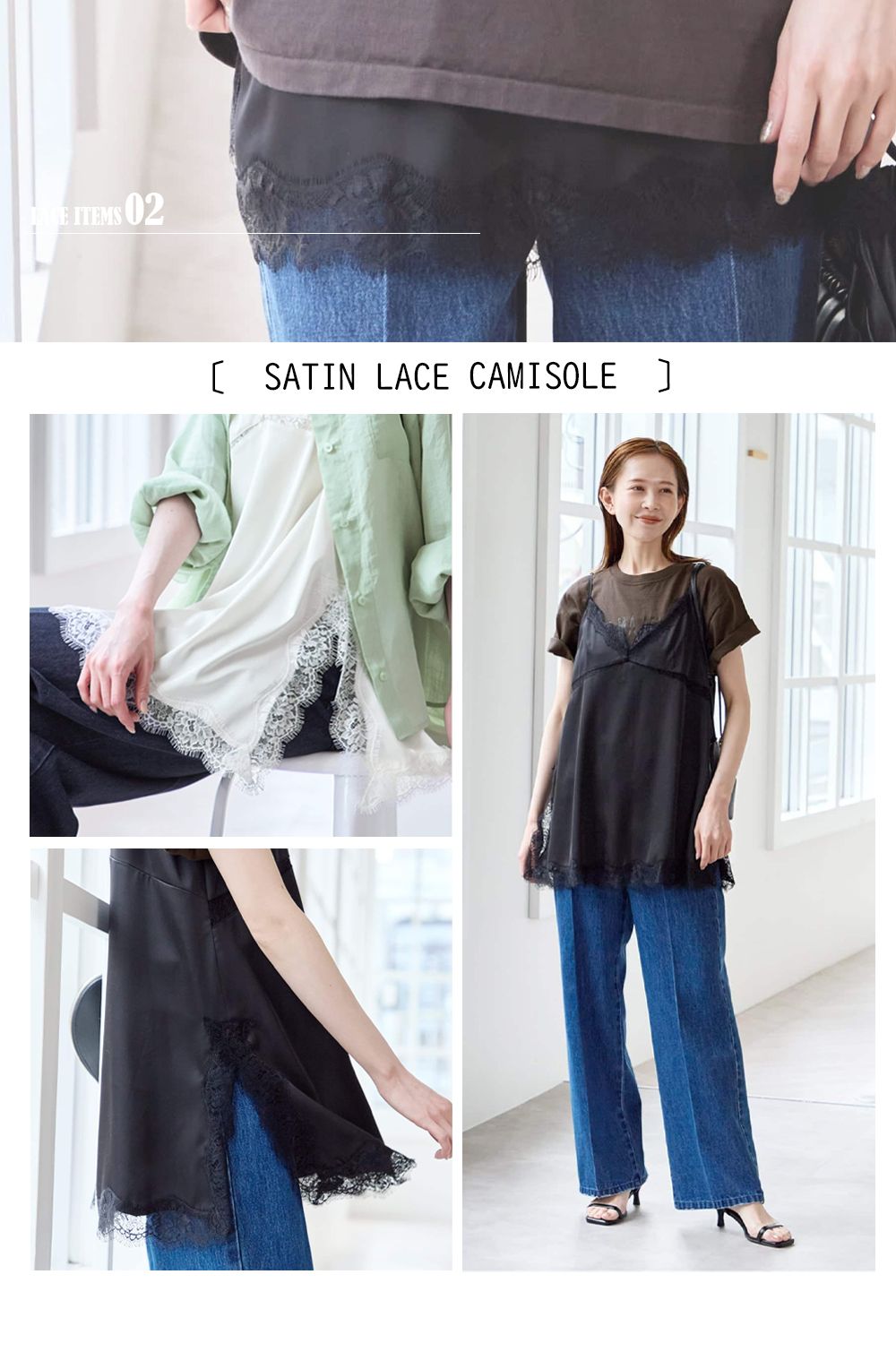 繊細なレースとマットなサテン素材で、カジュアルにも馴染む万能アイテム。