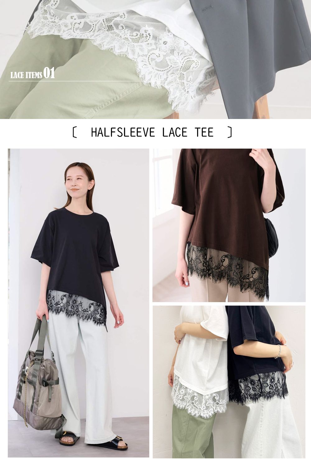 斜めにあしらったレースがアクセントになり、シンプルながらも今っぽく決まる一枚。