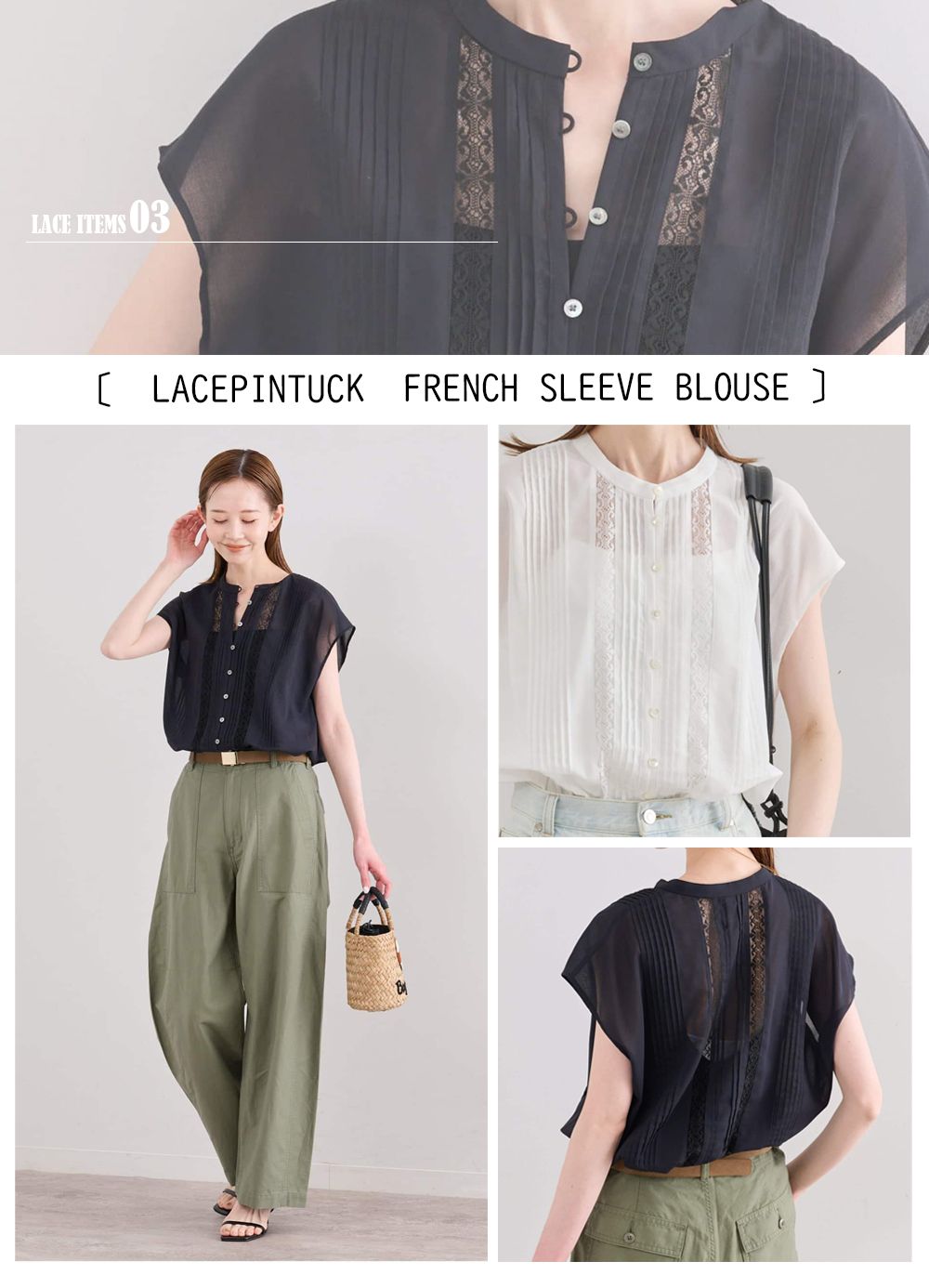 華奢なレーステープやタックが立体感を生み、カジュアルにも馴染む一枚。