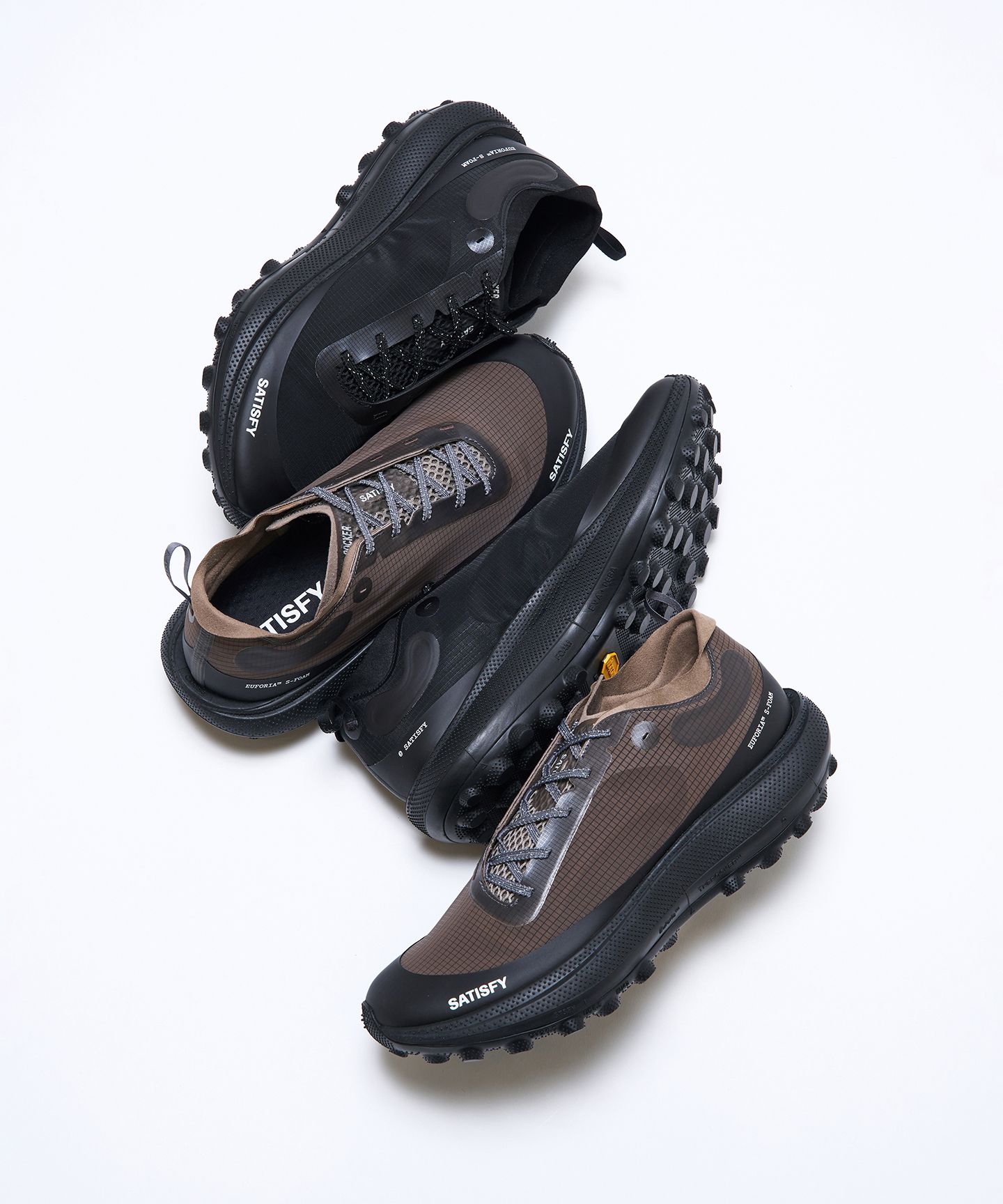 SATISFY が開発したテクノロジー、TuneLug、Euforia、Rippy 66 を搭載したシューズ。