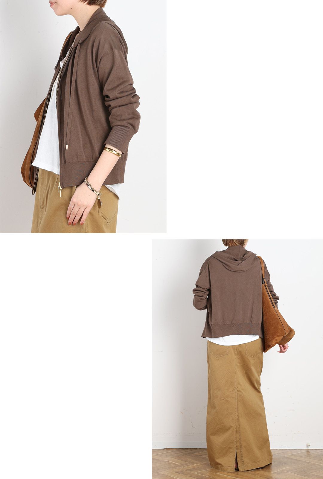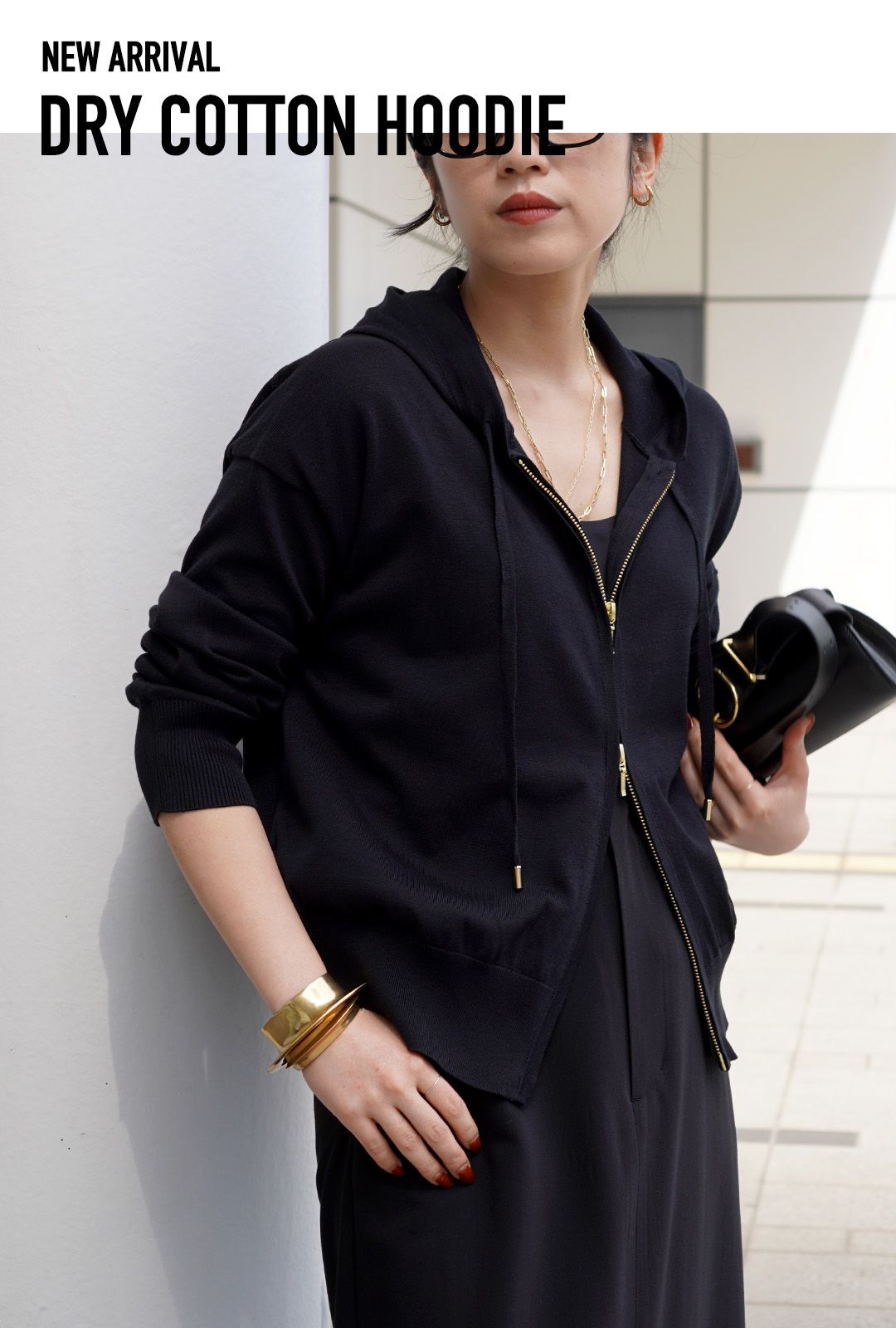 ジップなどの金具をゴールドにすることで上品な印象に。
