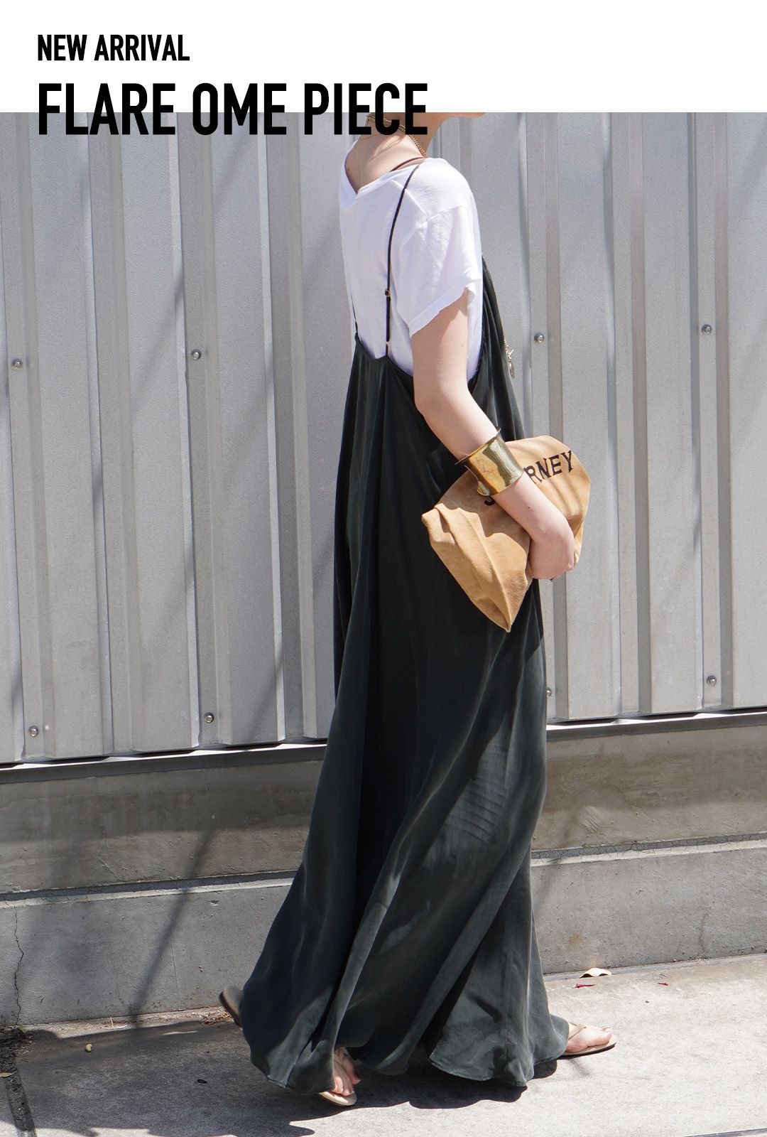 華奢なストラップにVネックラインのフロントが、どんなインナーともバランスが取りやすい。