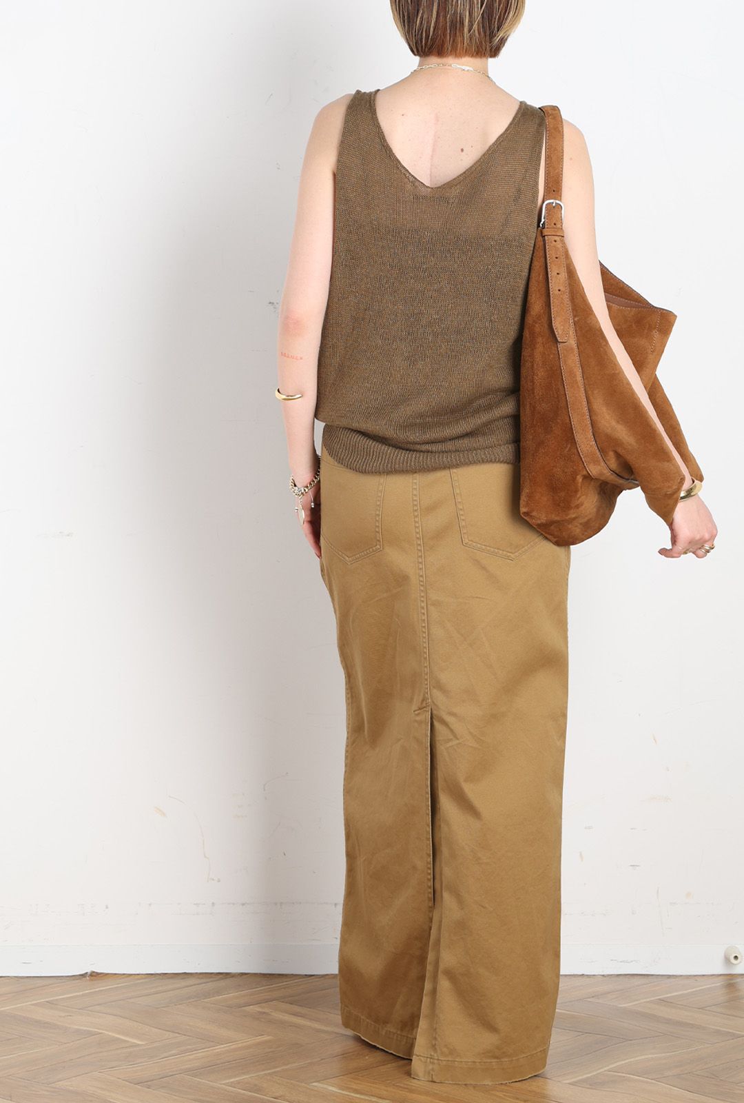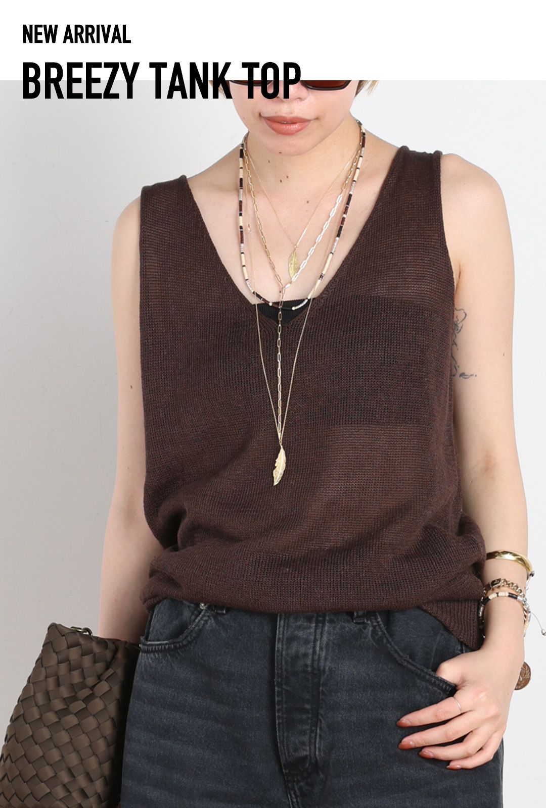 リネンをざっくり編んだ涼しげなタンクトップはこれからの暑い夏にぴったり。