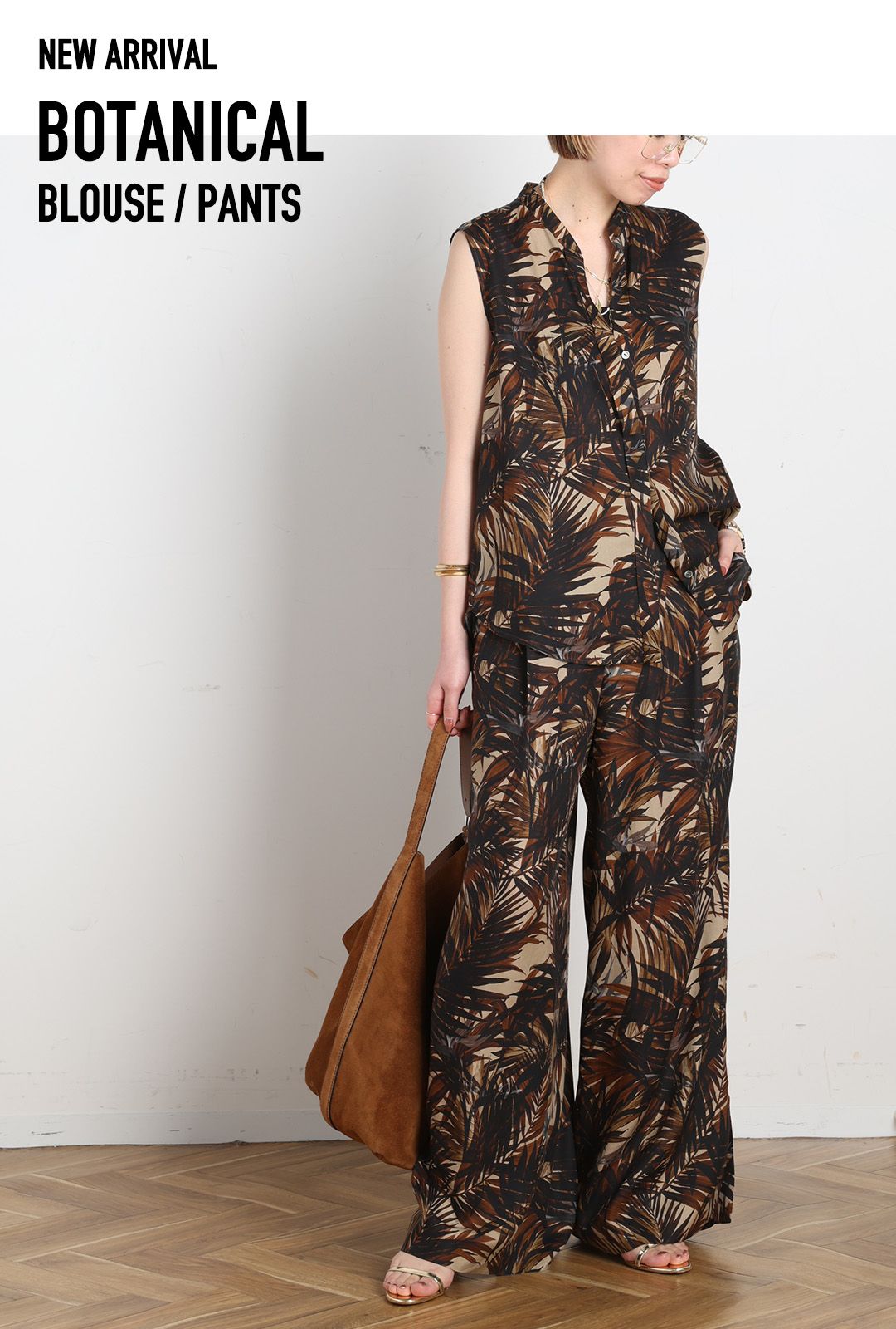 シーズンらしい大胆なボタニカル柄が印象的なブラウスとパンツのセットアップ。