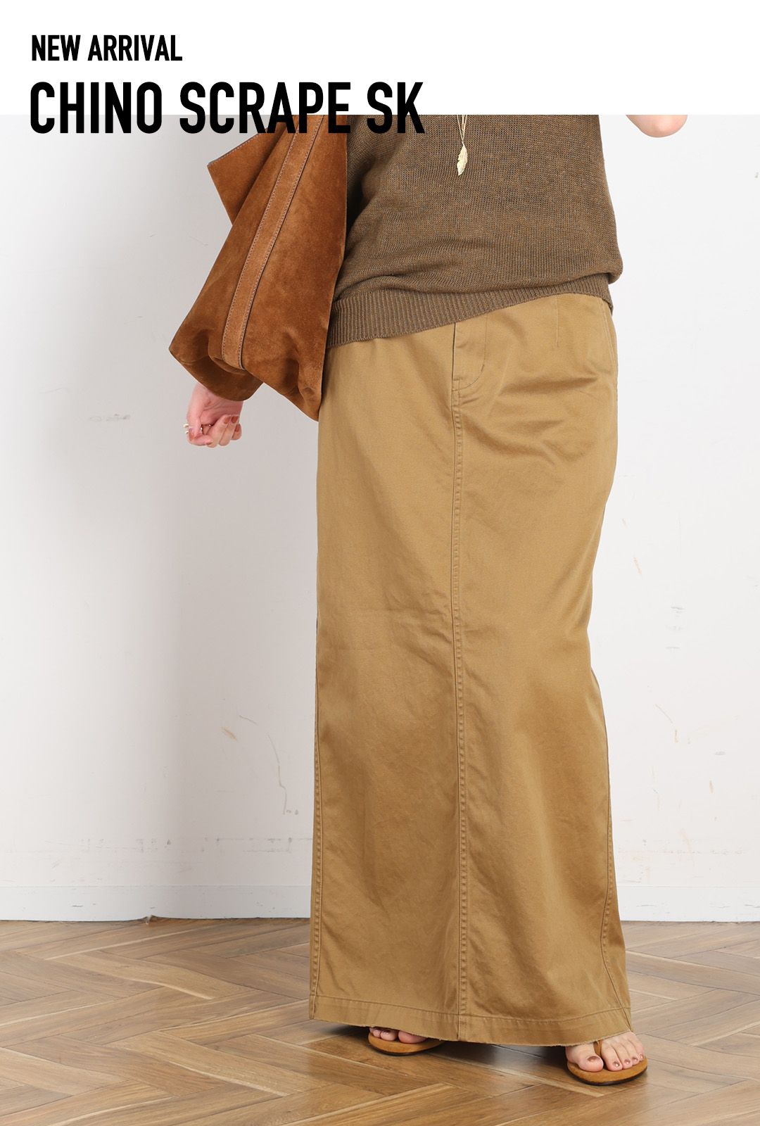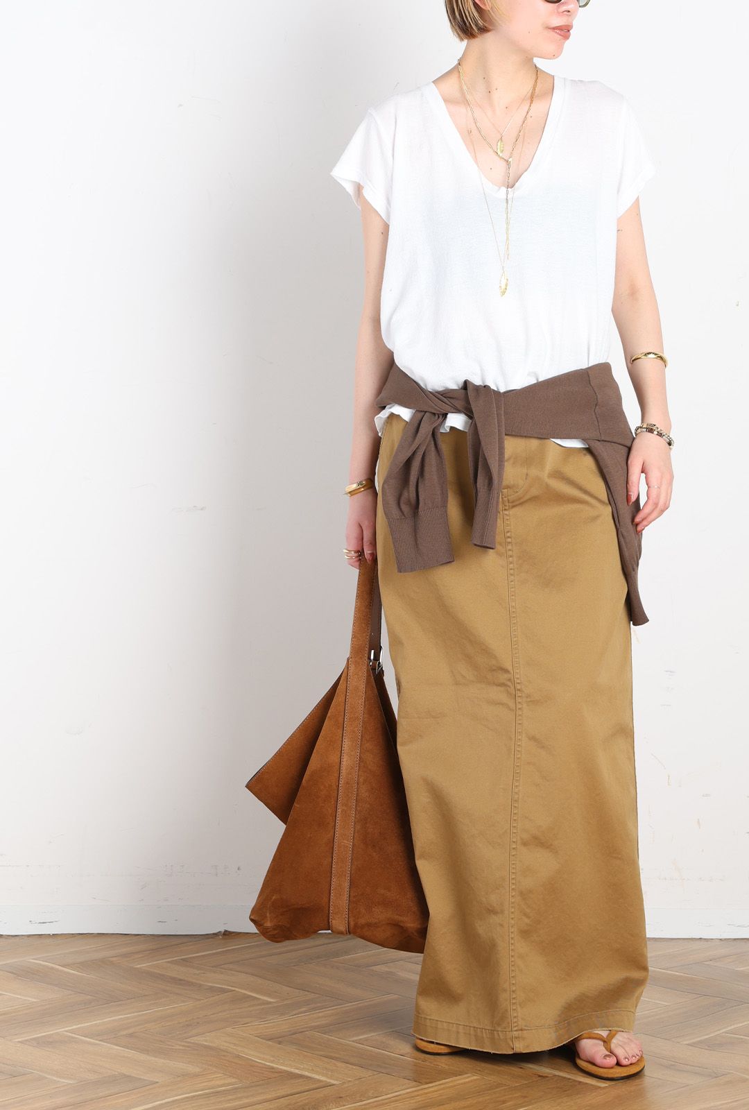 夏のカジュアルスタイルを女性らしくこなせるチノスカート。