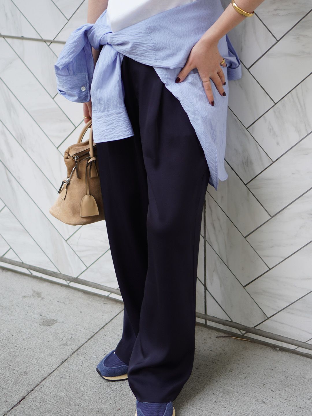 太すぎないワイドストレートシルエットのパンツなら、脚がまっすぐ、綺麗に見える。
