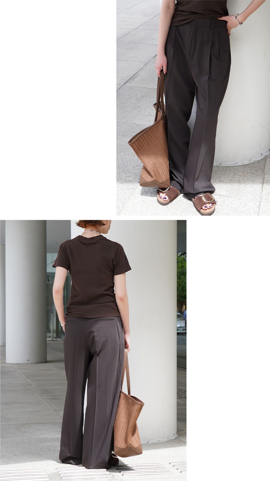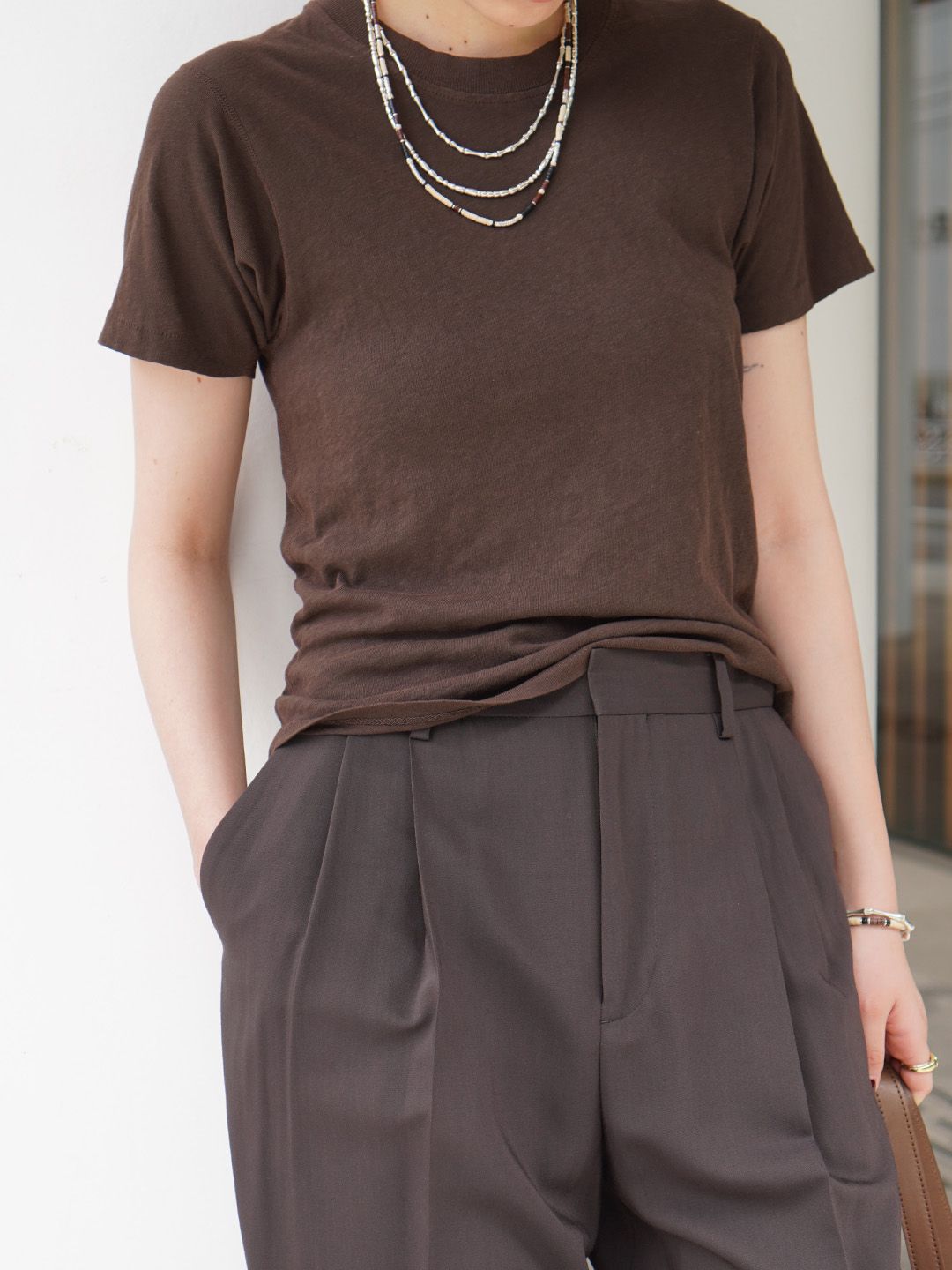 白よりも落ち着きがあり、黒よりもマイルドにまとまるブラウンでベーシックをアップデートして。