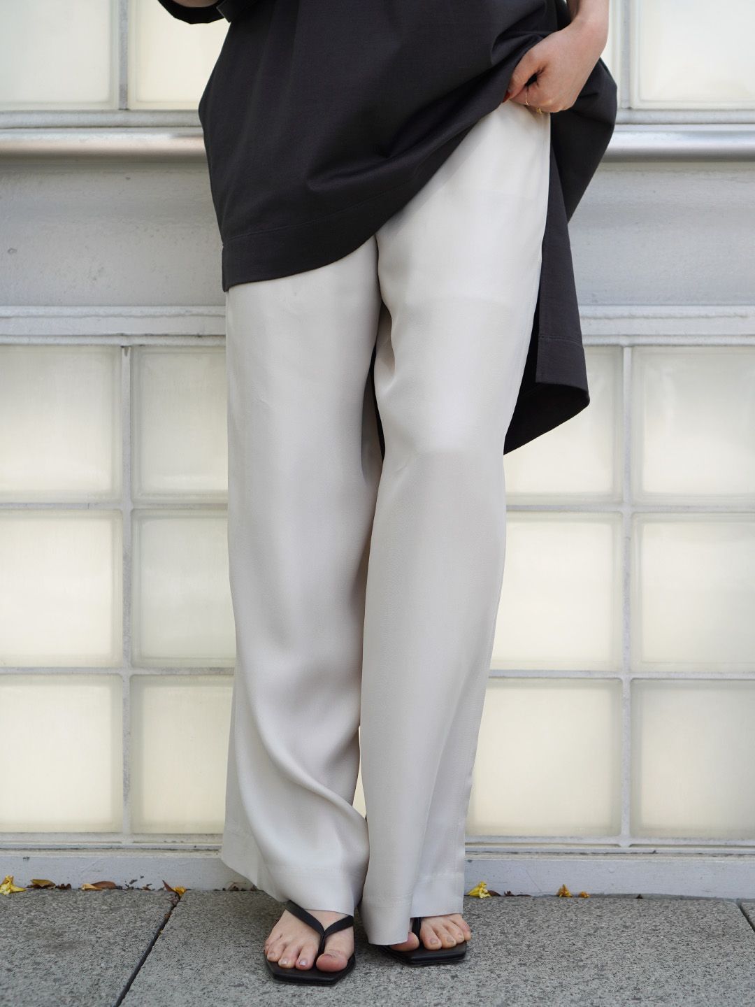 カジュアルなイメージの多いイージーパンツも、光沢のあるシルクとこなれたレーヨンの素材なら品の良さを保ってくれる。