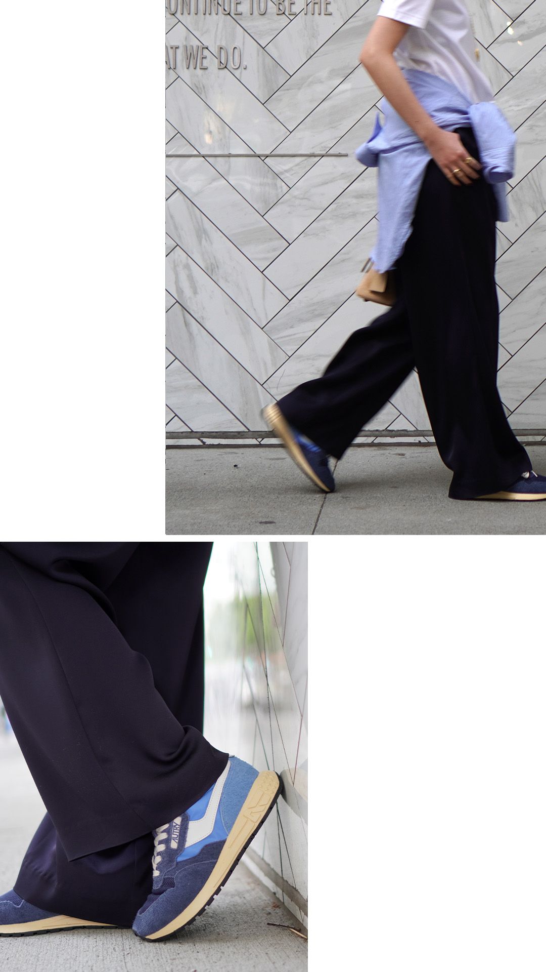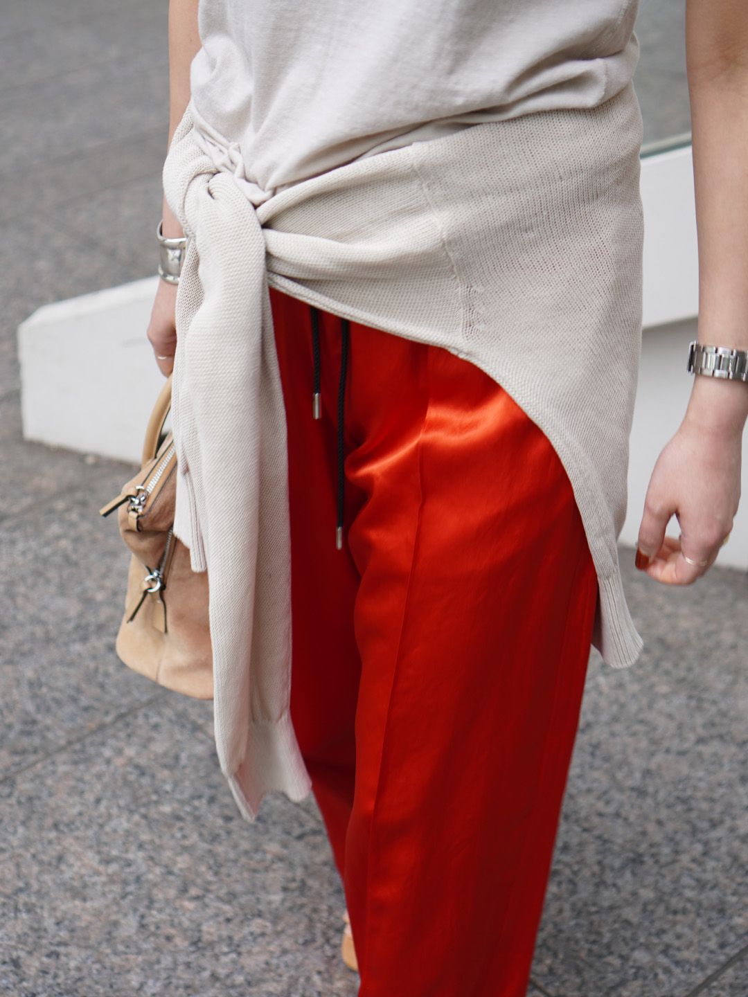 しなやかなサテン素材を使用したパンツは、歩く姿を軽快に。