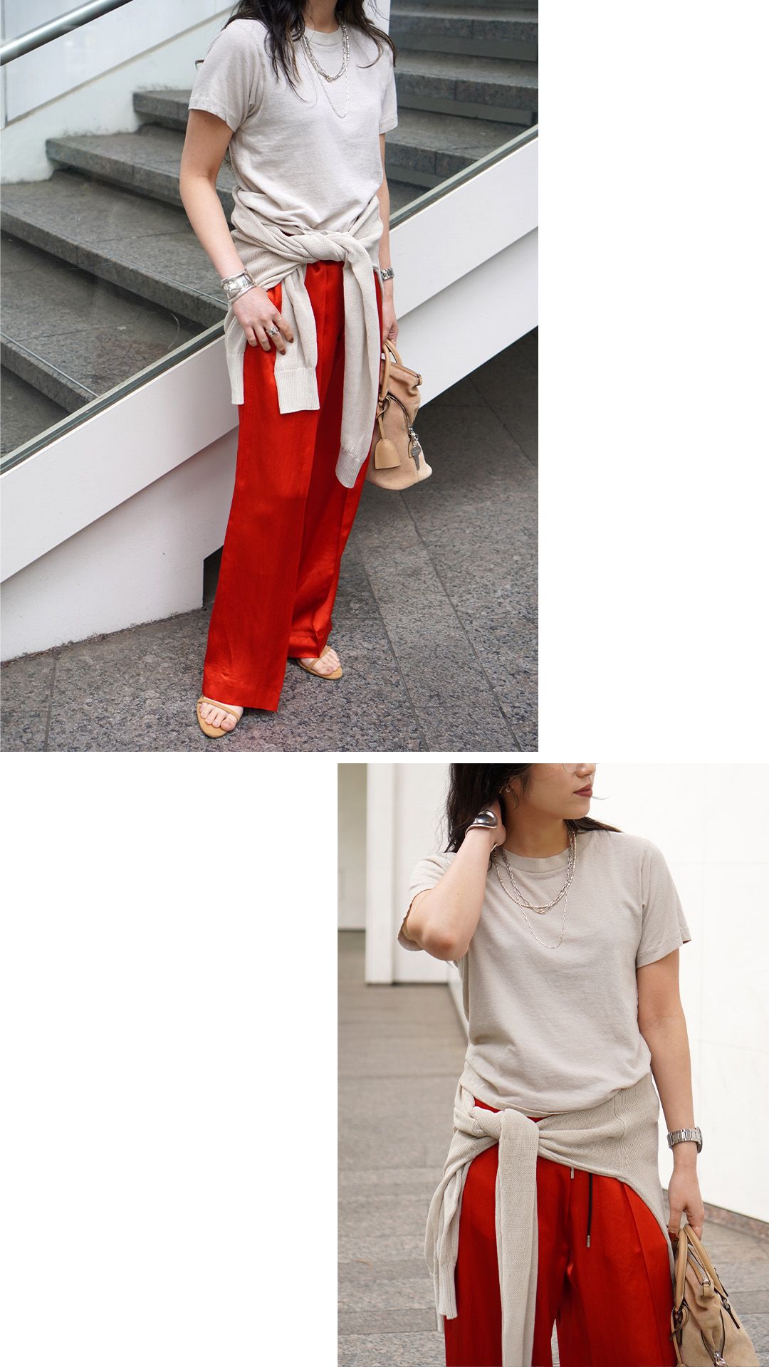 一見強気な色も、ニュアンスのあるベージュと馴染ませれば、どこか女性らしい。