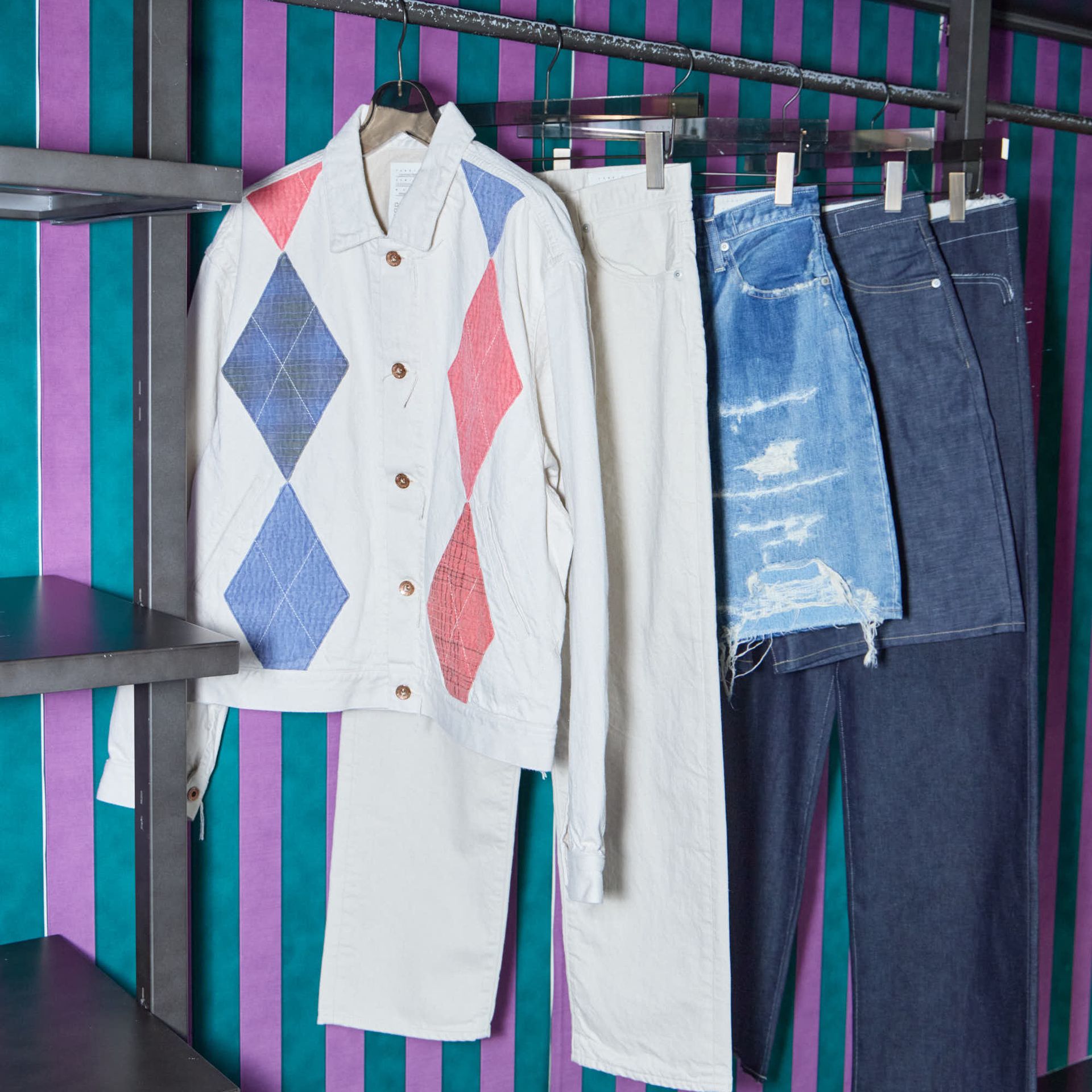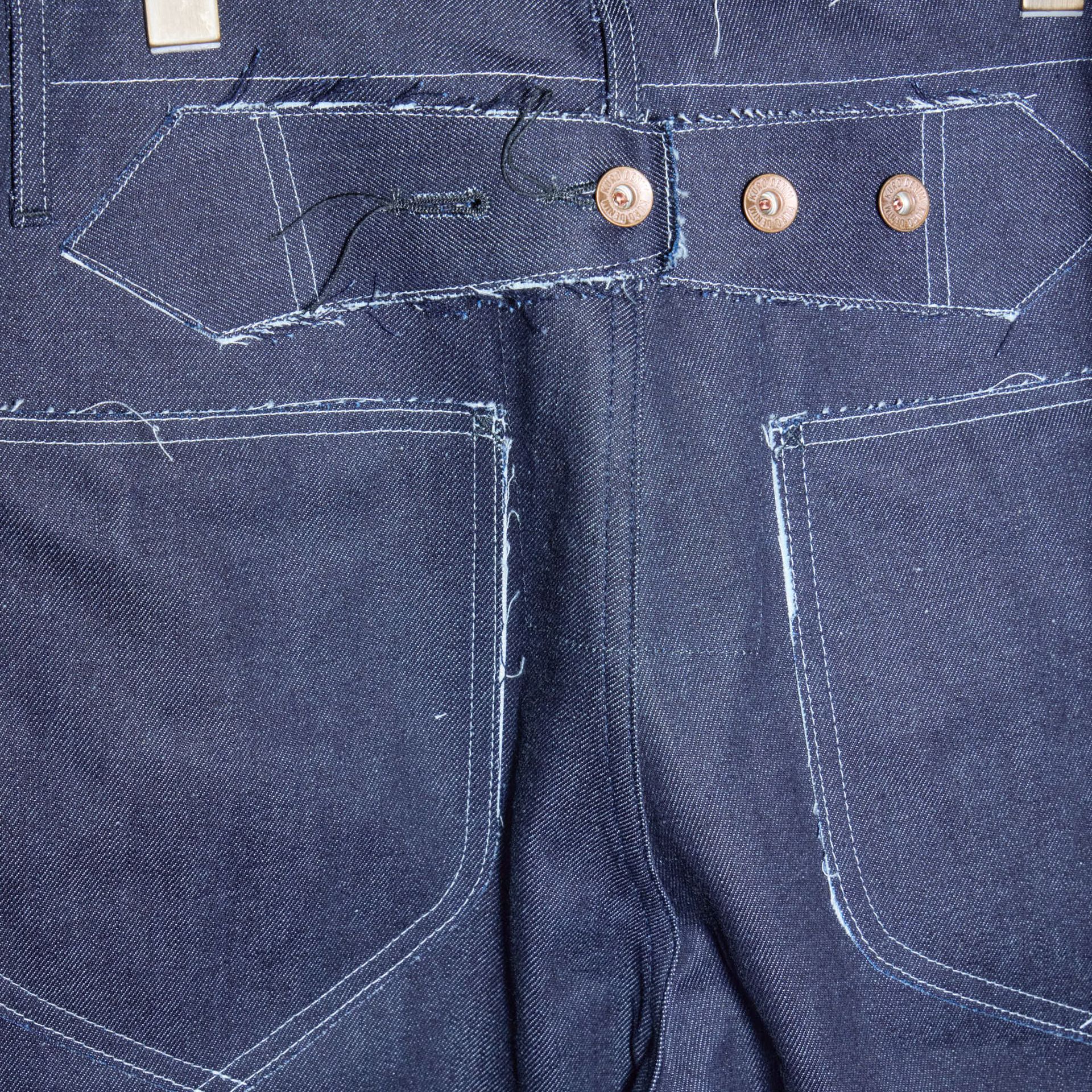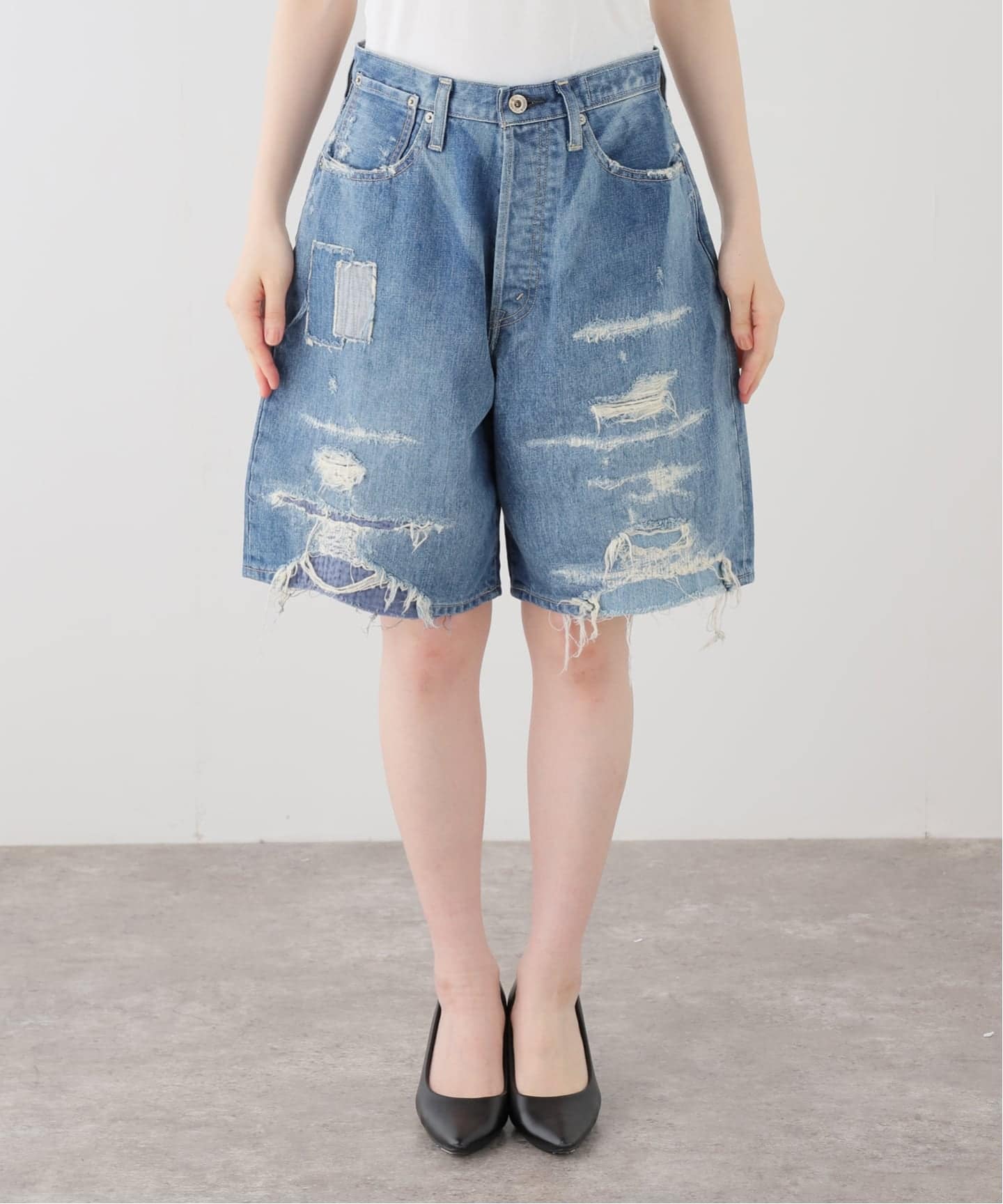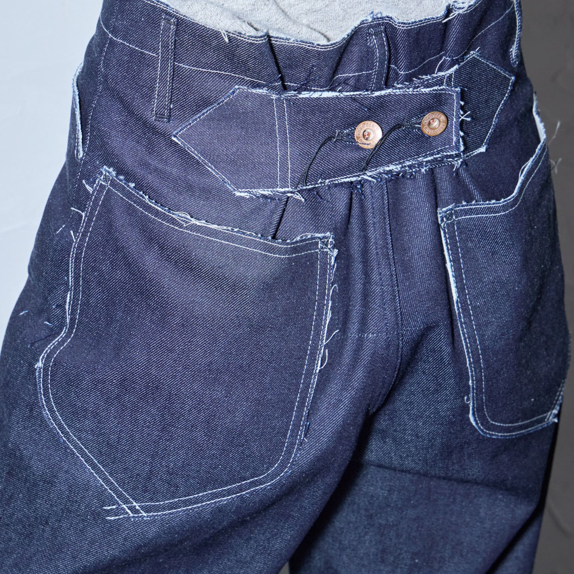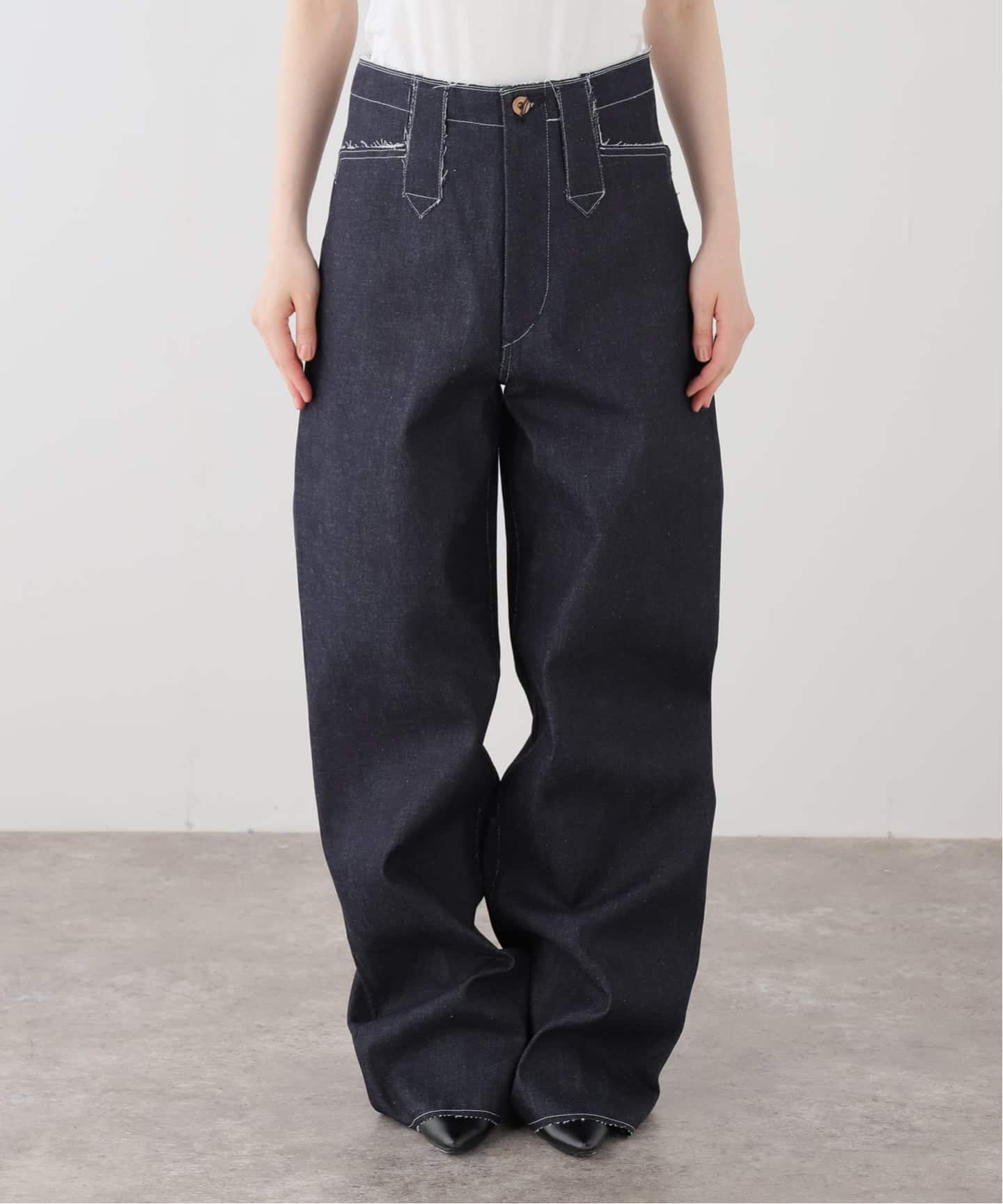 ダブルニー仕様に、切りっぱなしのニーパッチやロゴ入りリベットを施し、無骨なワークディテールに抜け感をプラスしています。