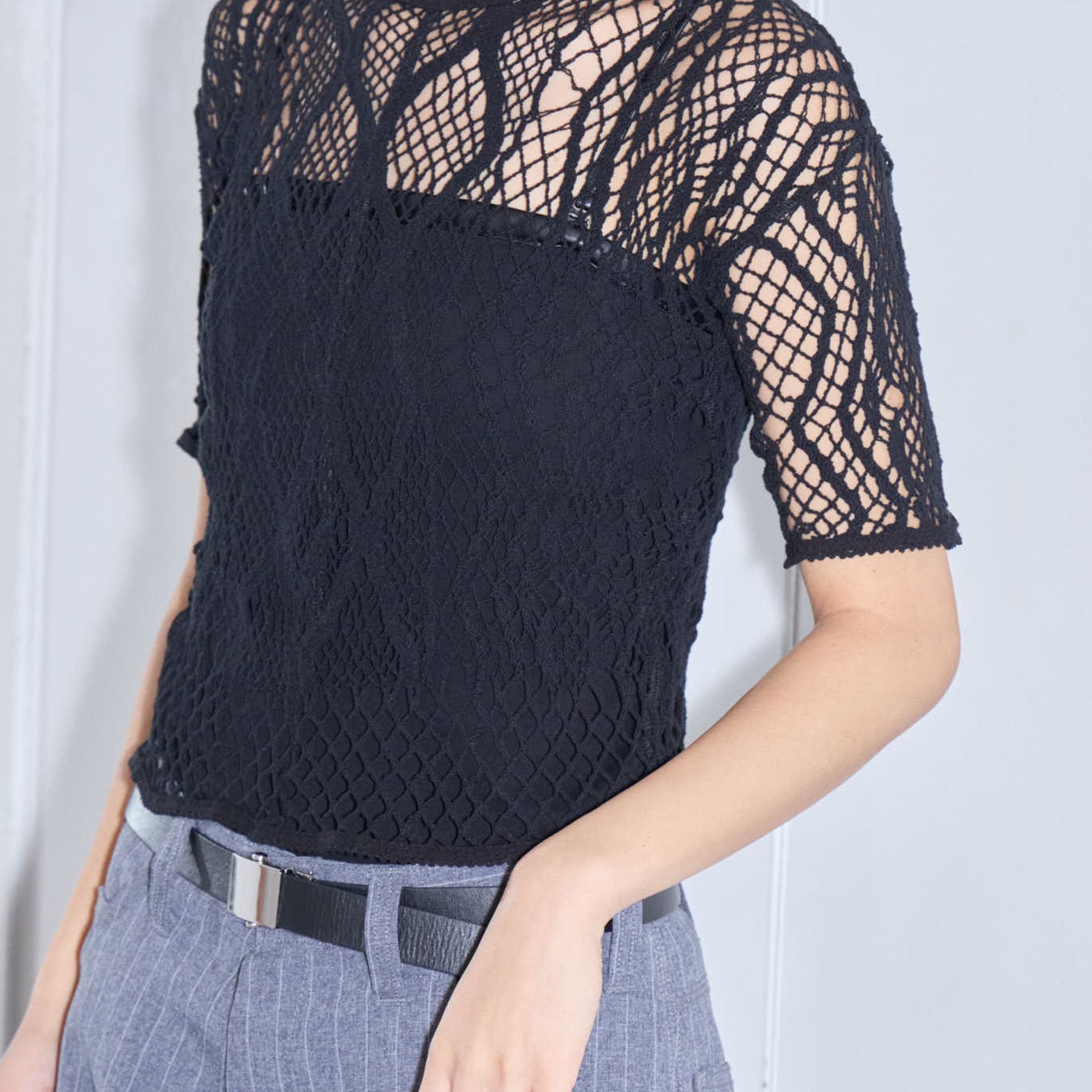 国内のトーションレースの産地である栃木県足利市にて作成した、オリジナル柄のストレッチレースの半袖カットソーです。非常に伸縮性があるためどのような体系の方でも着やすいです。